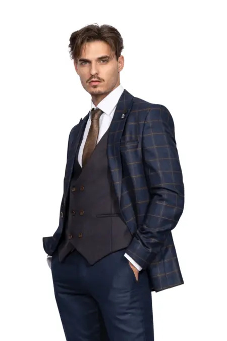 Κοστούμι Ανδρικό Καρό Μπλε – Καφέ Με Καφέ Γιλέκο 161