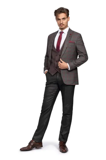 Κοστούμι Ανδρικό Γκρι – Κόκκινο Καρό Με Κεραμιδί Γιλέκο 156