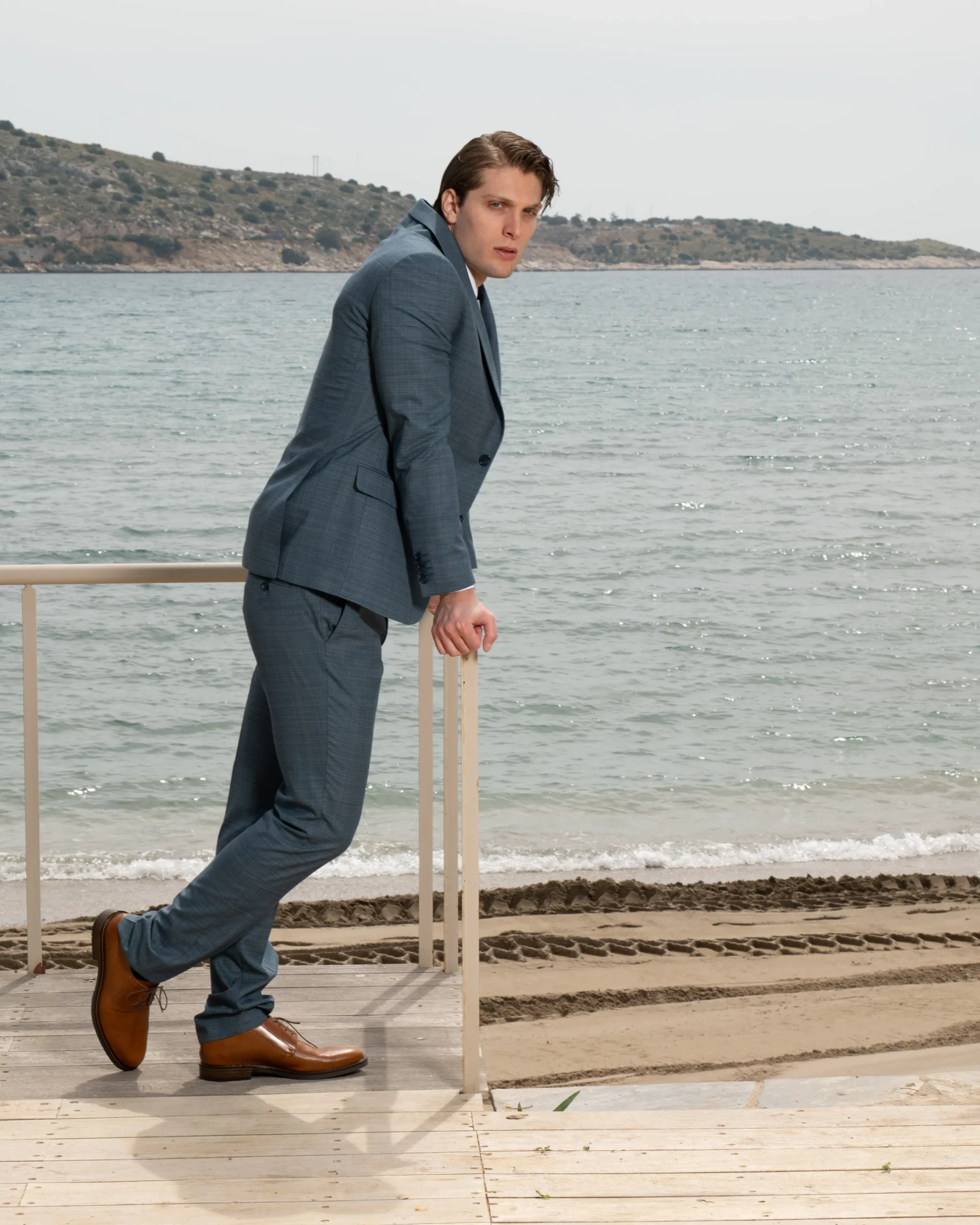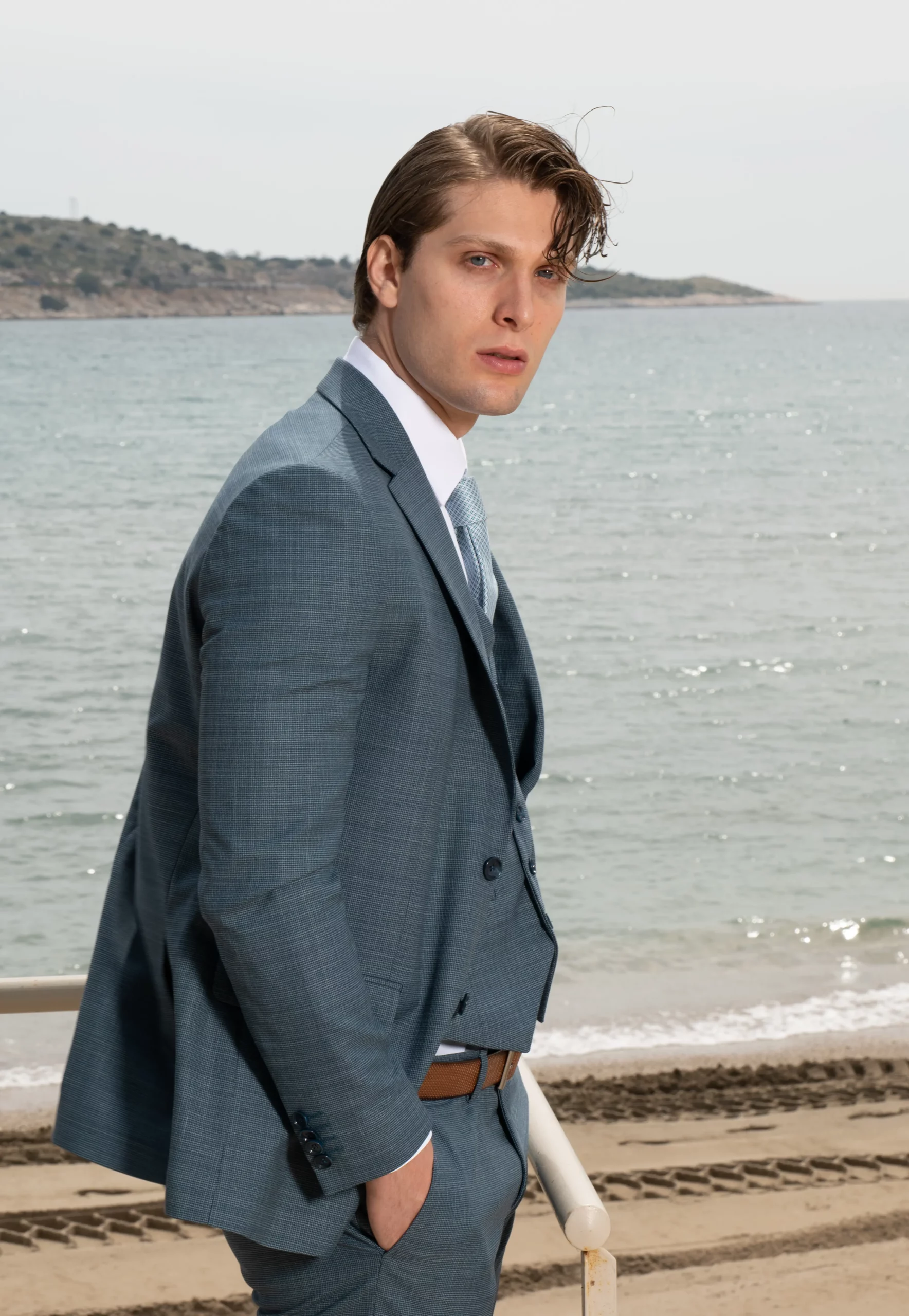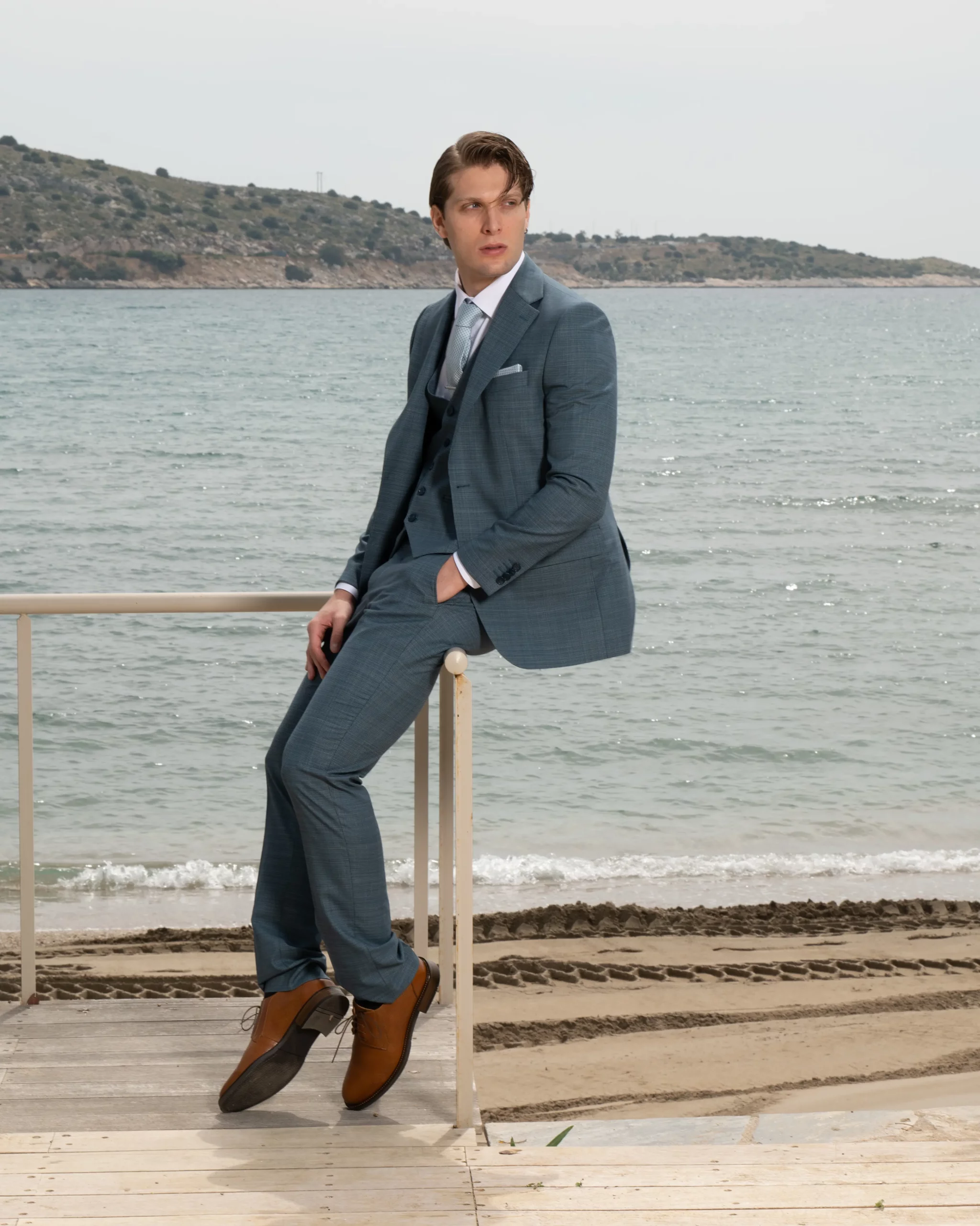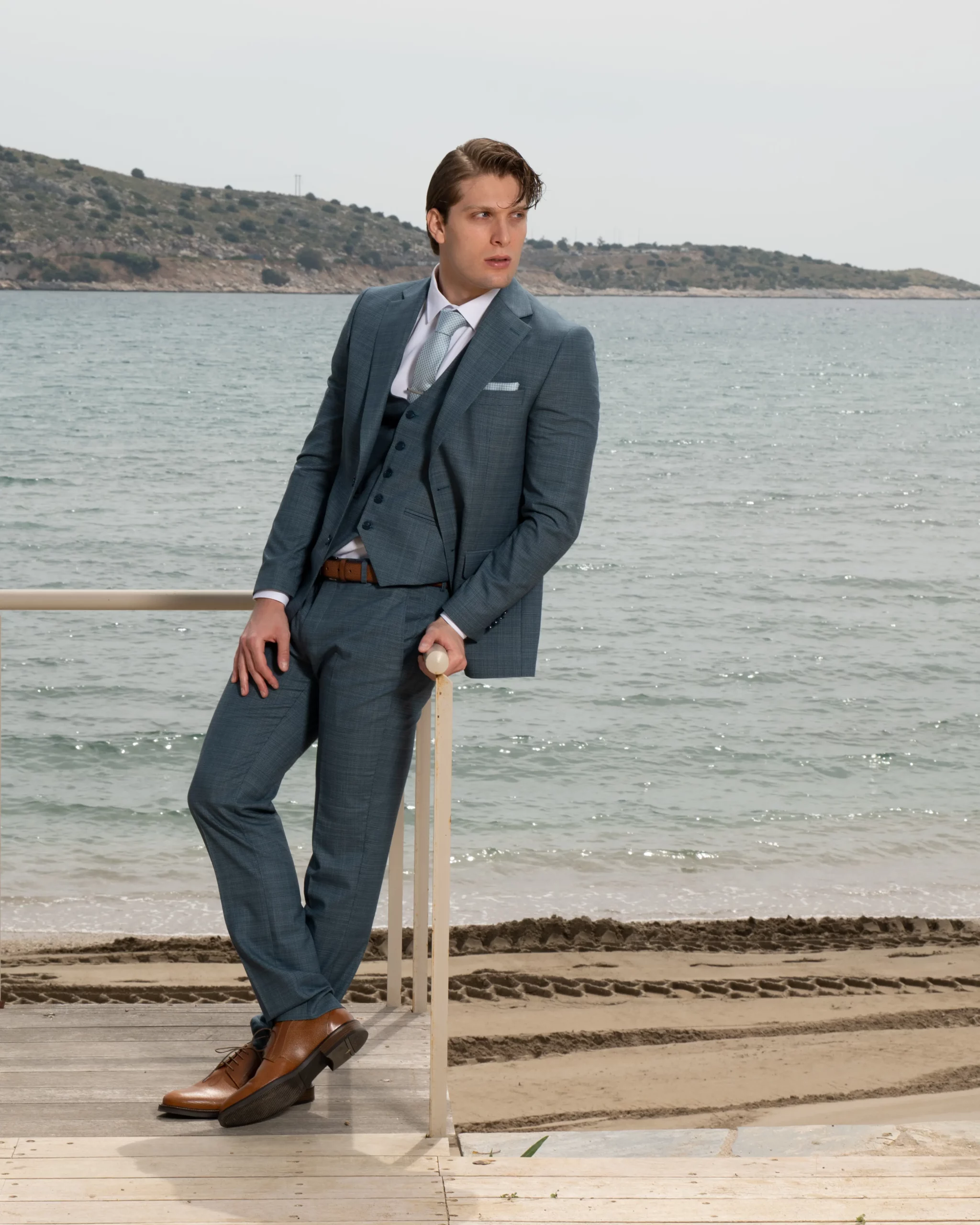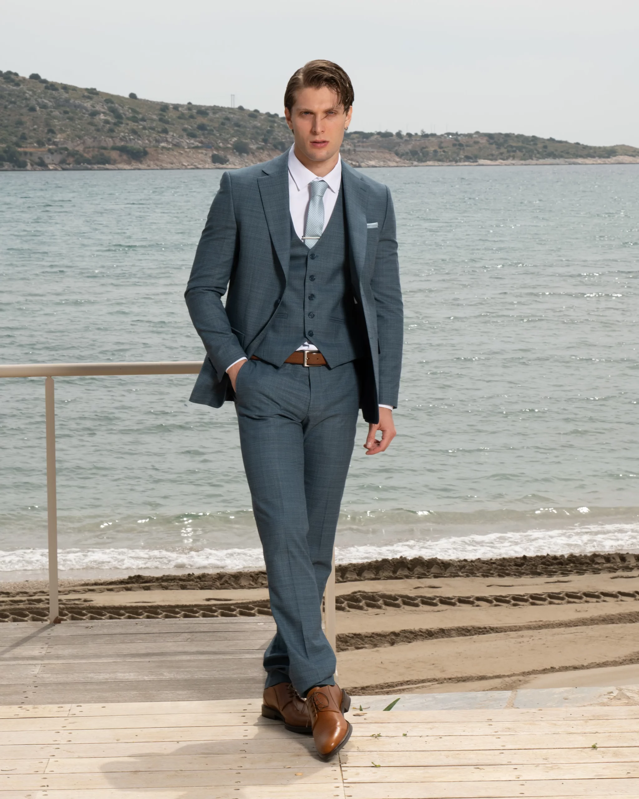 Εξαιρετικής ποιότητας δίκουμπο ανδρικό κοστούμι Tessuti σε σιέλ χρώμα της συλλογής μας SS24.