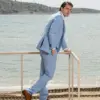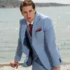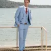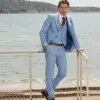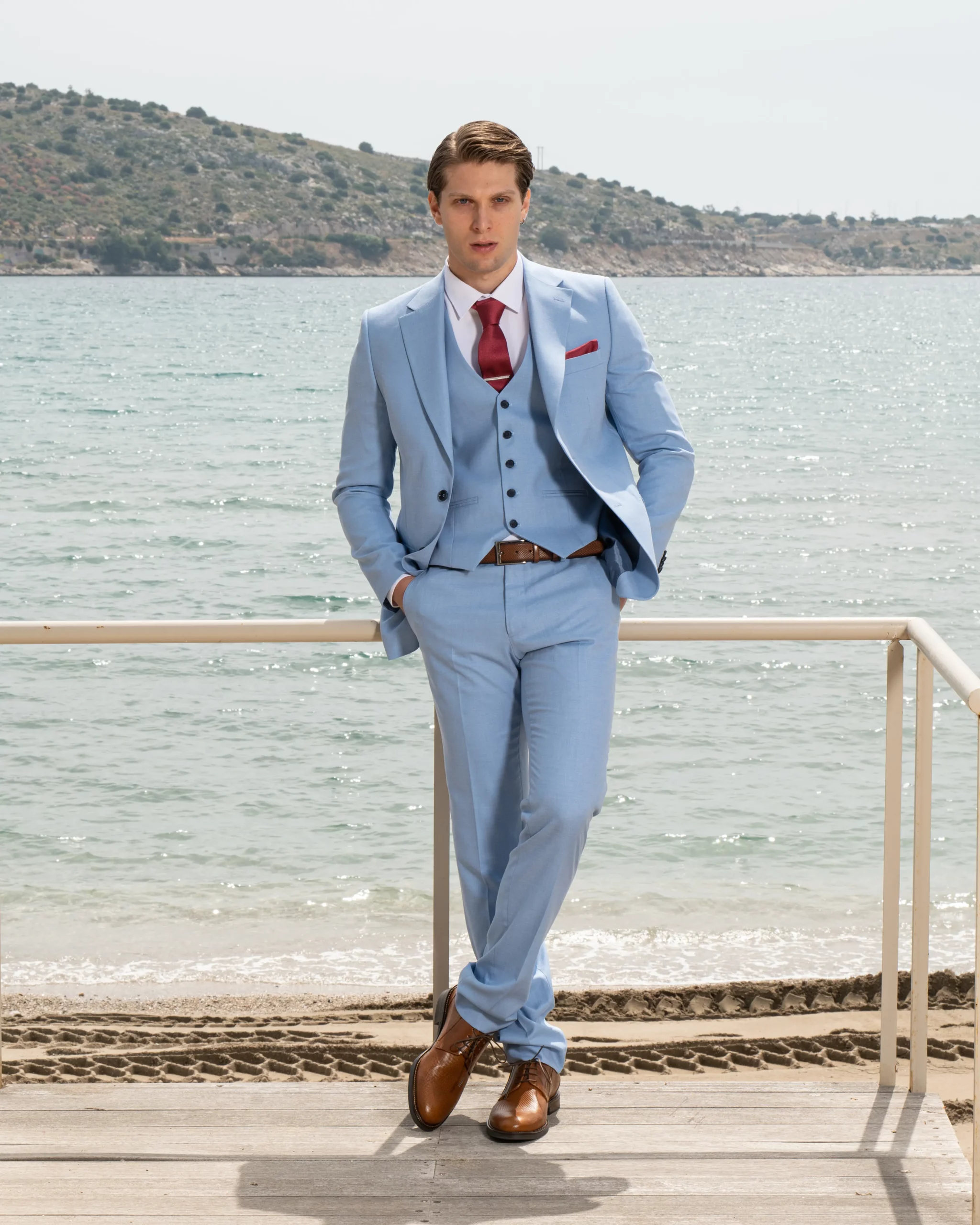 Το σιέλ σακάκι και παντελόνι αποτελεί ένα δροσερό συνδυασμό απαραίτητο για τη θερινή περίοδο, ενώ η slim fit γραμμή αγκαλιάζει το σώμα, κολακεύοντας τον κάτοχο.
