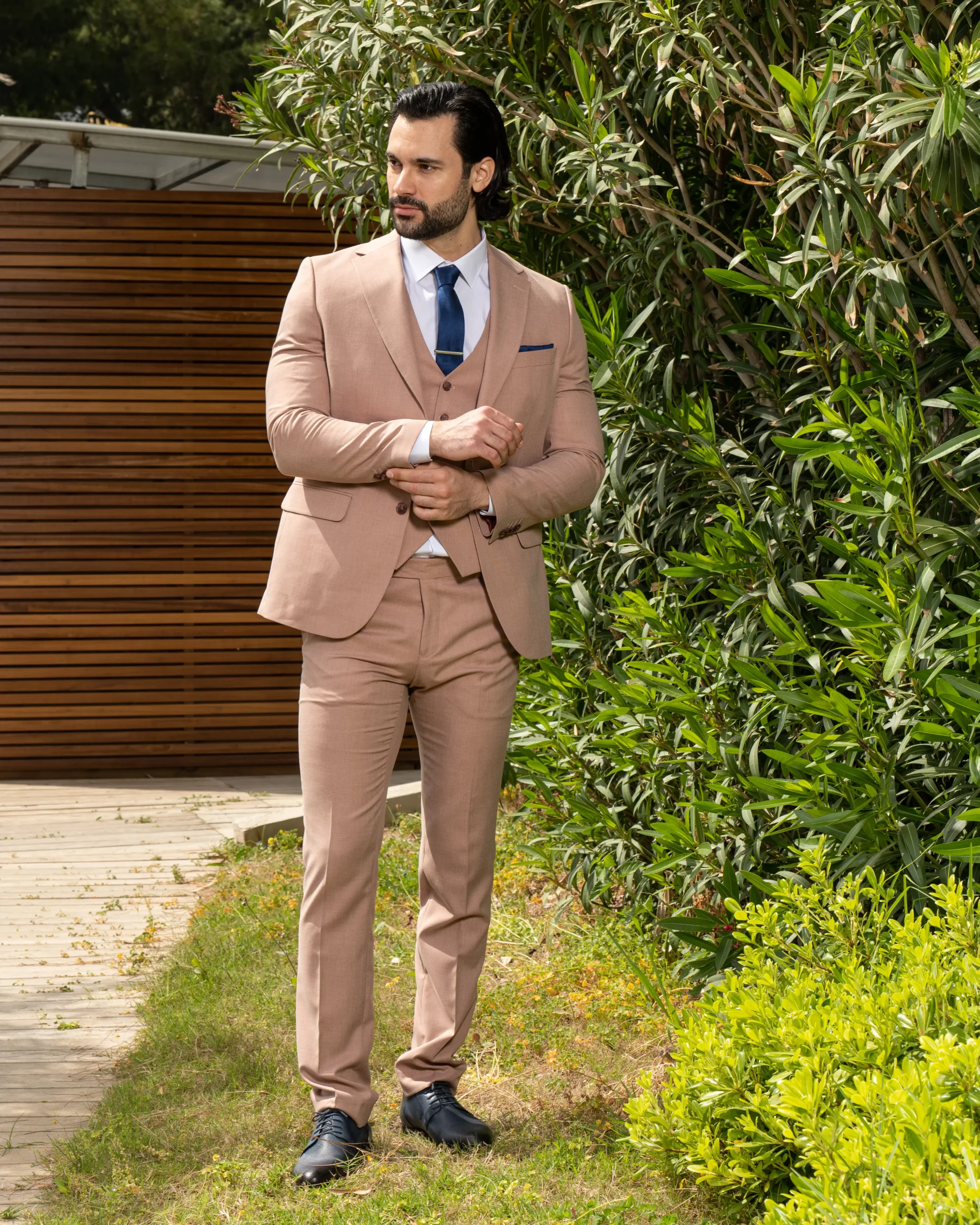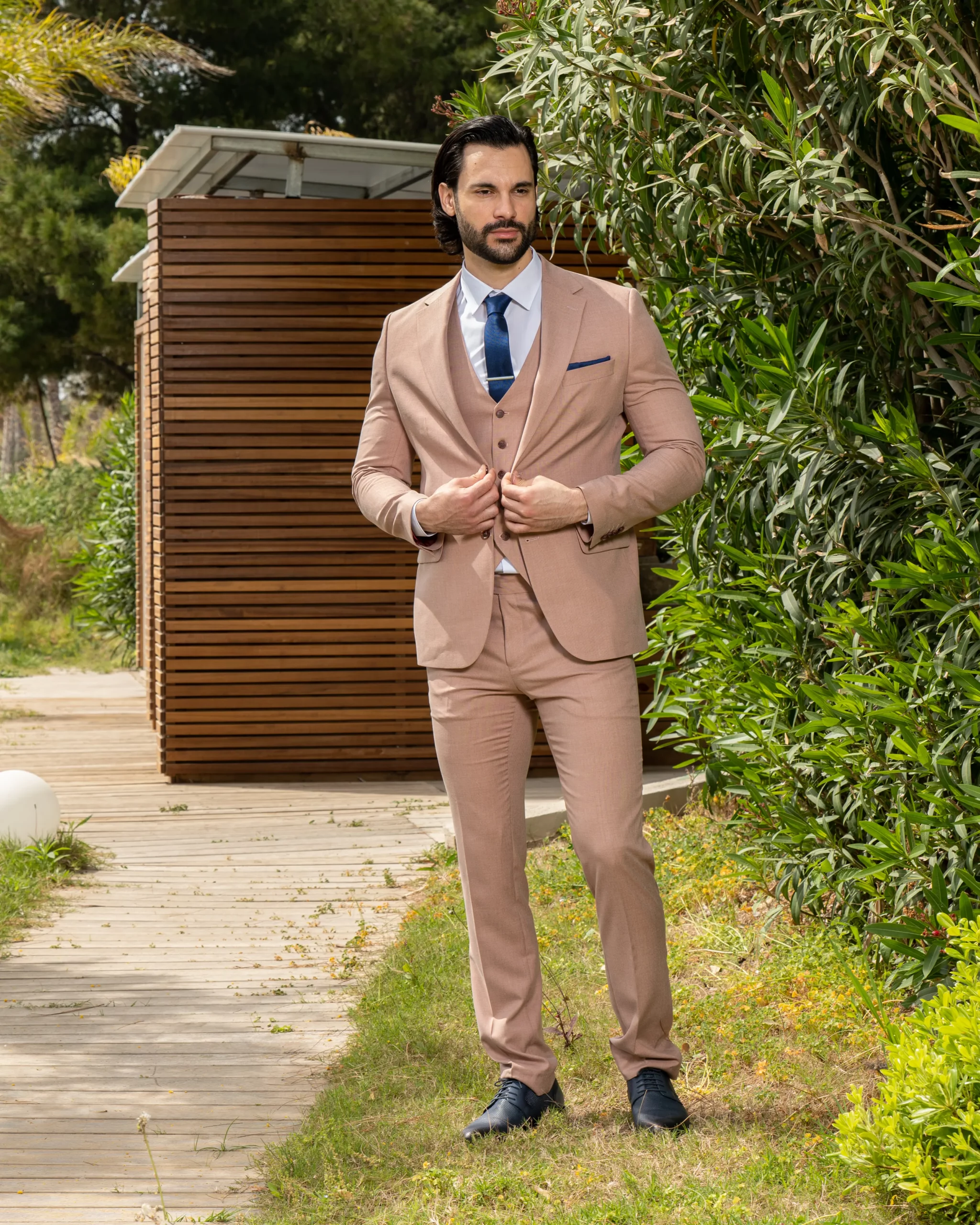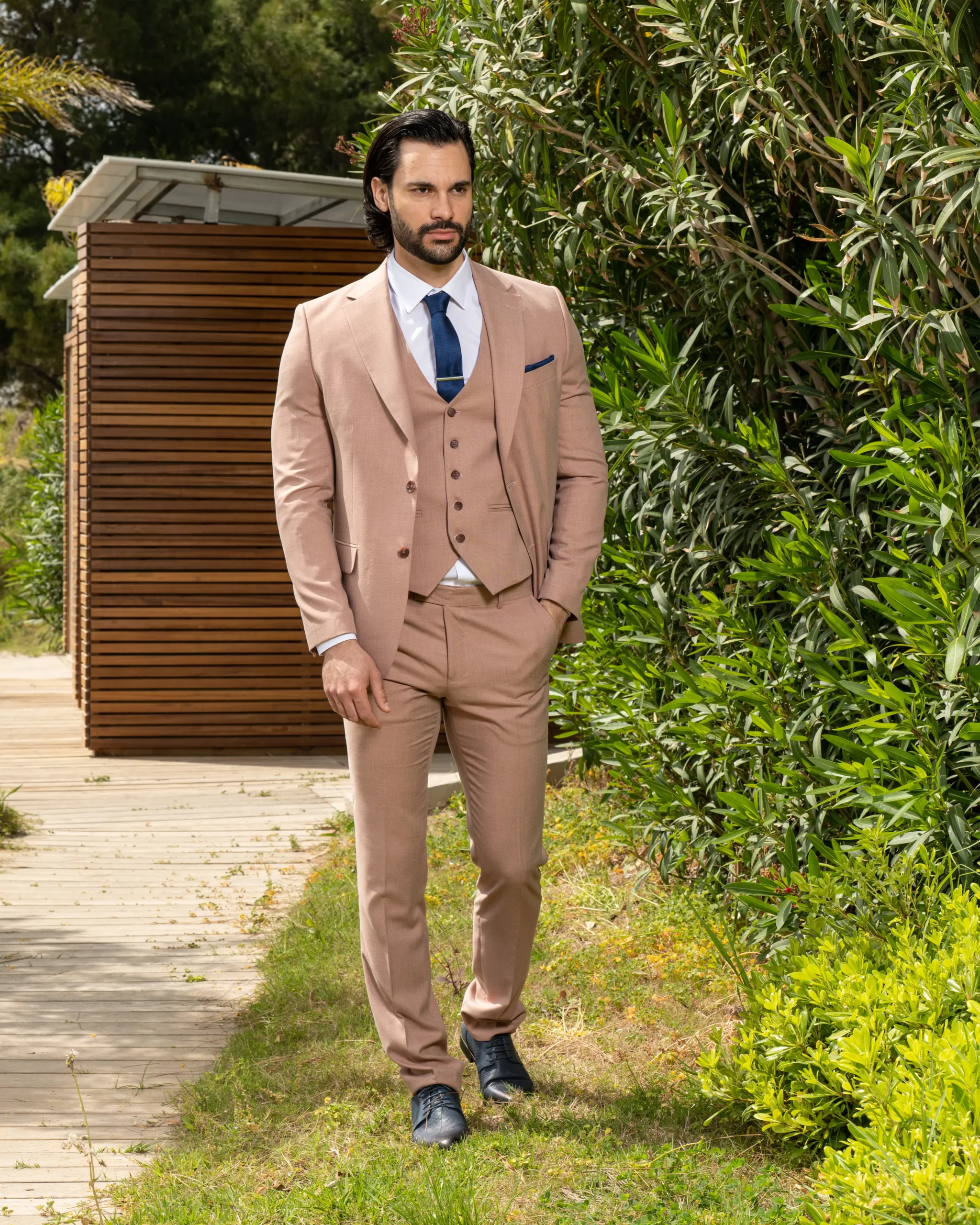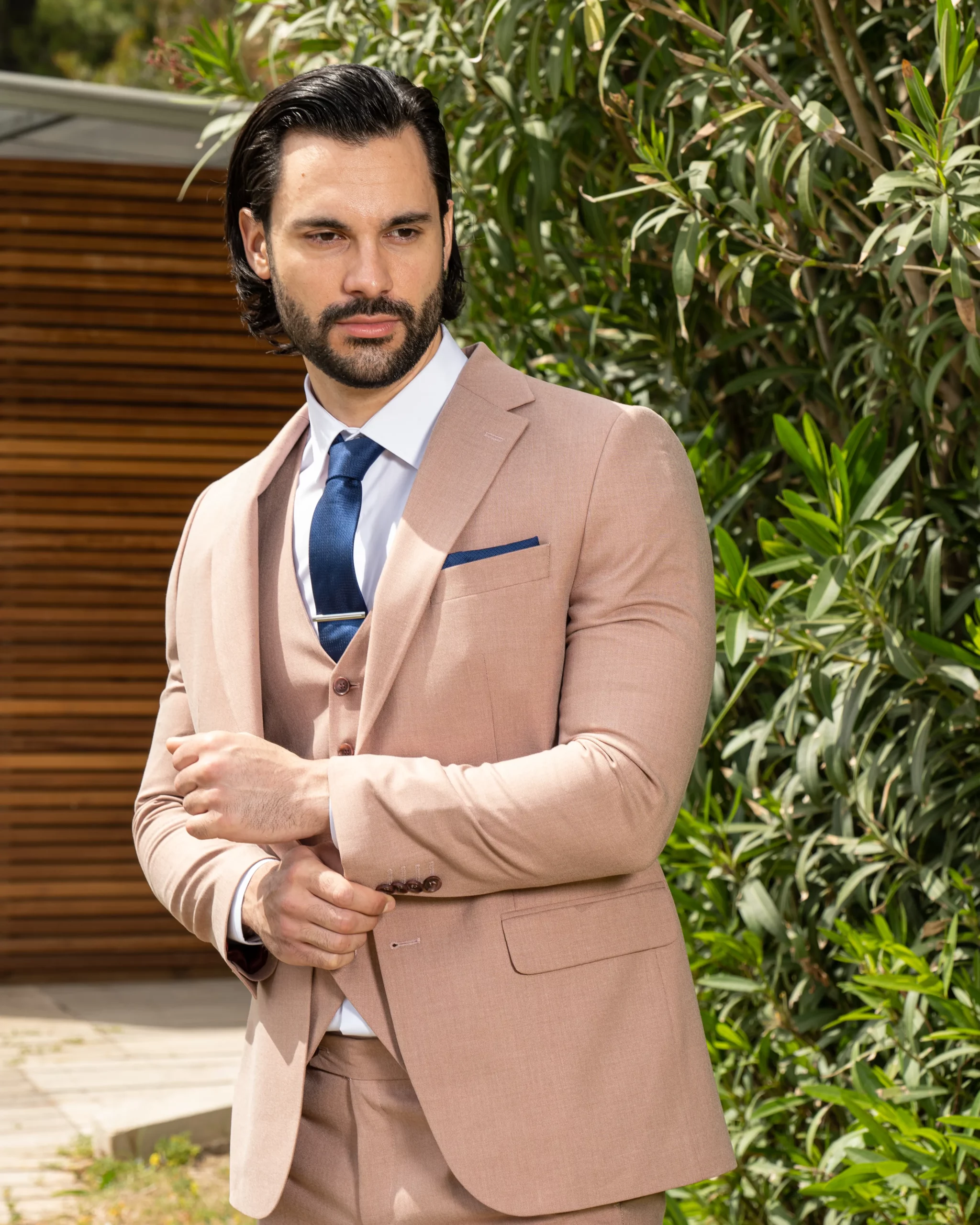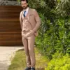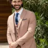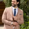 Το μπεζ σακάκι και παντελόνι αποτελεί ένα κλασικό συνδυασμό που δεν έχει απογοητεύσει ποτέ, ενώ η slim fit γραμμή του αγκαλιάζει το σώμα και κολακεύει τον κάτοχο.