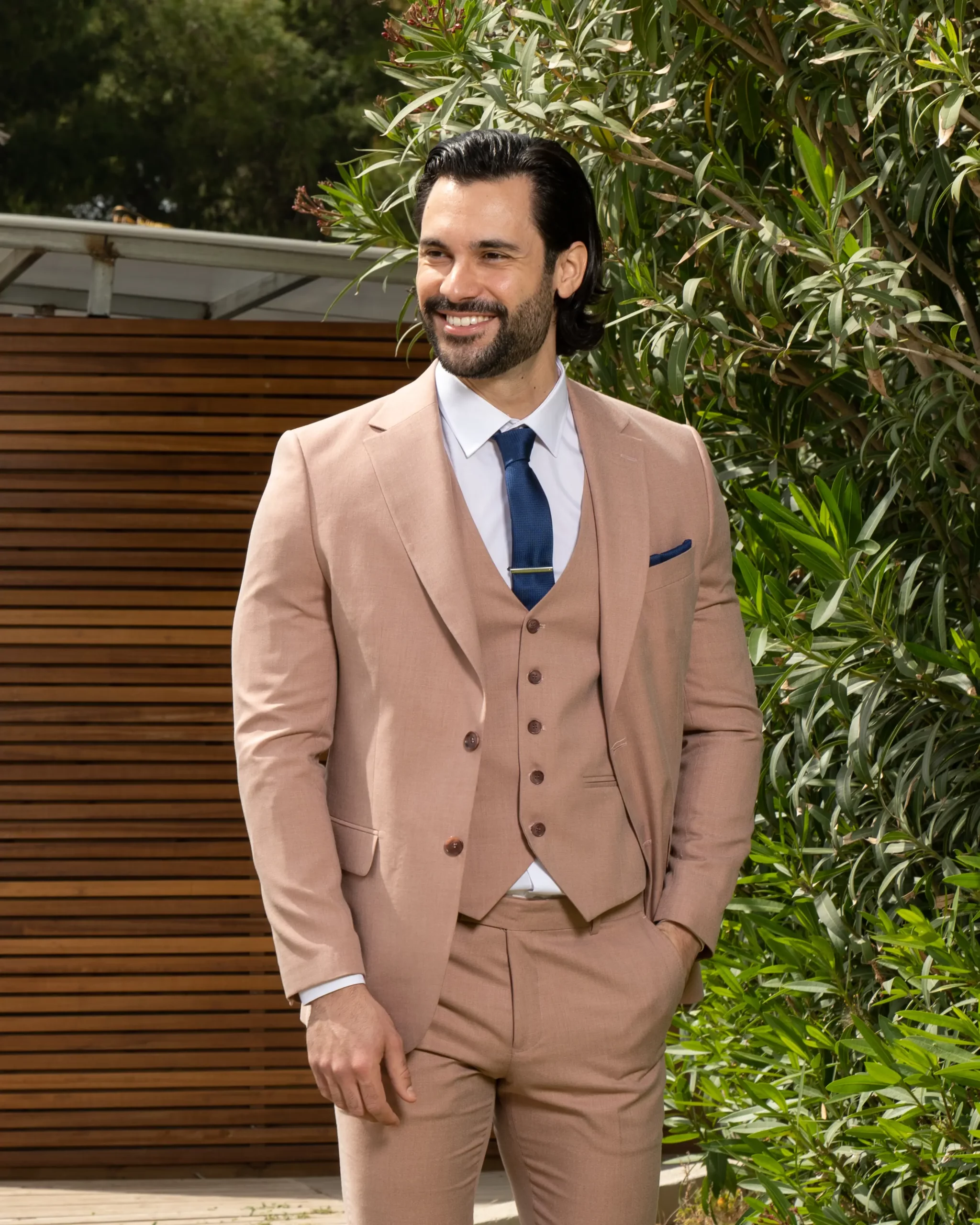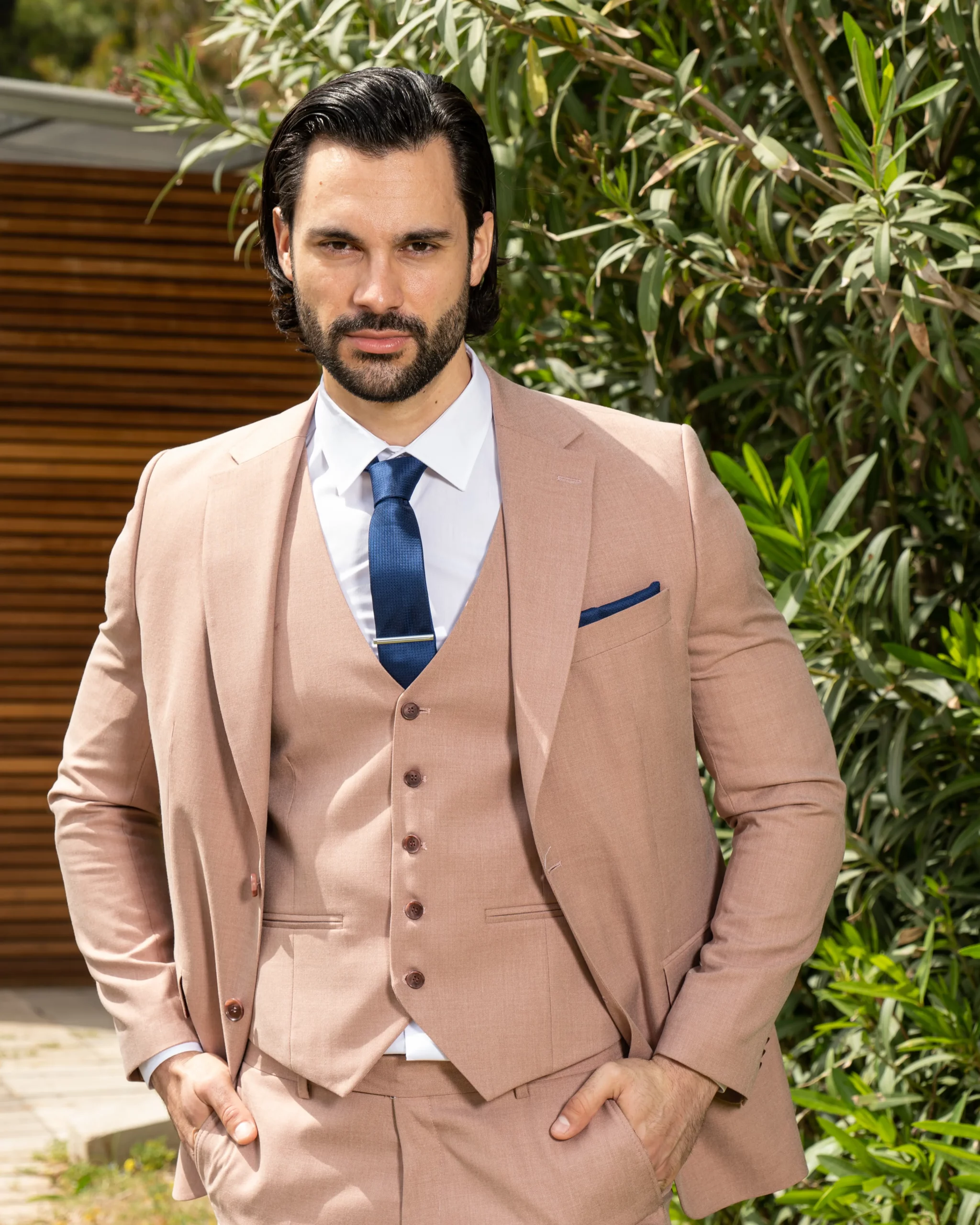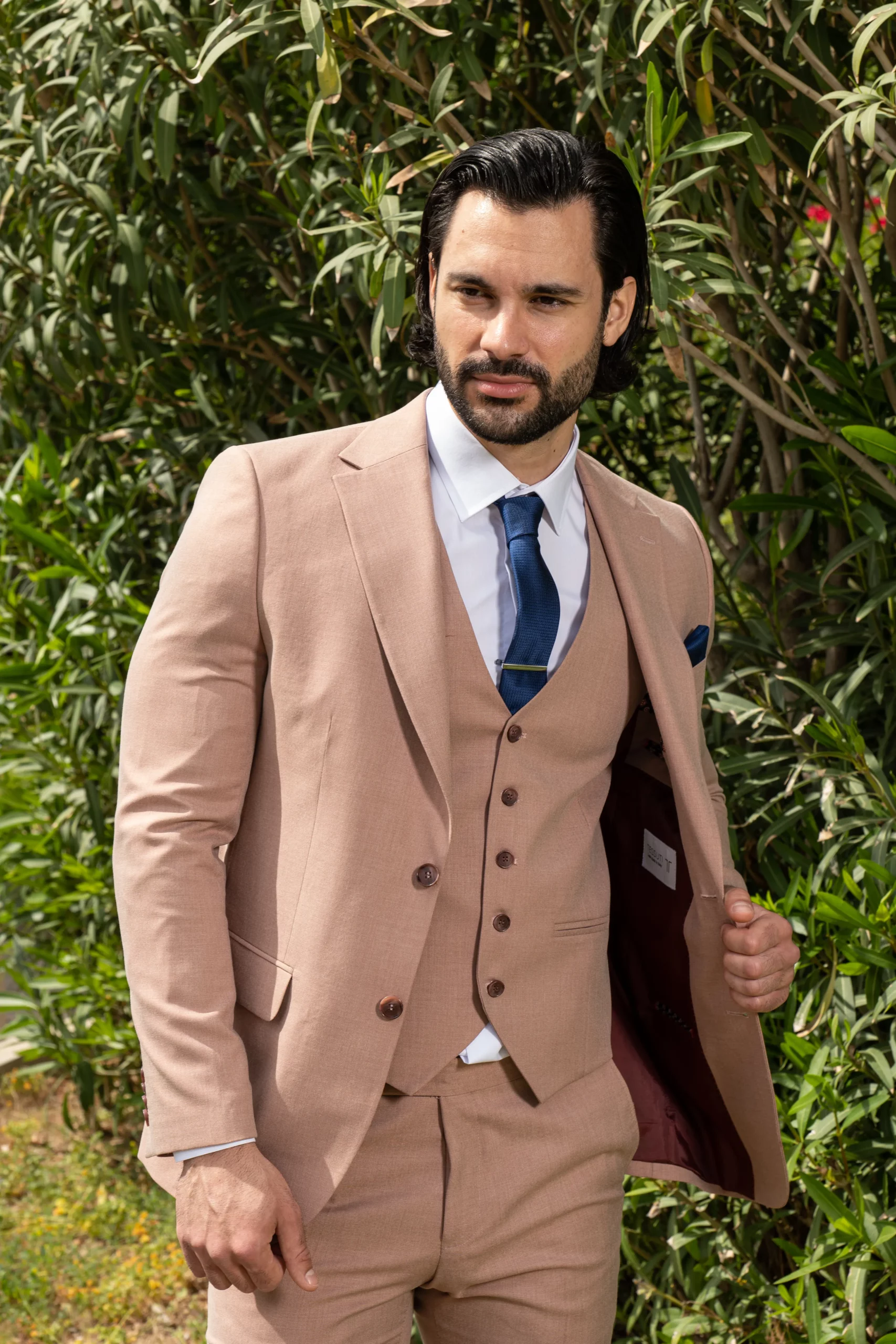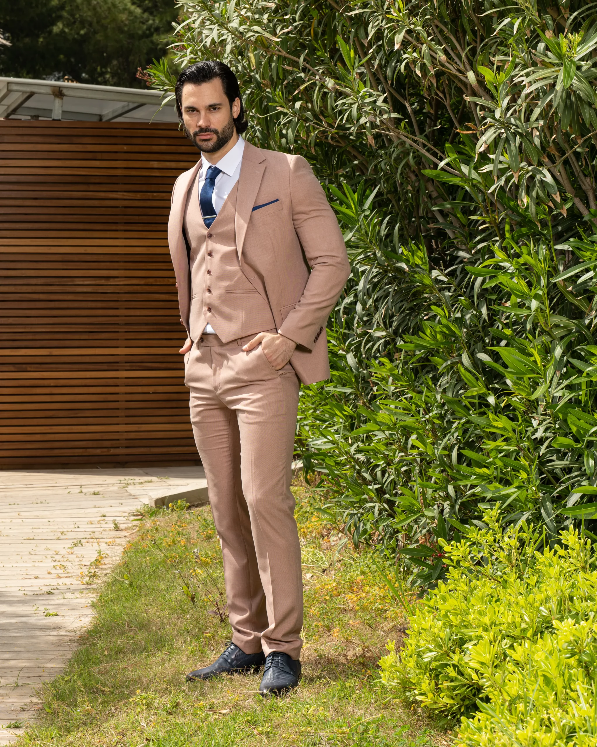 Το μπεζ σακάκι και παντελόνι αποτελεί ένα κλασικό συνδυασμό που δεν έχει απογοητεύσει ποτέ, ενώ η slim fit γραμμή του αγκαλιάζει το σώμα και κολακεύει τον κάτοχο.