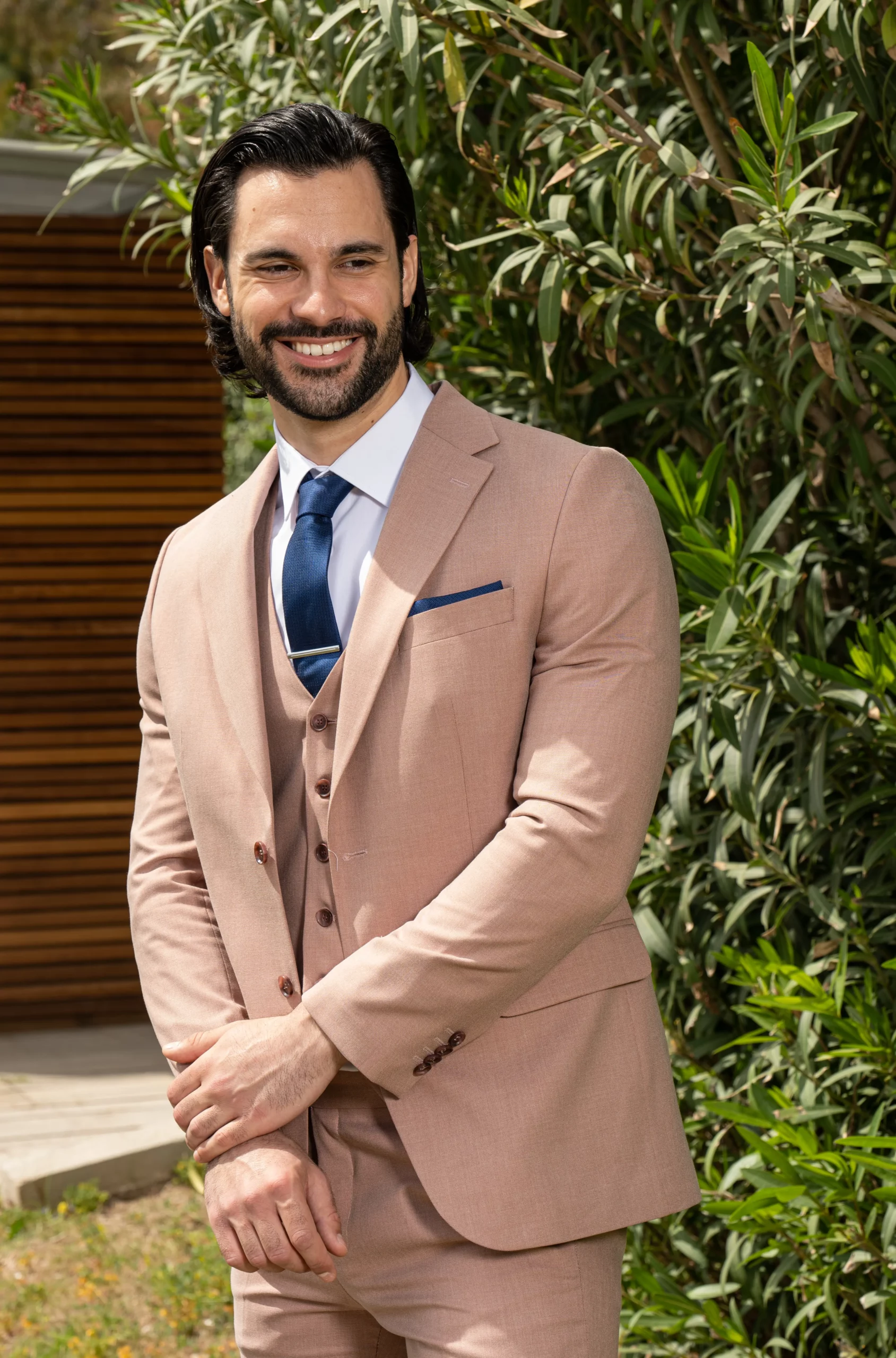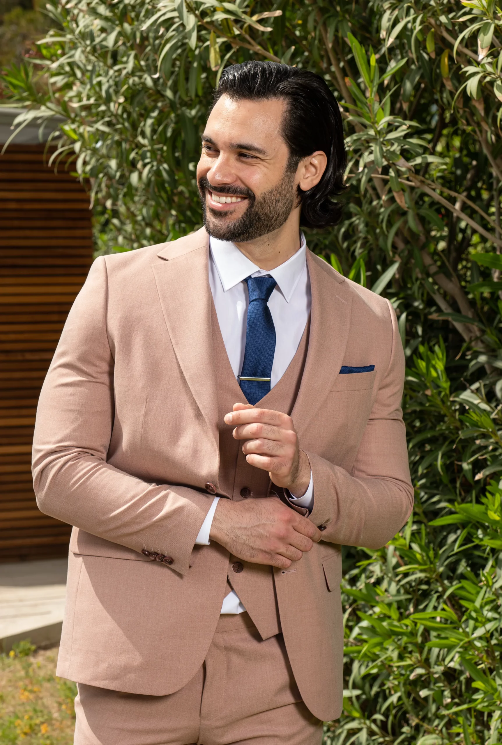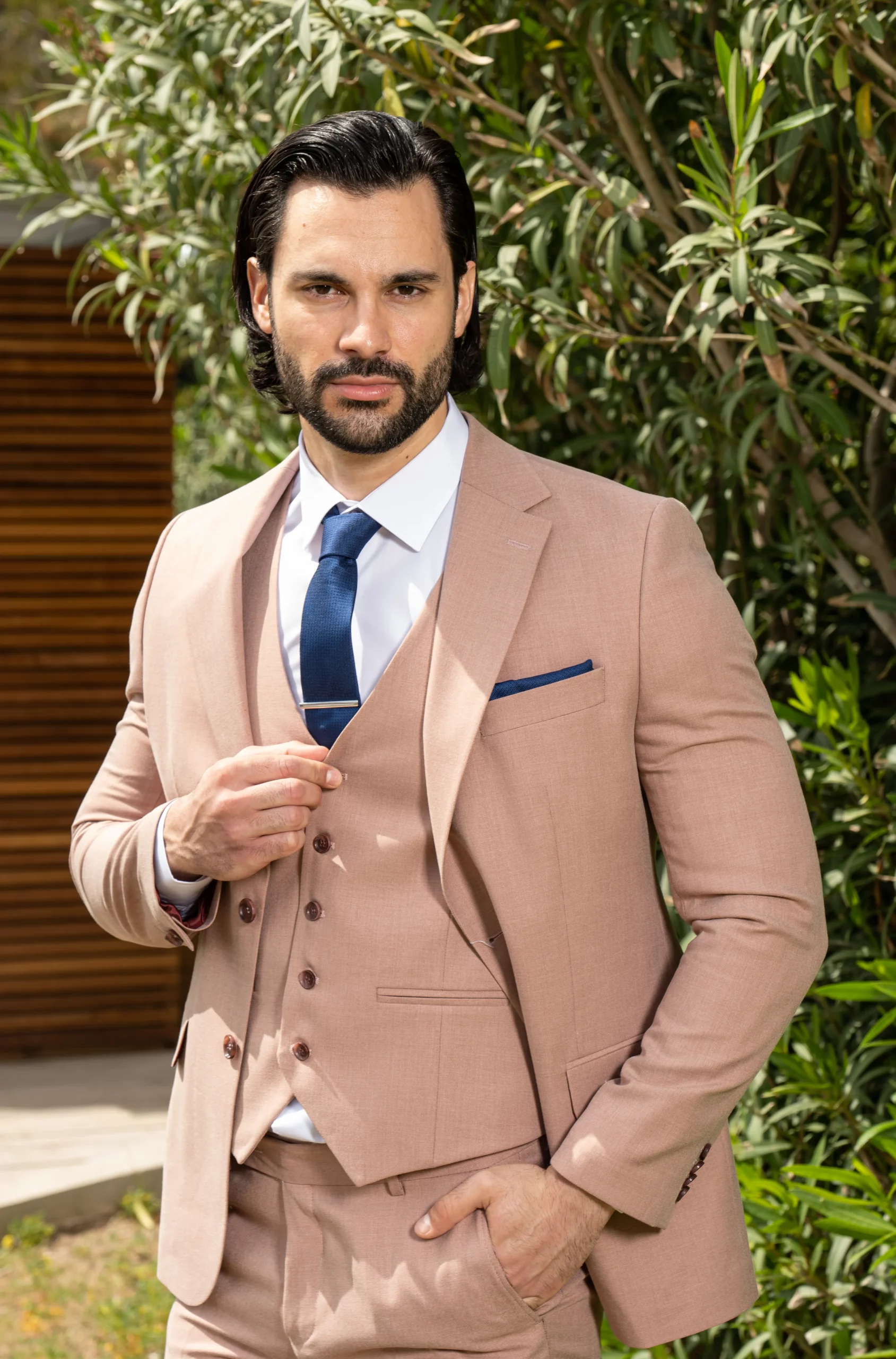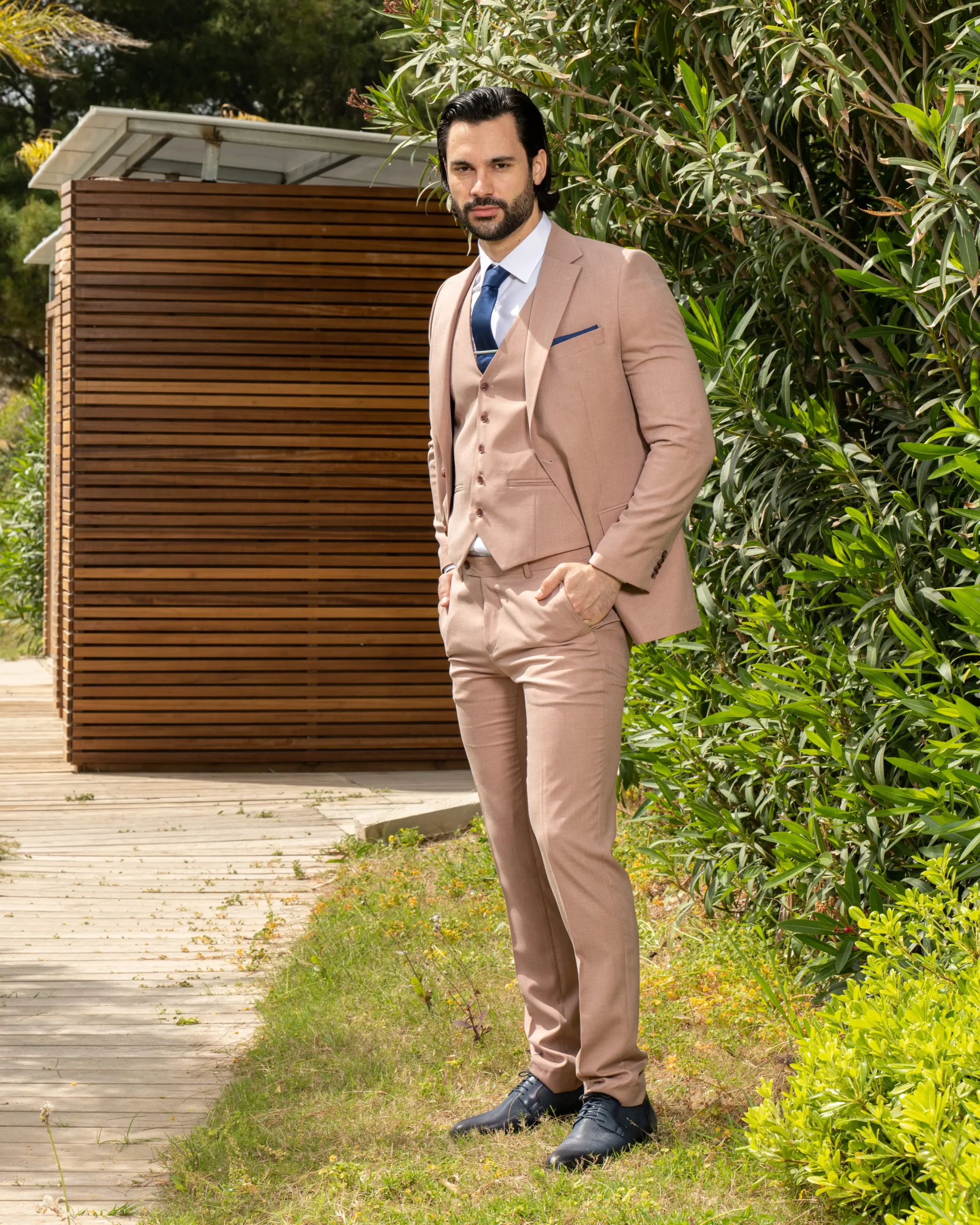 Το μπεζ σακάκι και παντελόνι αποτελεί ένα κλασικό συνδυασμό που δεν έχει απογοητεύσει ποτέ, ενώ η slim fit γραμμή του αγκαλιάζει το σώμα και κολακεύει τον κάτοχο.