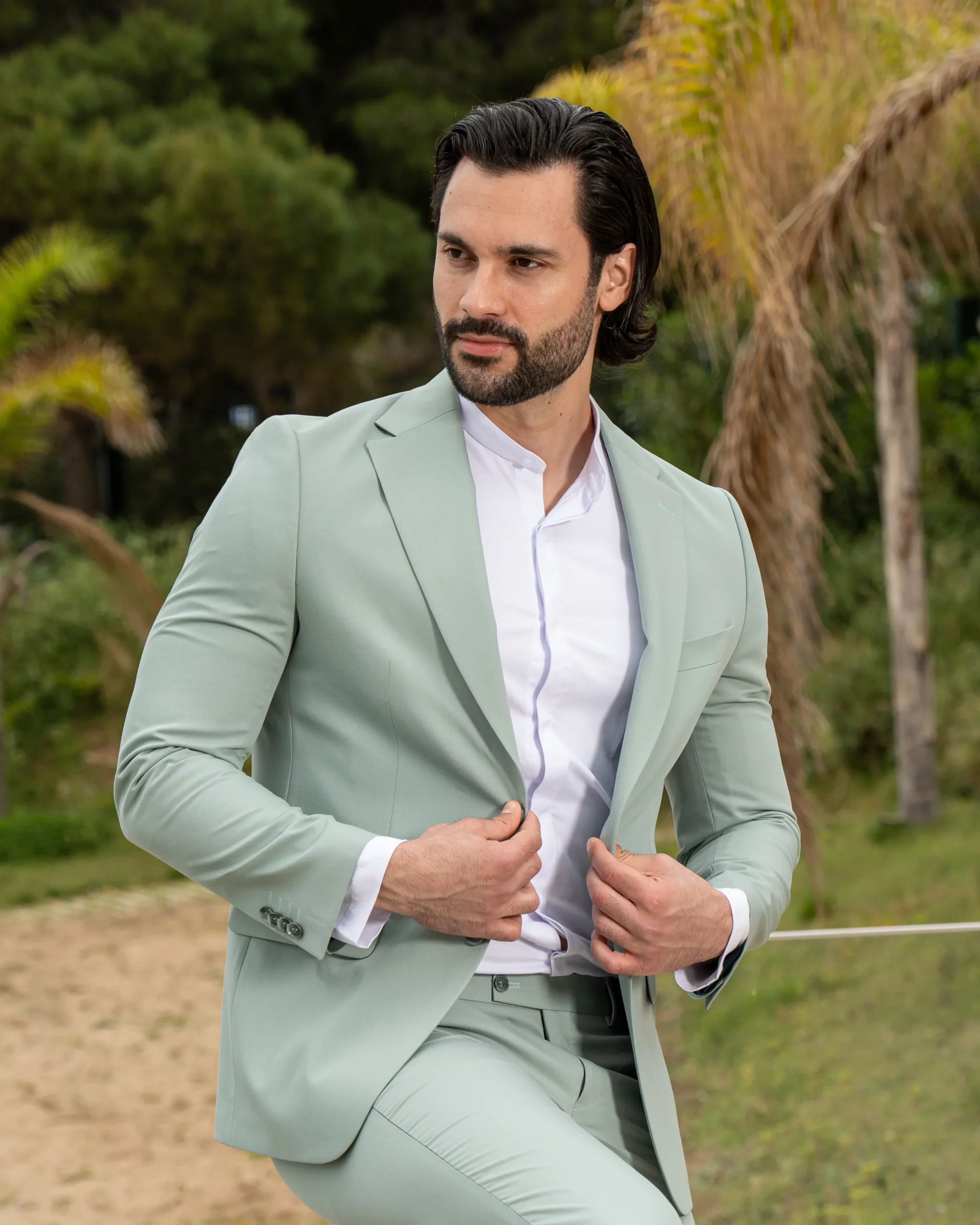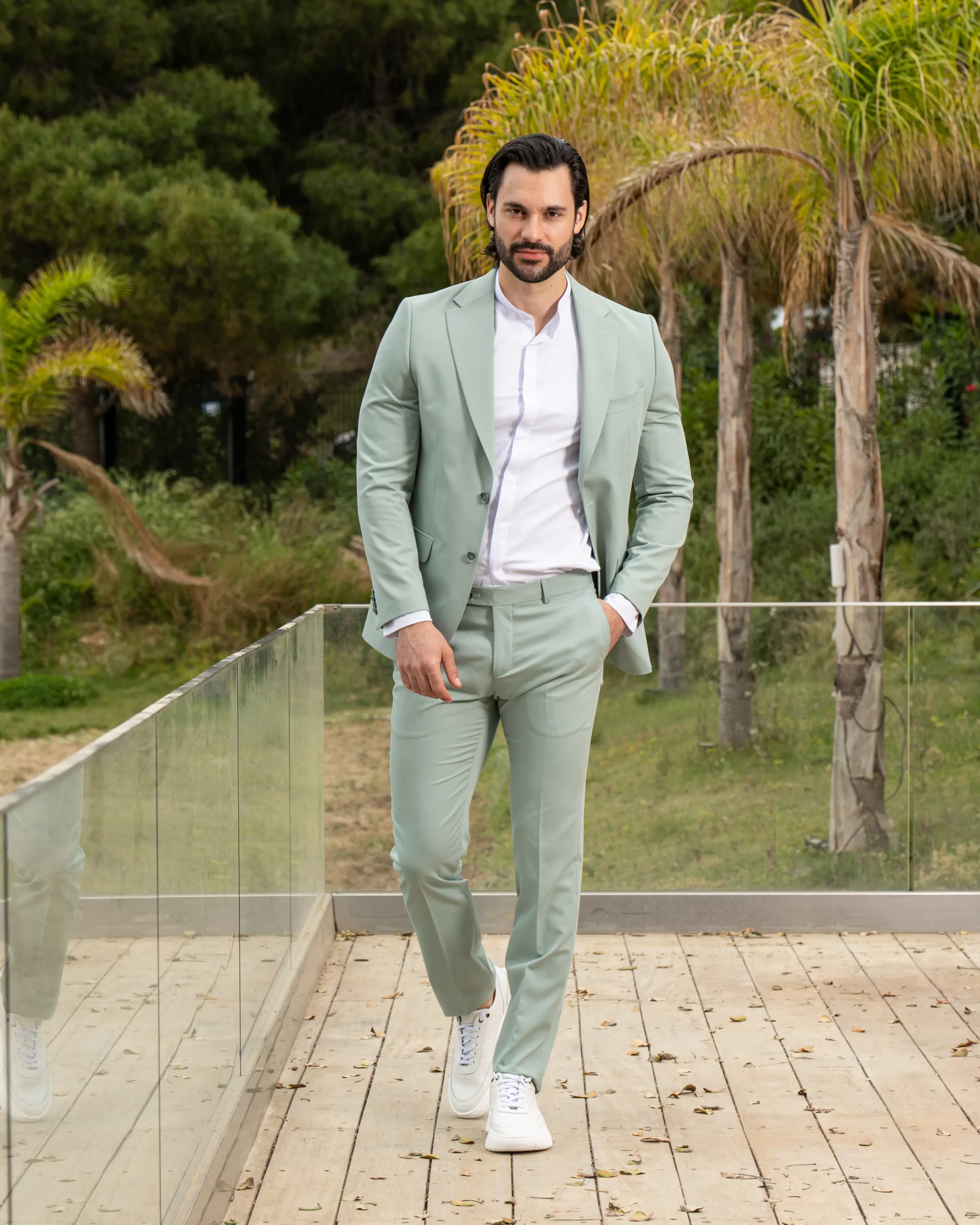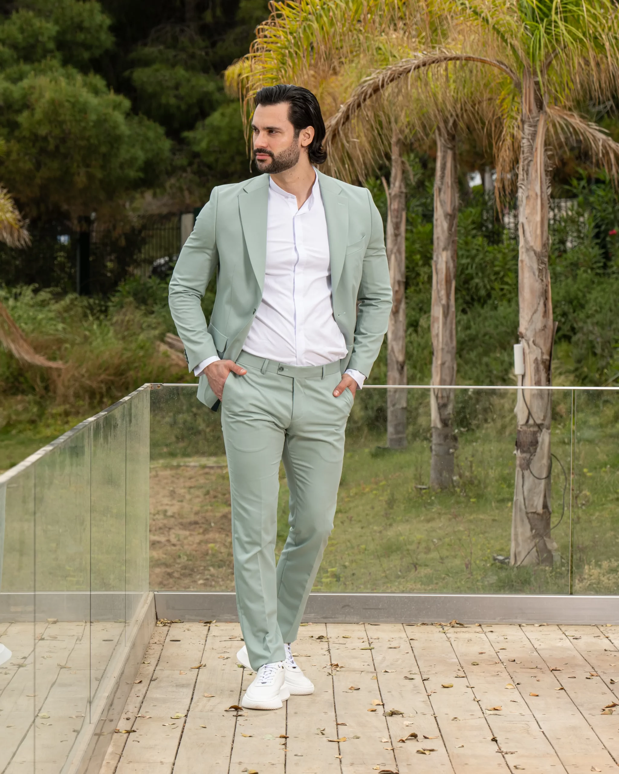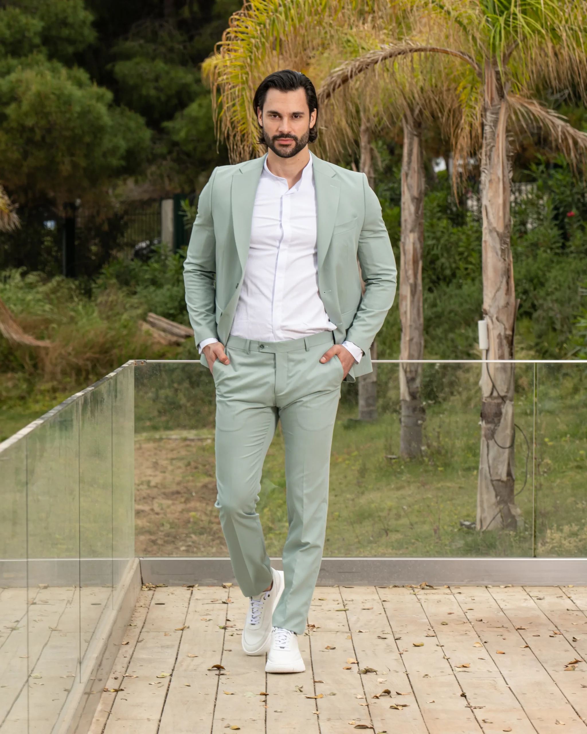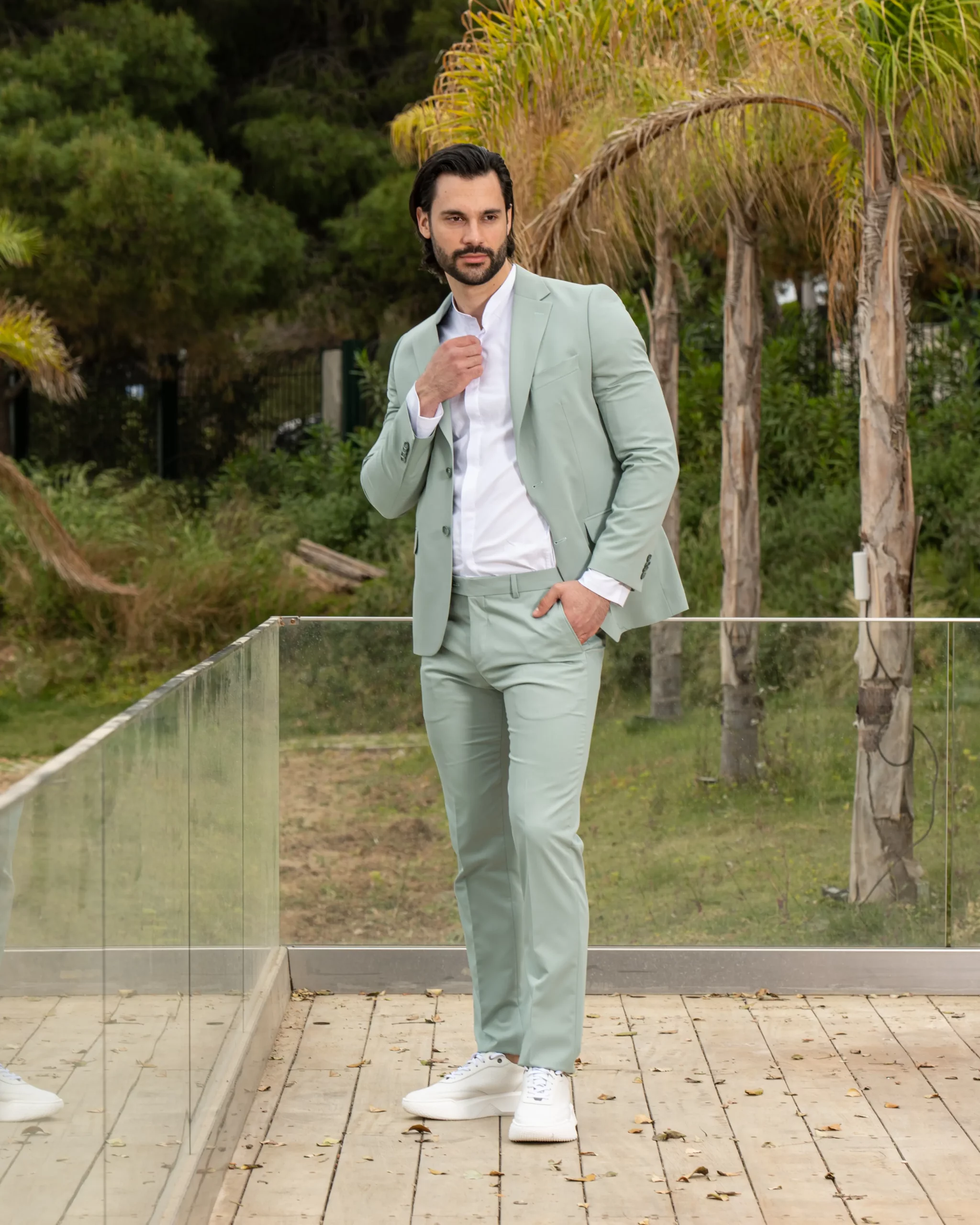 Το χρώμα της μέντας δίνει ένα δροσερό τόνο στο σακάκι και παντελόνι, ενώ η slim fit γραμμή του αγκαλιάζει το σώμα και κολακεύει τον κάτοχο.
