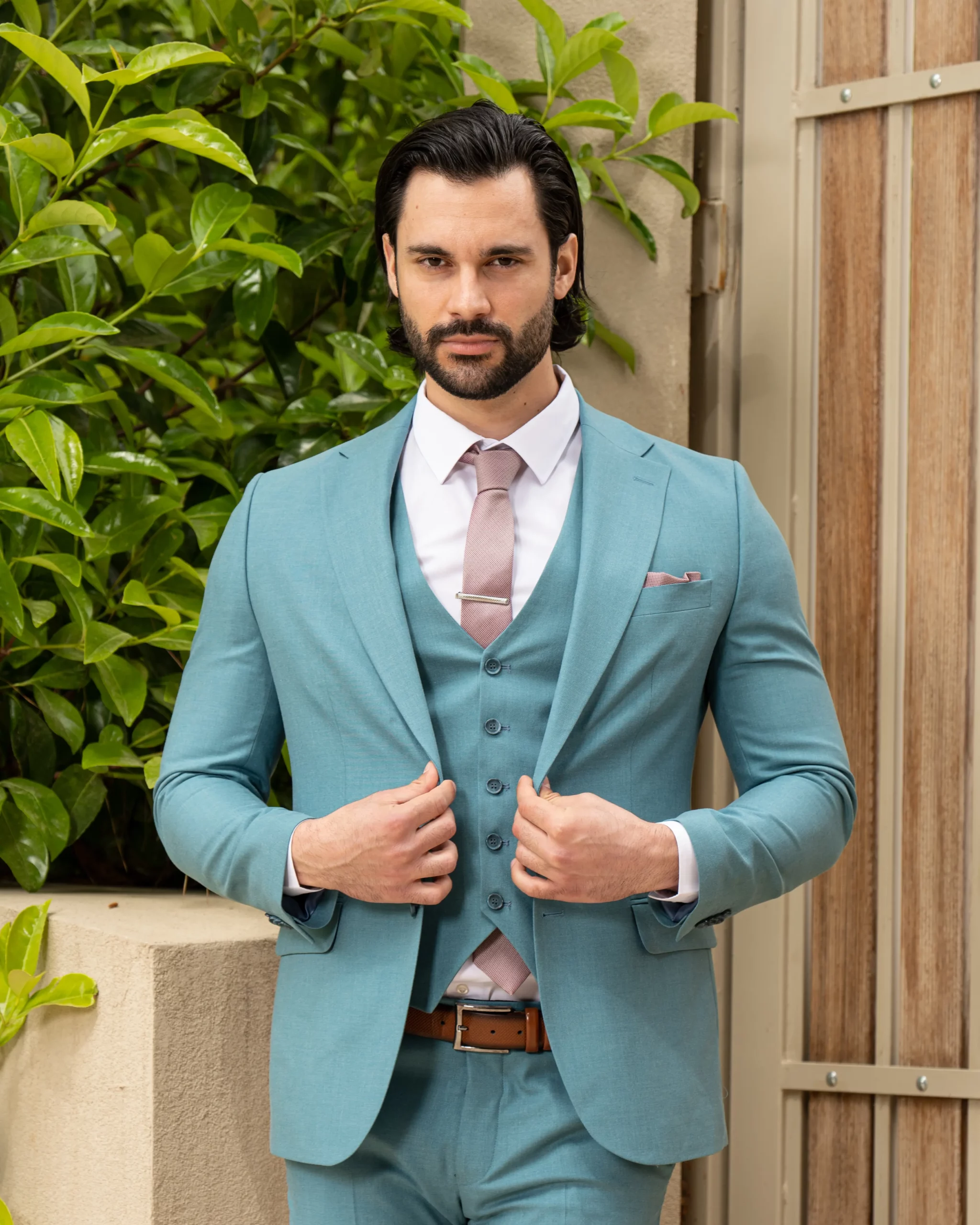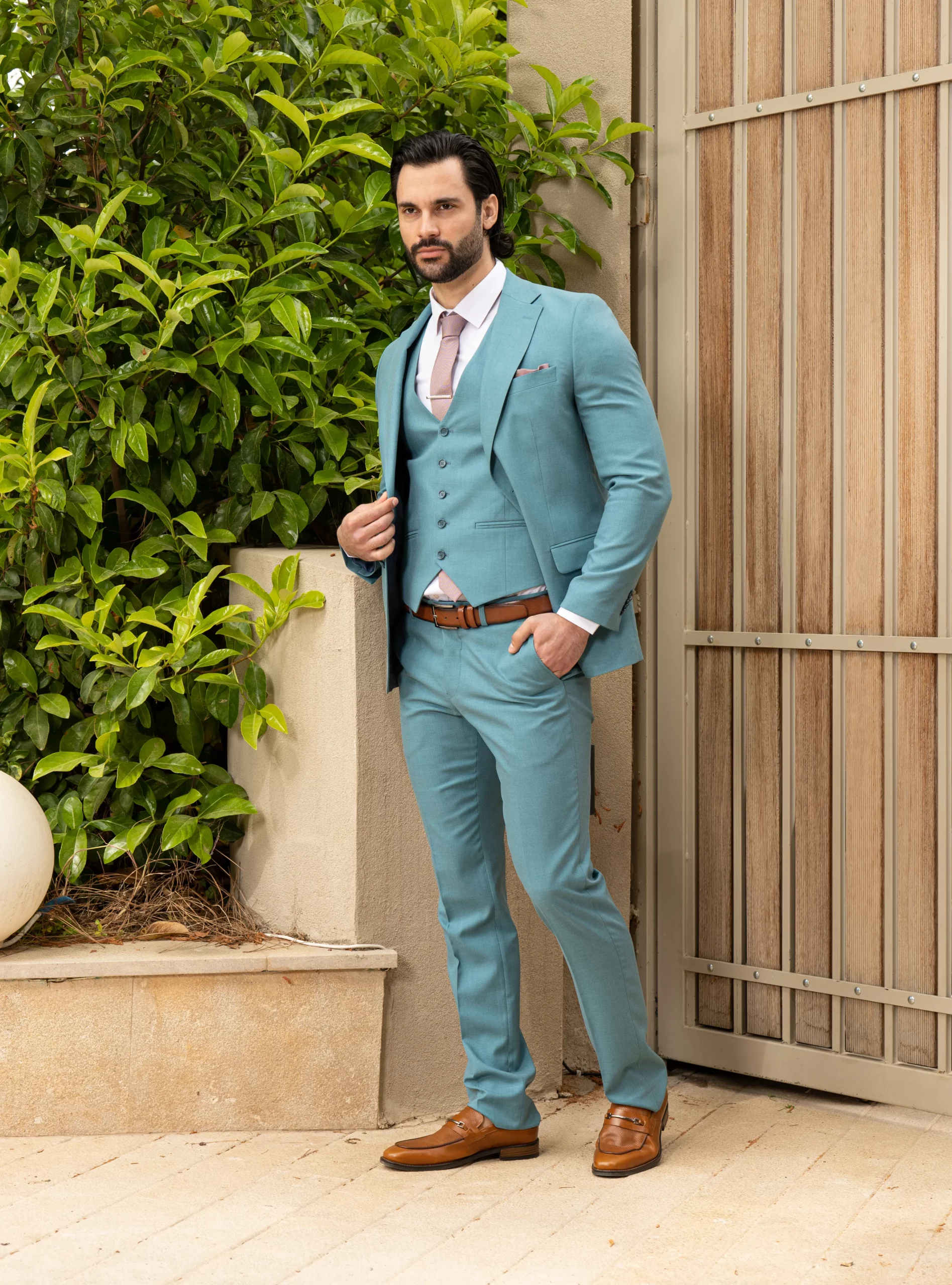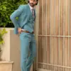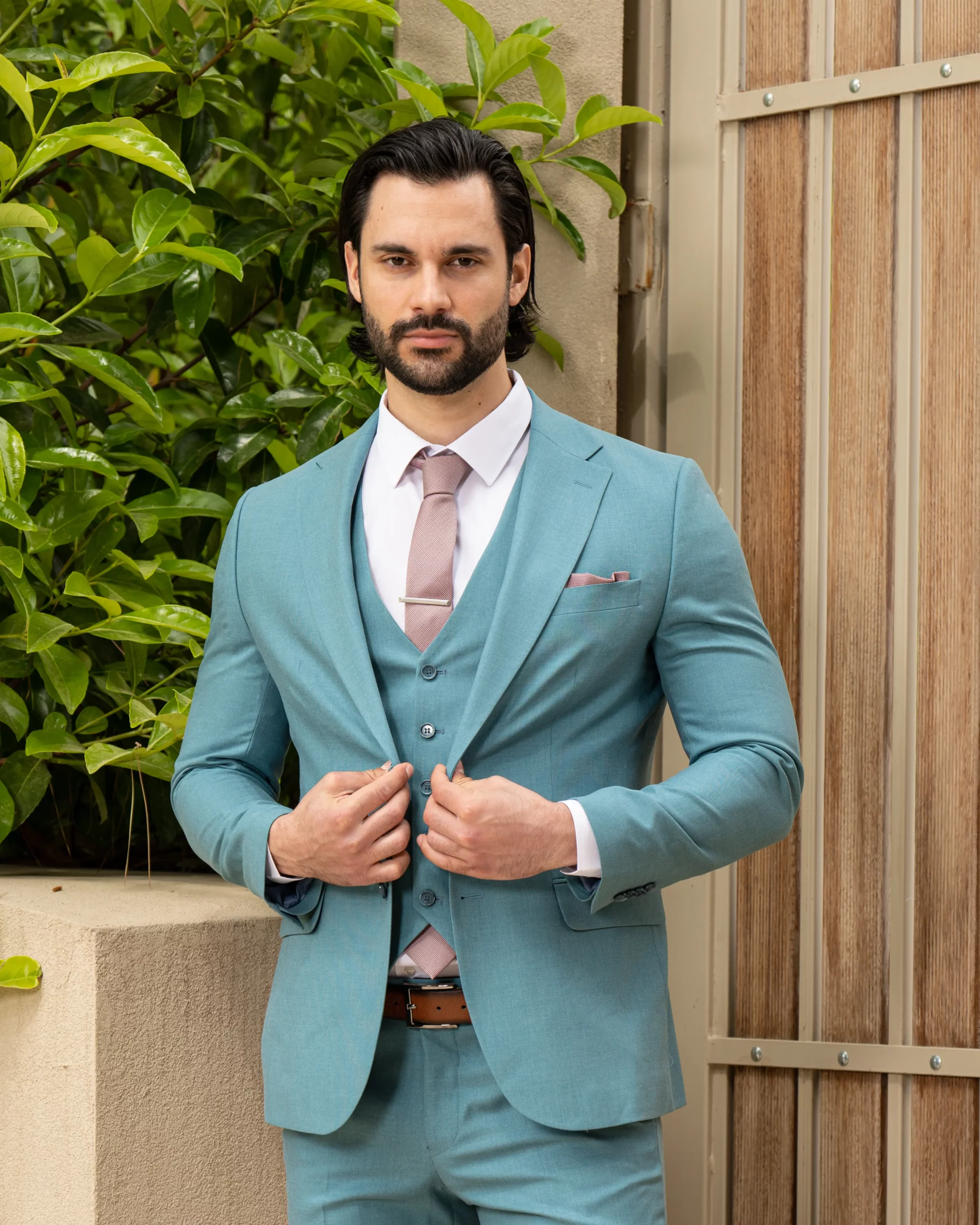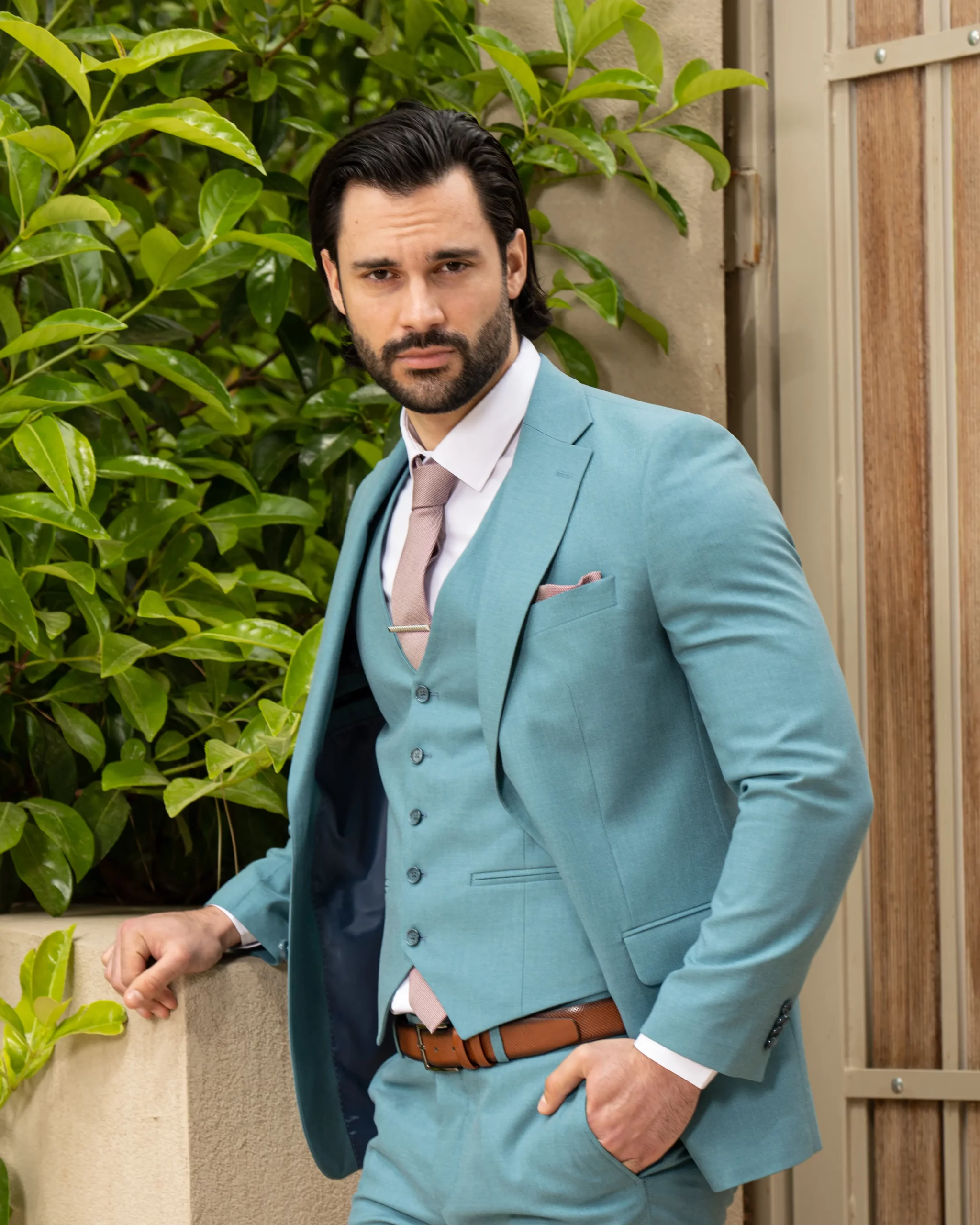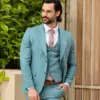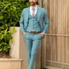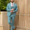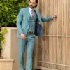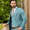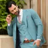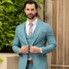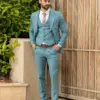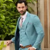 Το σιέλ σακάκι και παντελόνι αποτελεί ένα δροσερό συνδυασμό απαραίτητο για τη θερινή περίοδο, ενώ η slim fit γραμμή αγκαλιάζει το σώμα, κολακεύοντας τον κάτοχο.