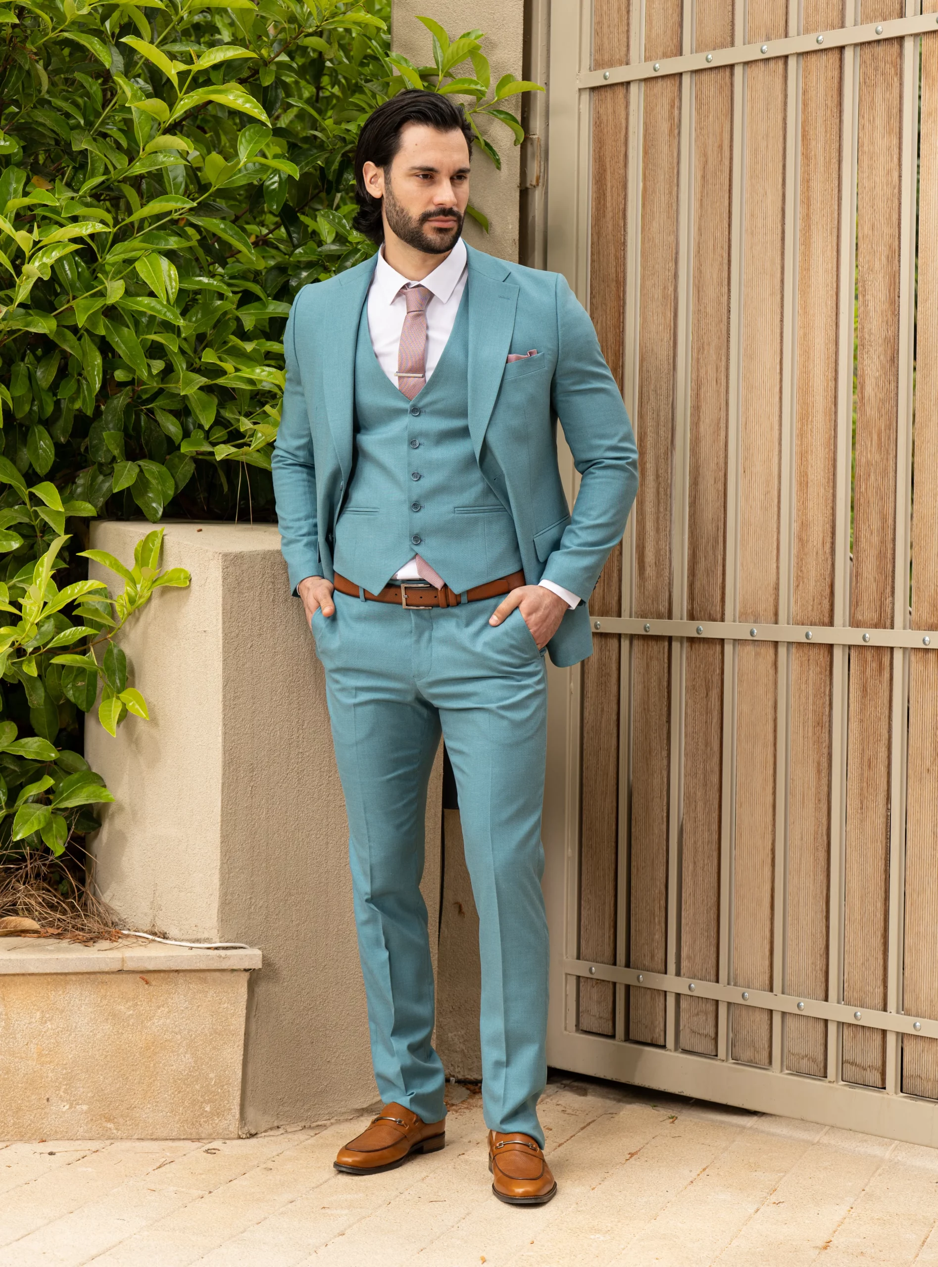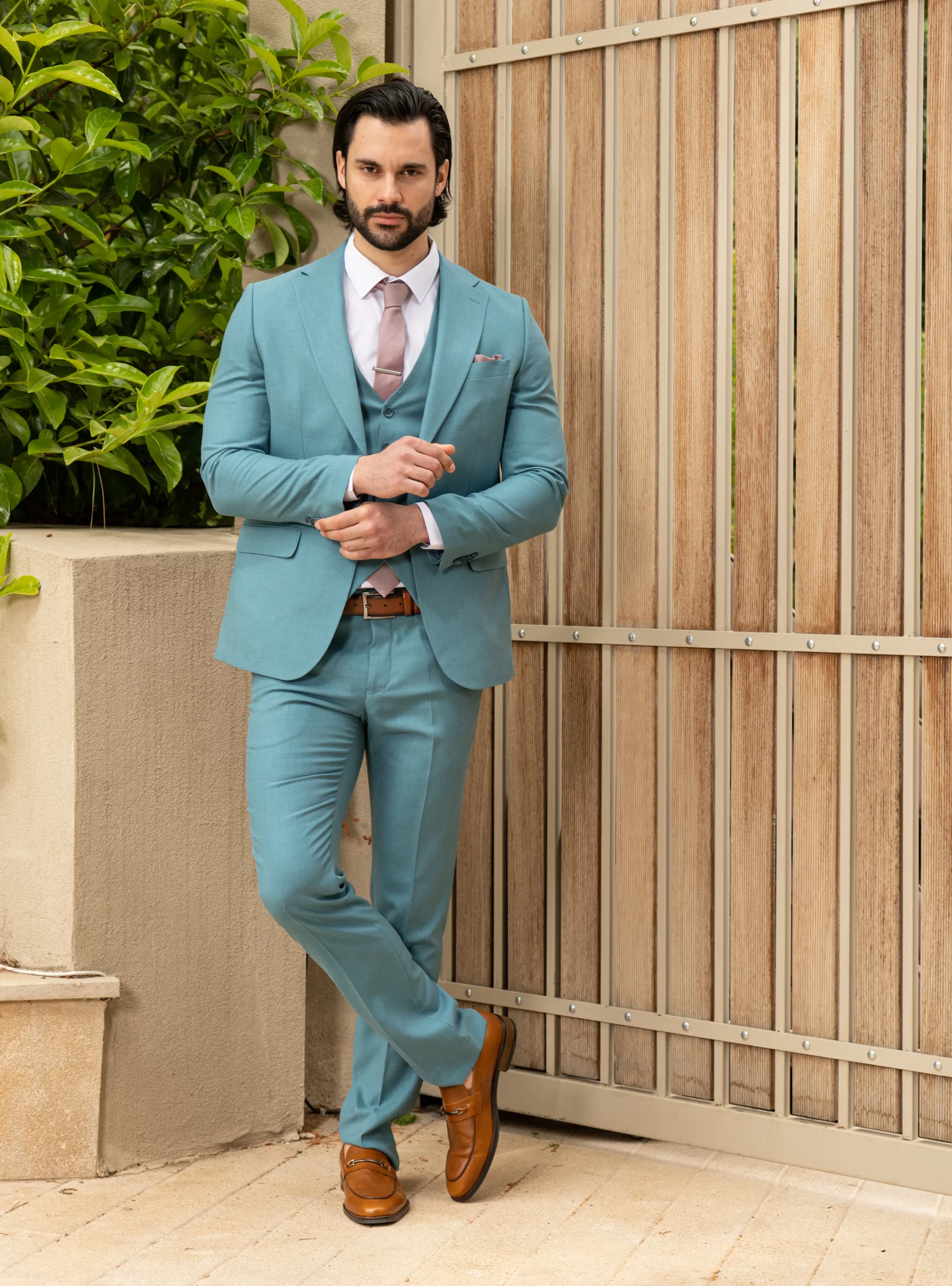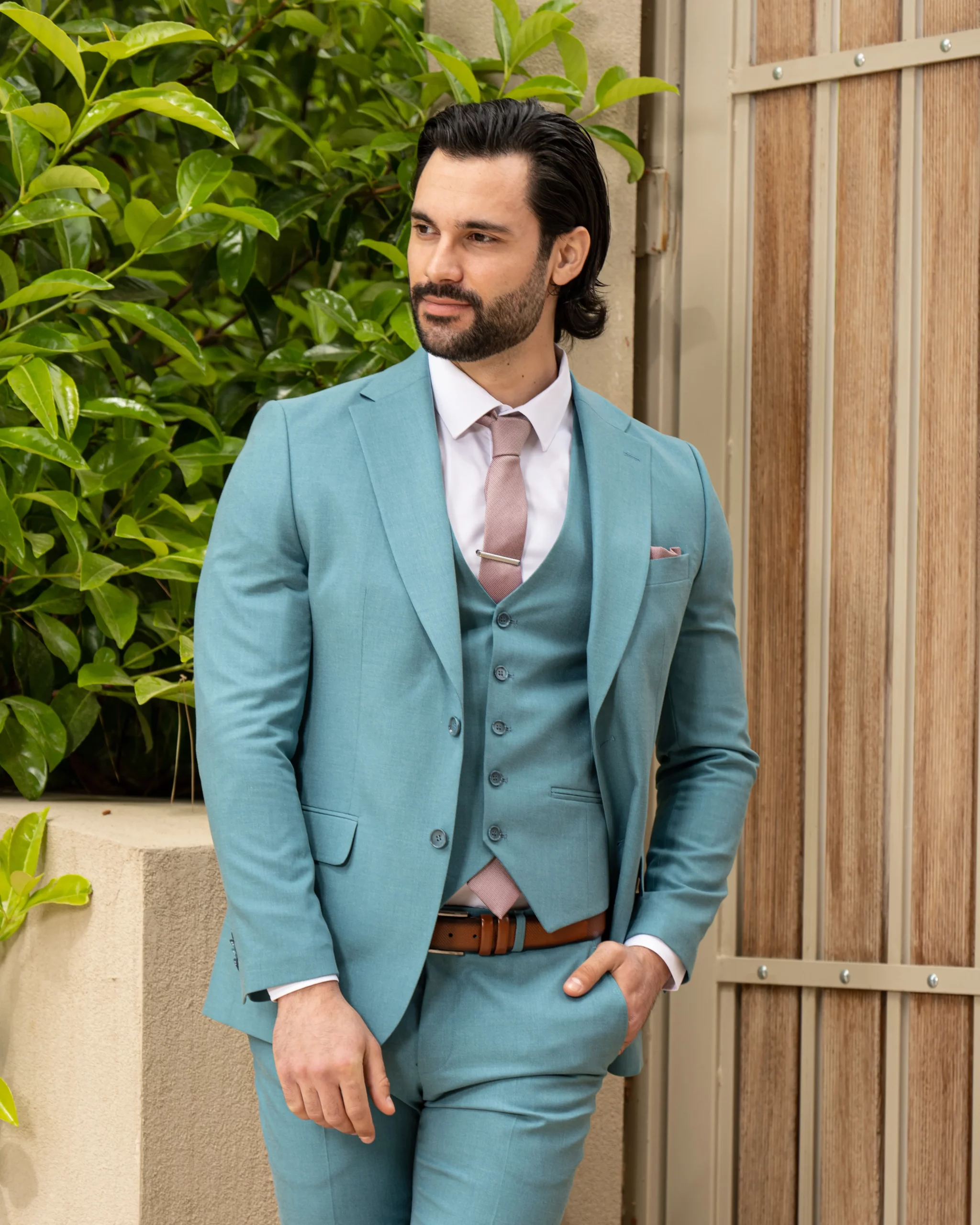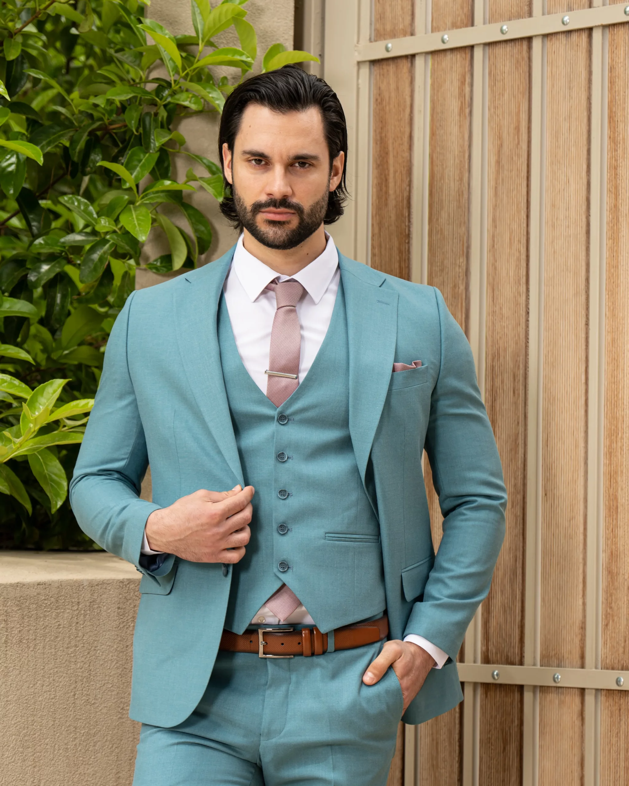 Το σιέλ σακάκι και παντελόνι αποτελεί ένα δροσερό συνδυασμό απαραίτητο για τη θερινή περίοδο, ενώ η slim fit γραμμή αγκαλιάζει το σώμα, κολακεύοντας τον κάτοχο.