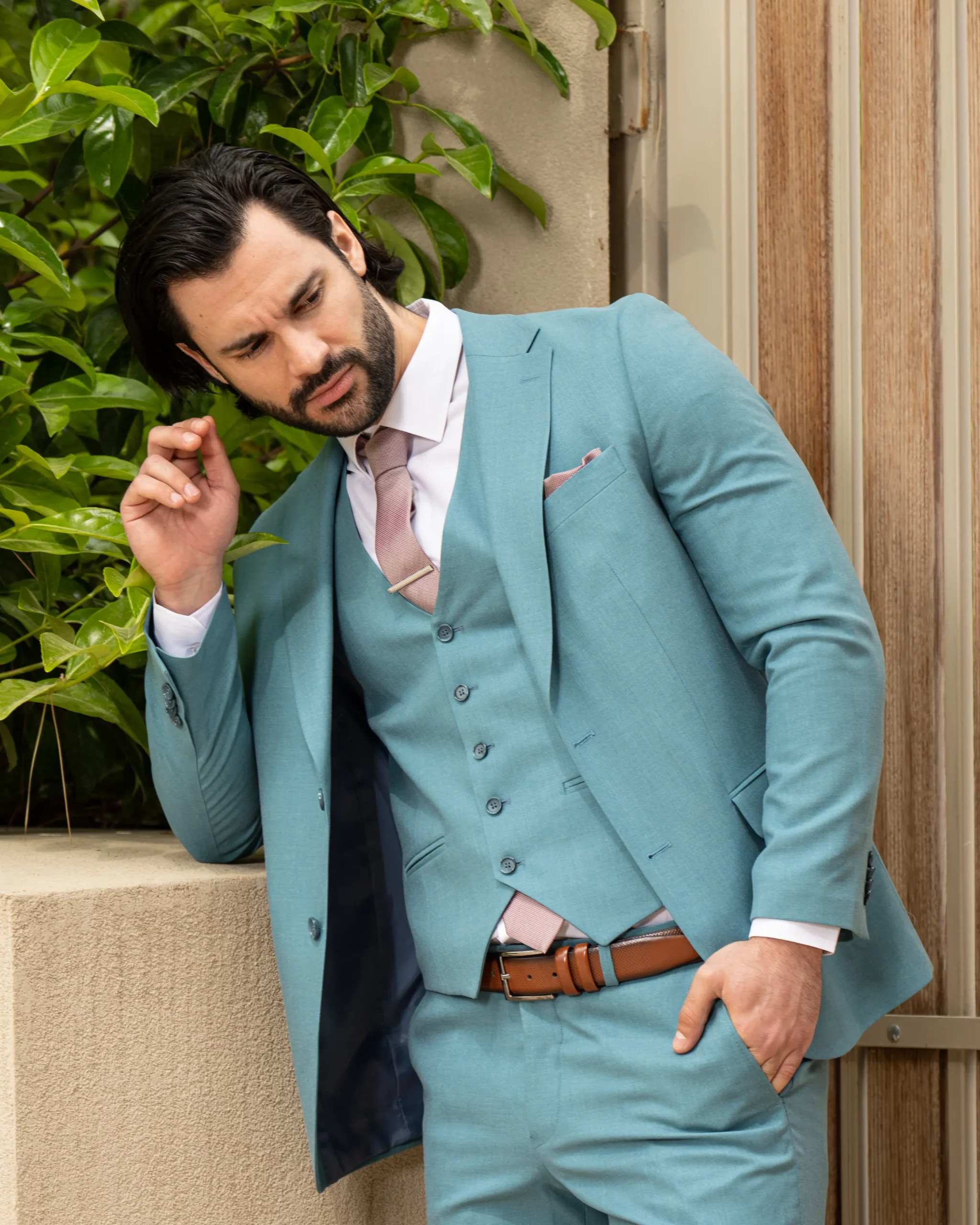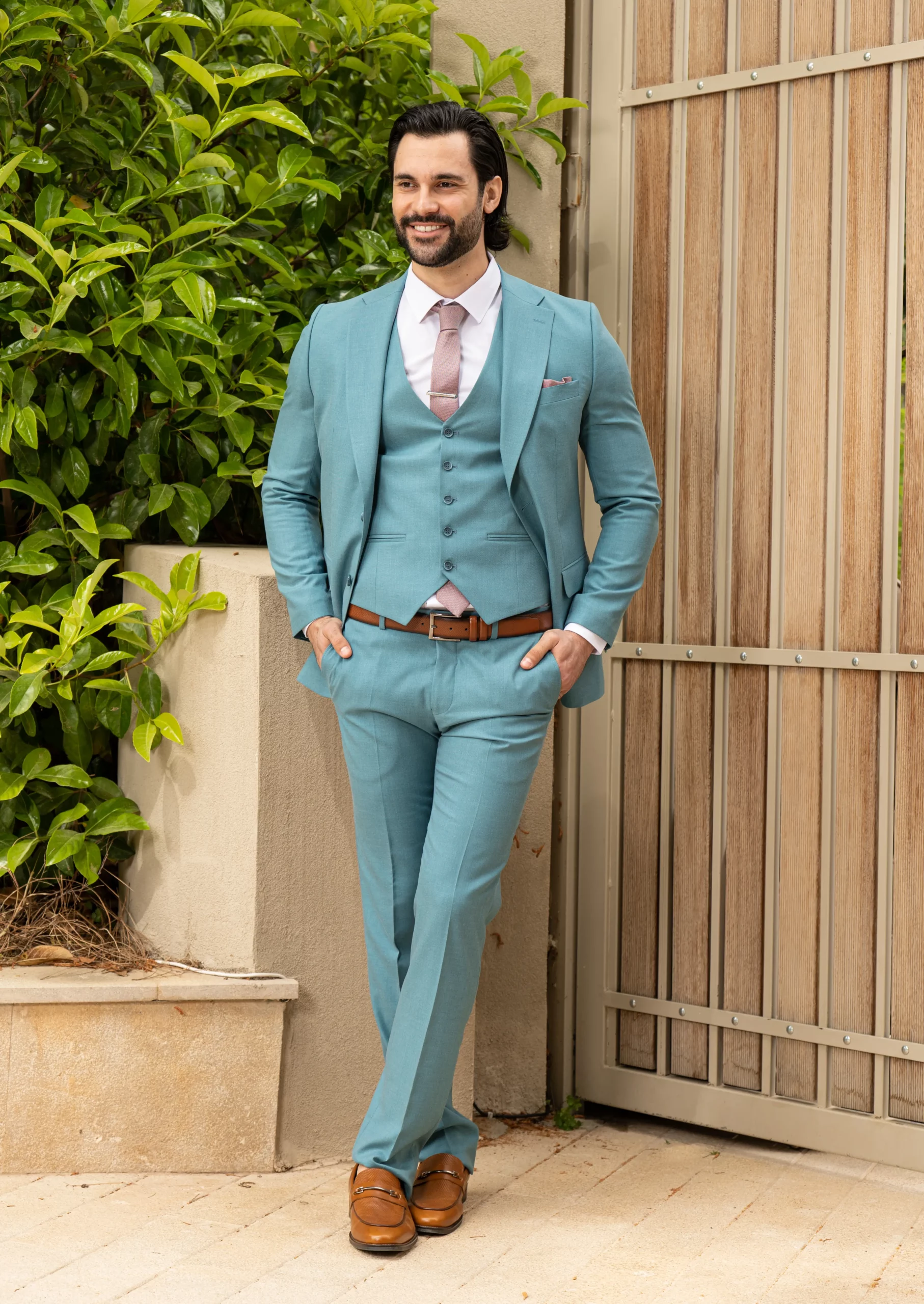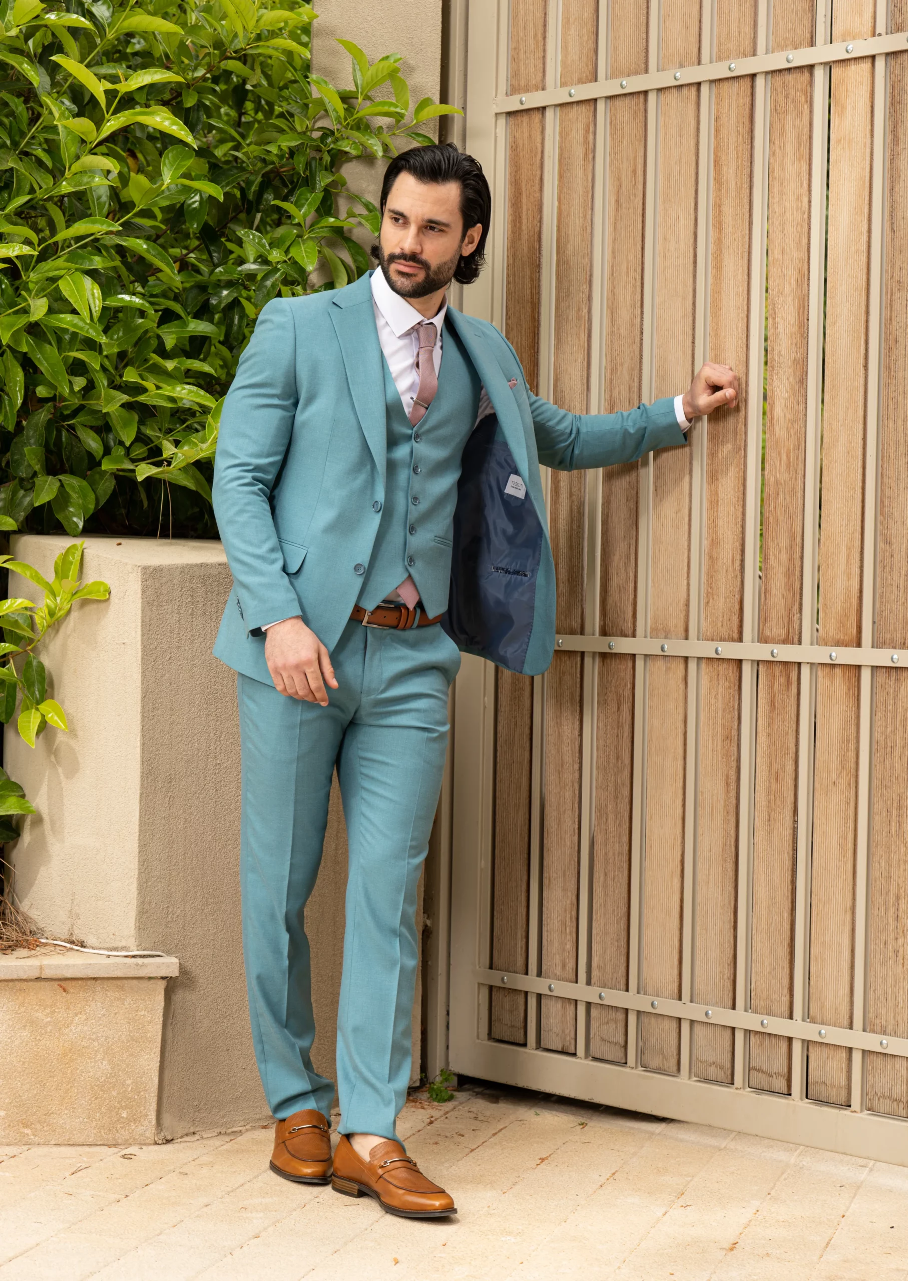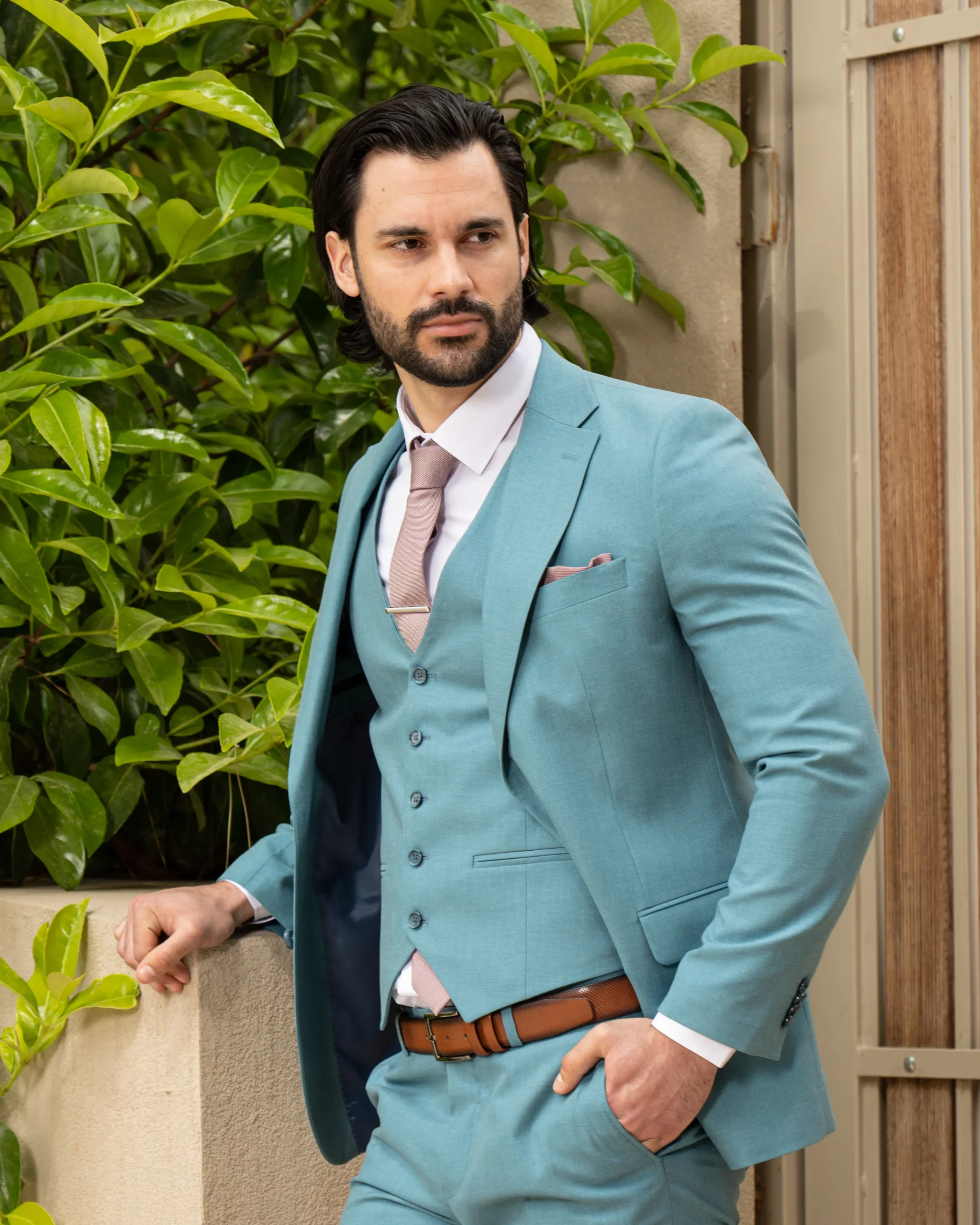 Το σιέλ σακάκι και παντελόνι αποτελεί ένα δροσερό συνδυασμό απαραίτητο για τη θερινή περίοδο, ενώ η slim fit γραμμή αγκαλιάζει το σώμα, κολακεύοντας τον κάτοχο.