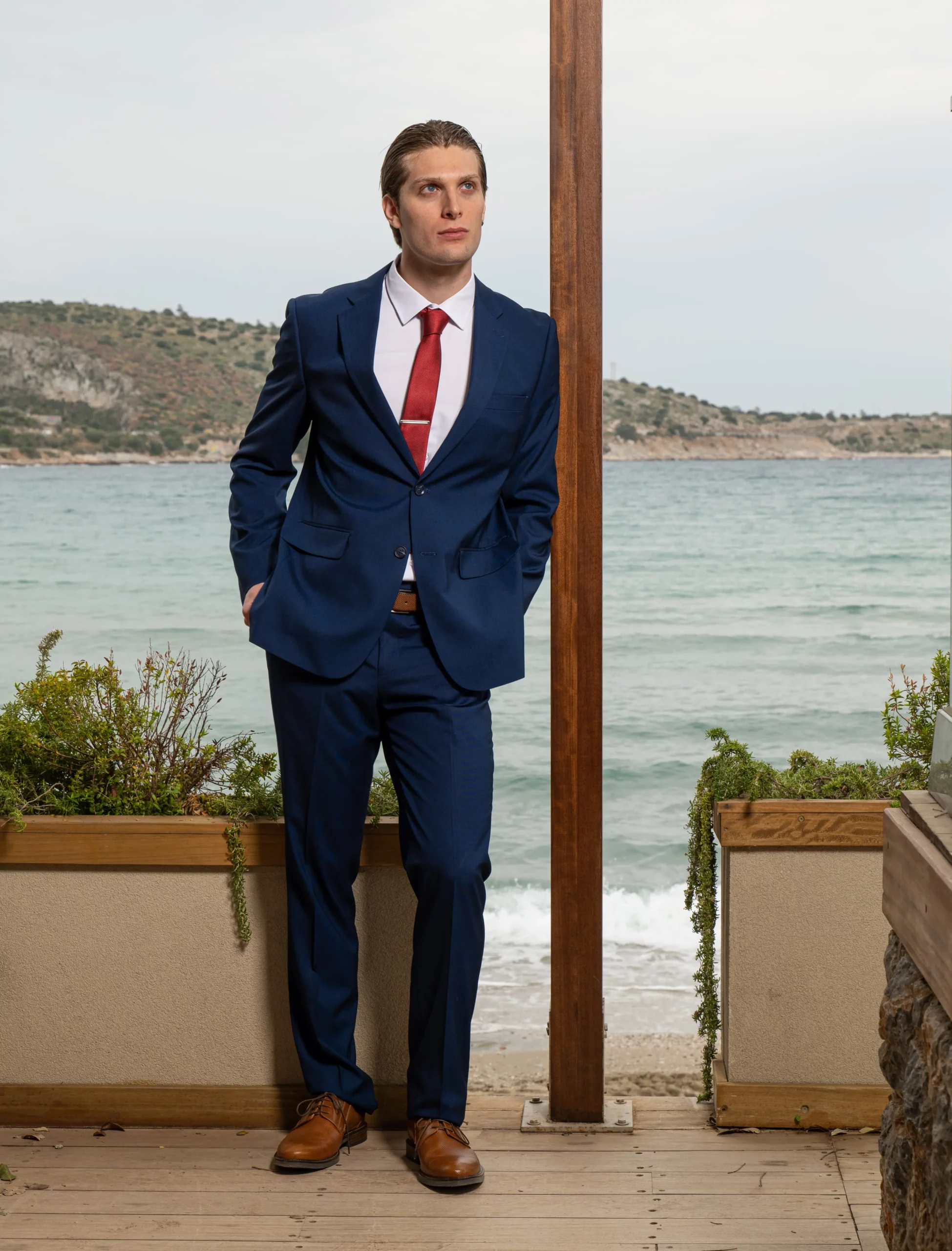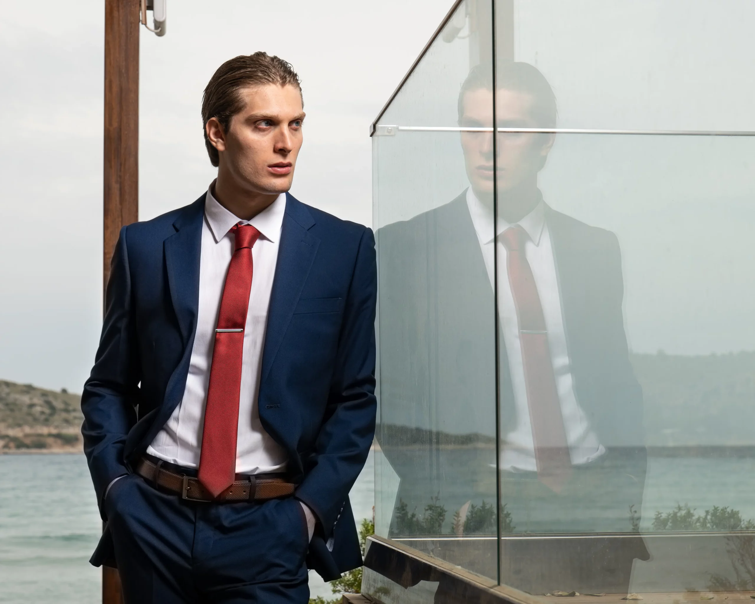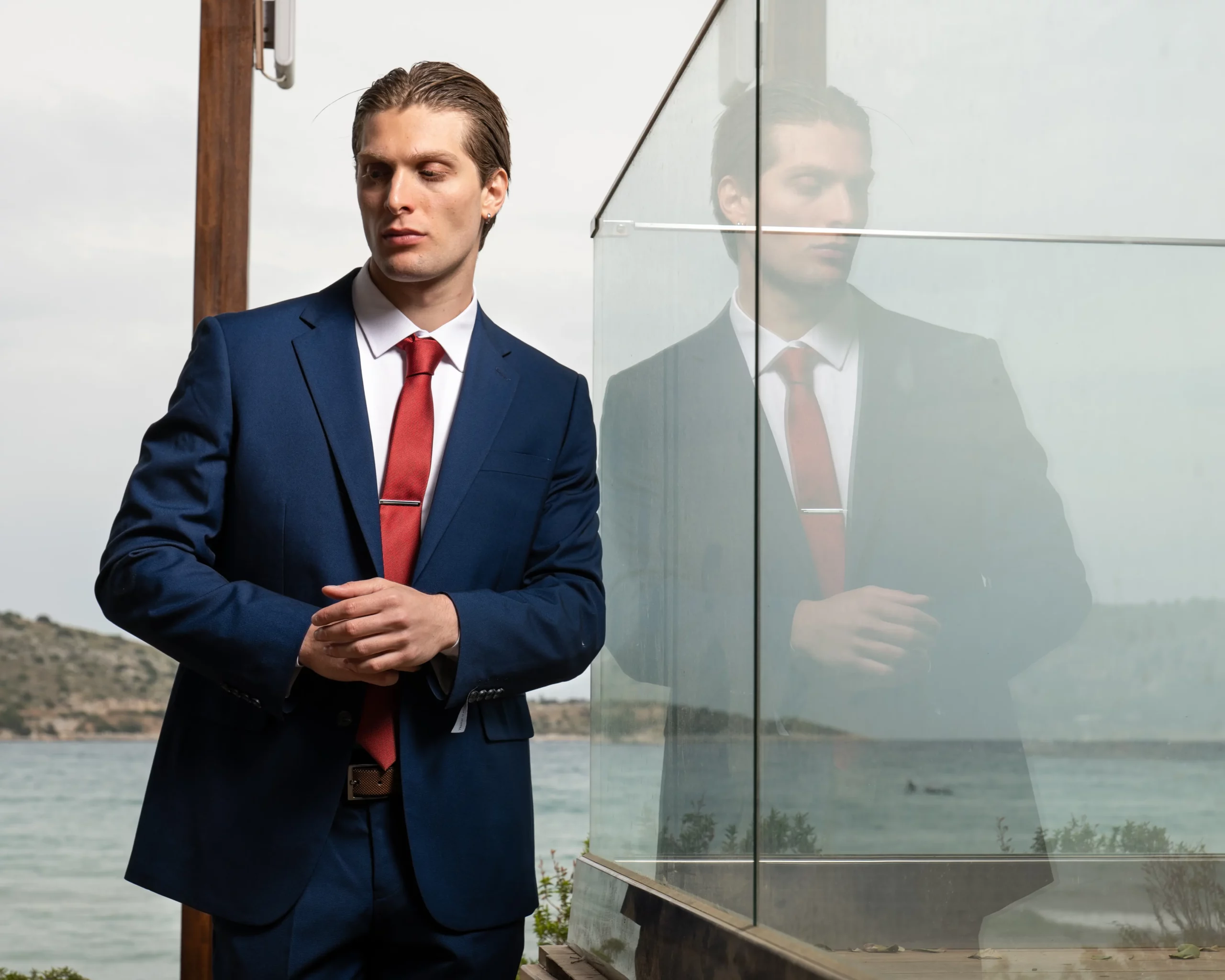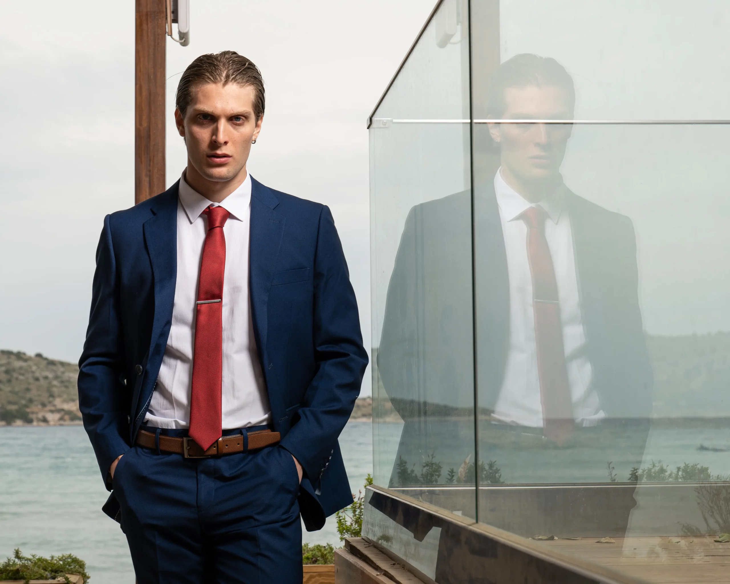 Το μπλε σακάκι και παντελόνι αποτελεί ένα κλασικό συνδυασμό που δεν έχει απογοητεύσει ποτέ, ενώ η κόκκινη γραβάτα δίνει χρώμα και ύφος που ολοκληρώνει το ντύσιμο.