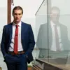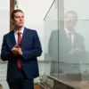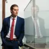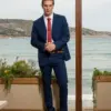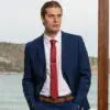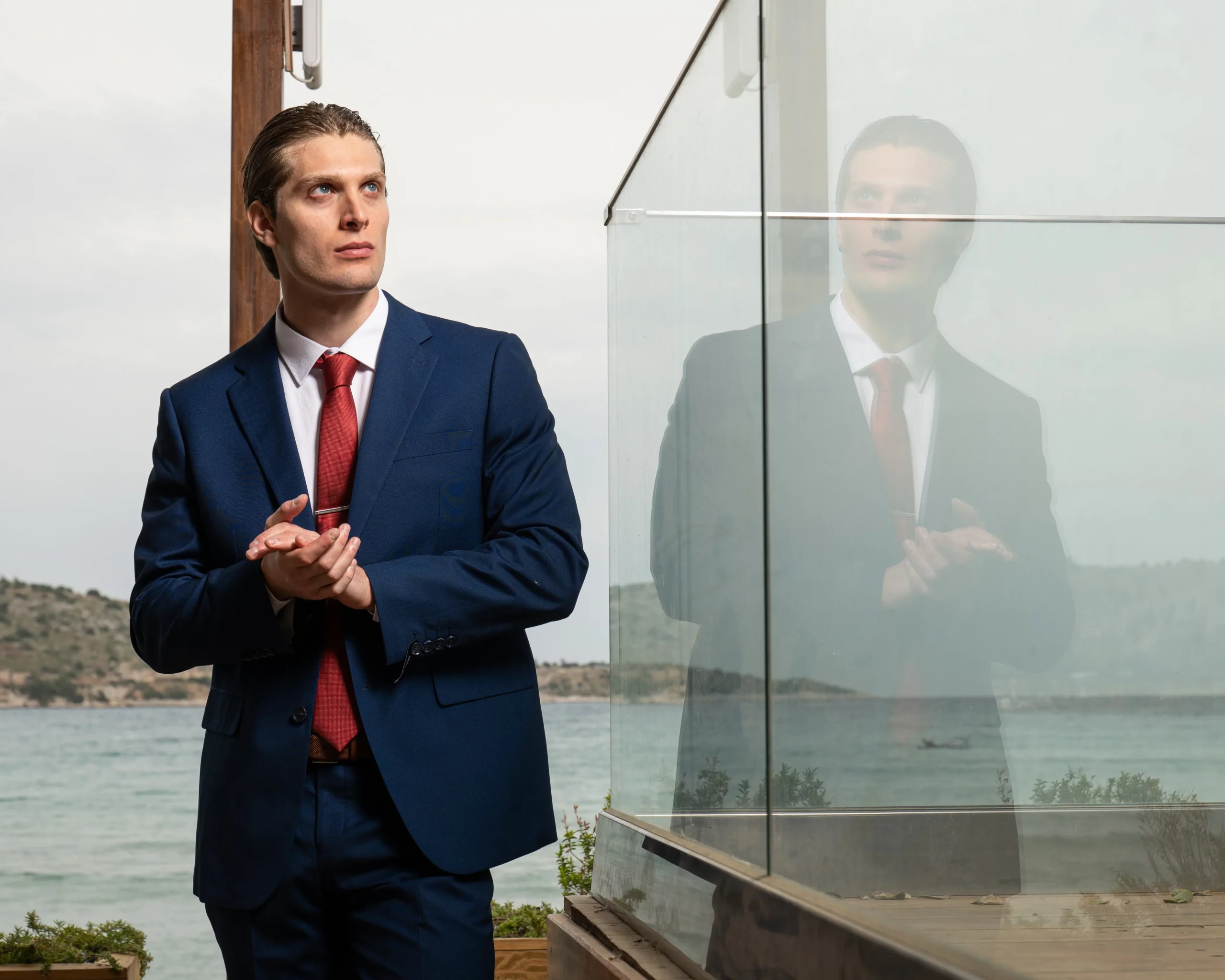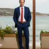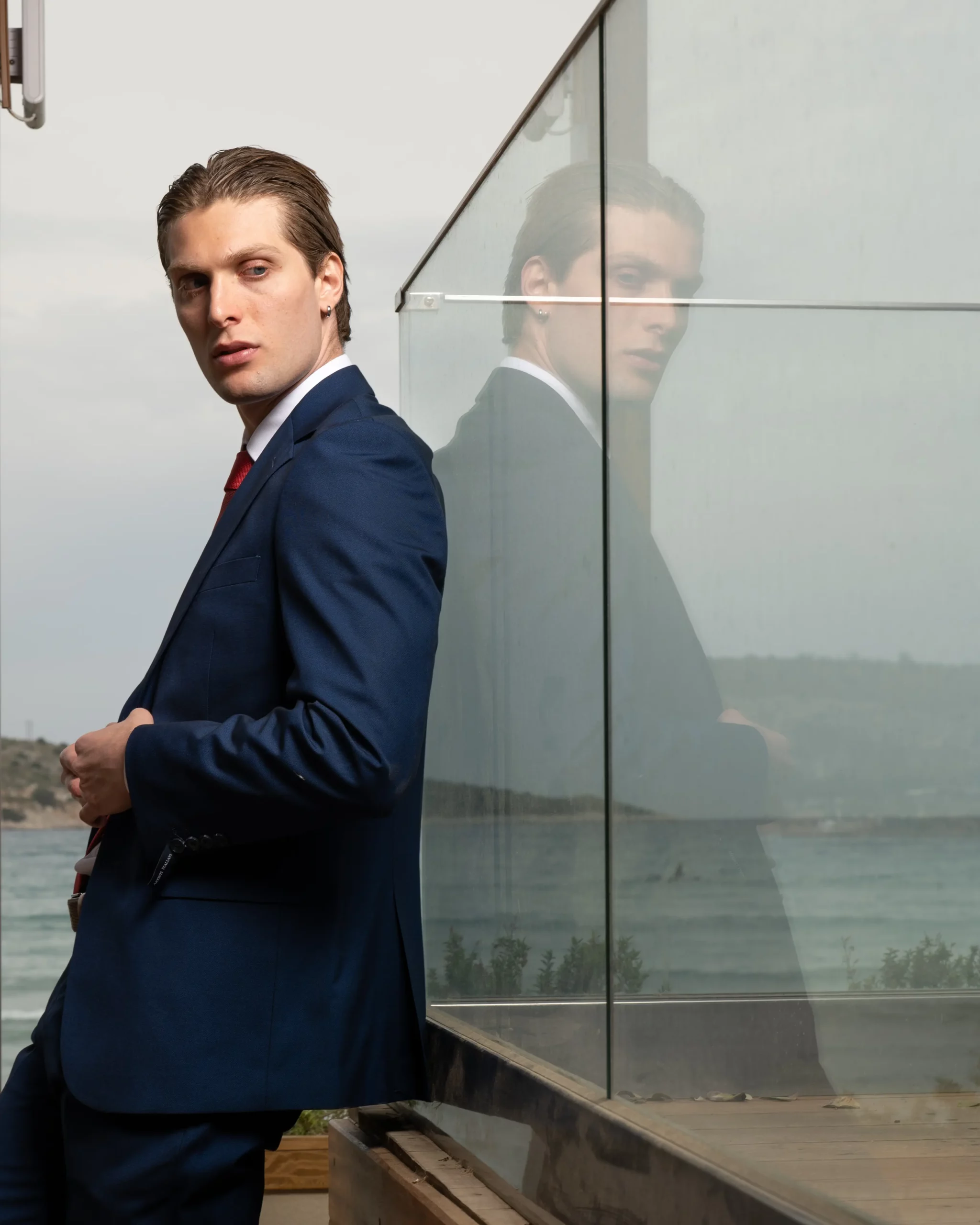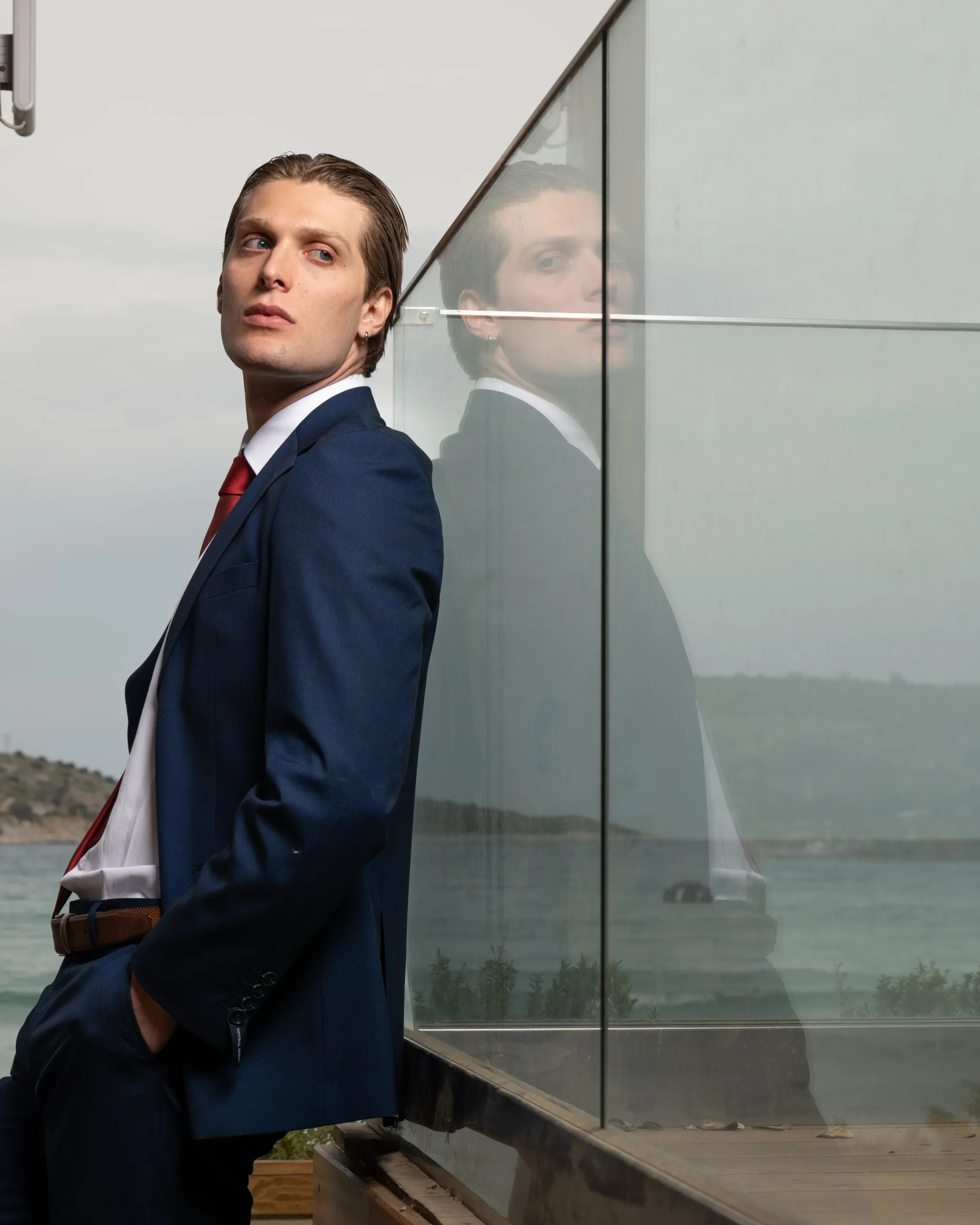 Το μπλε σακάκι και παντελόνι αποτελεί ένα κλασικό συνδυασμό που δεν έχει απογοητεύσει ποτέ, ενώ η κόκκινη γραβάτα δίνει χρώμα και ύφος που ολοκληρώνει το ντύσιμο.