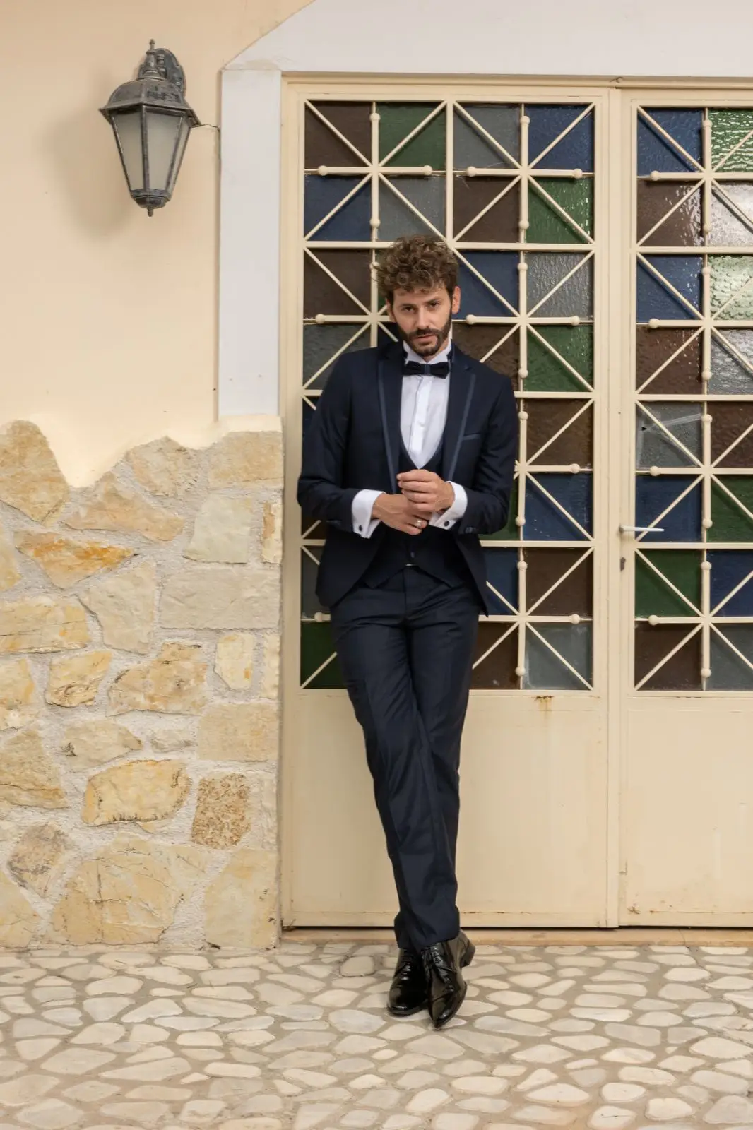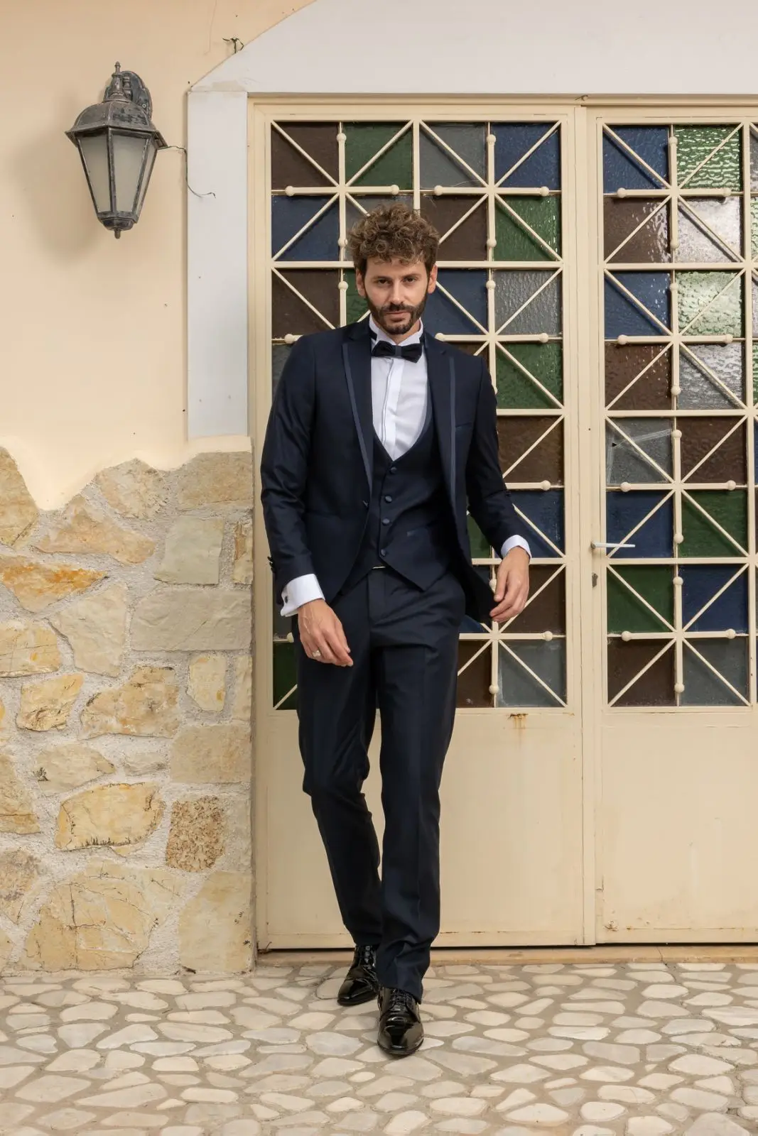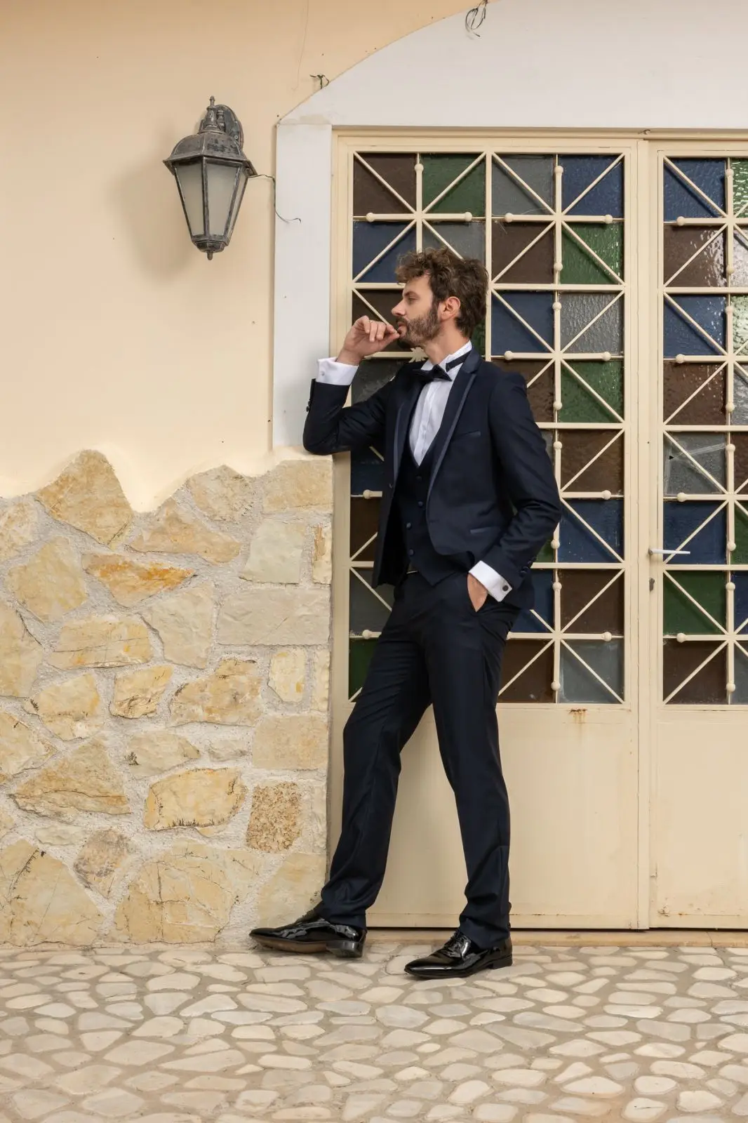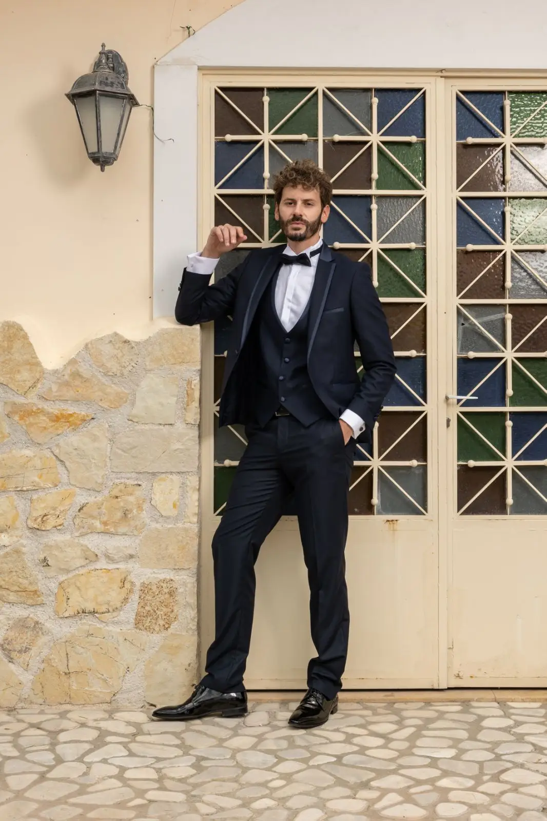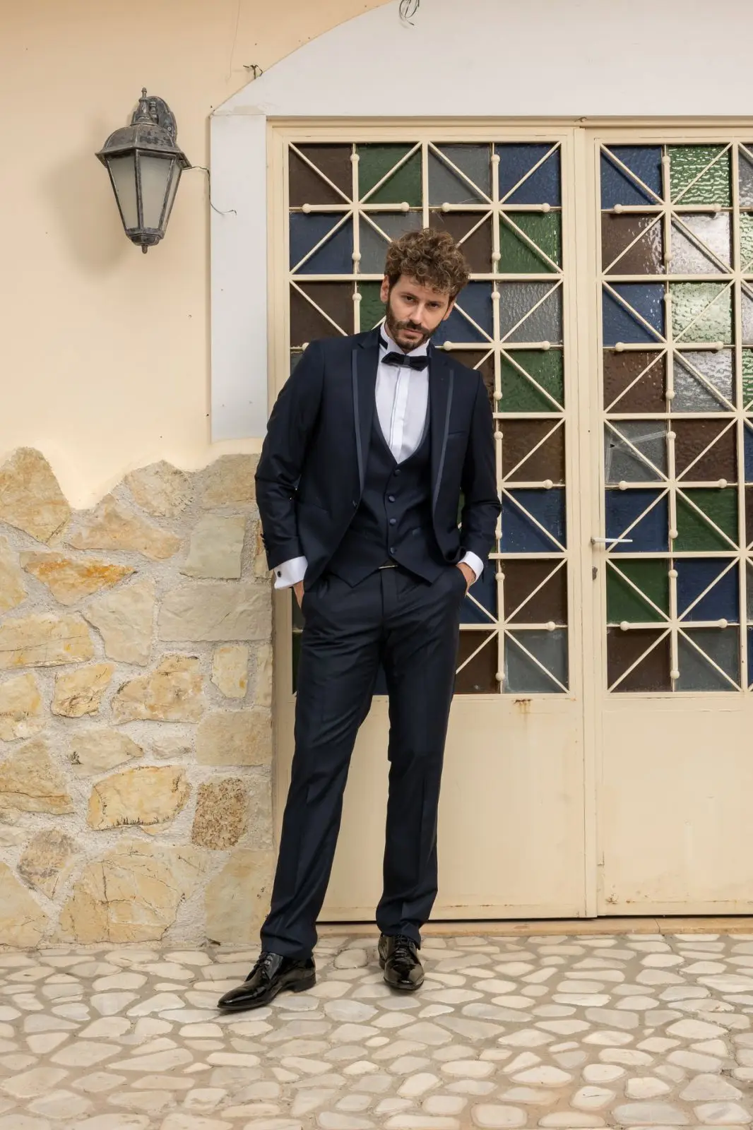 Mοναδικό γαμπριάτικο κοστούμι σε μοντέρνα slim fit γραμμή με υπέροχη εφαρμογή. Το διαχρονικό blue black με μπλε σατέν λεπτομέρειες αποτελεί την πιο κλασάτη επιλογή. Η τιμη αφορα σακακι,παντελονι,γιλεκο,παπιγιον