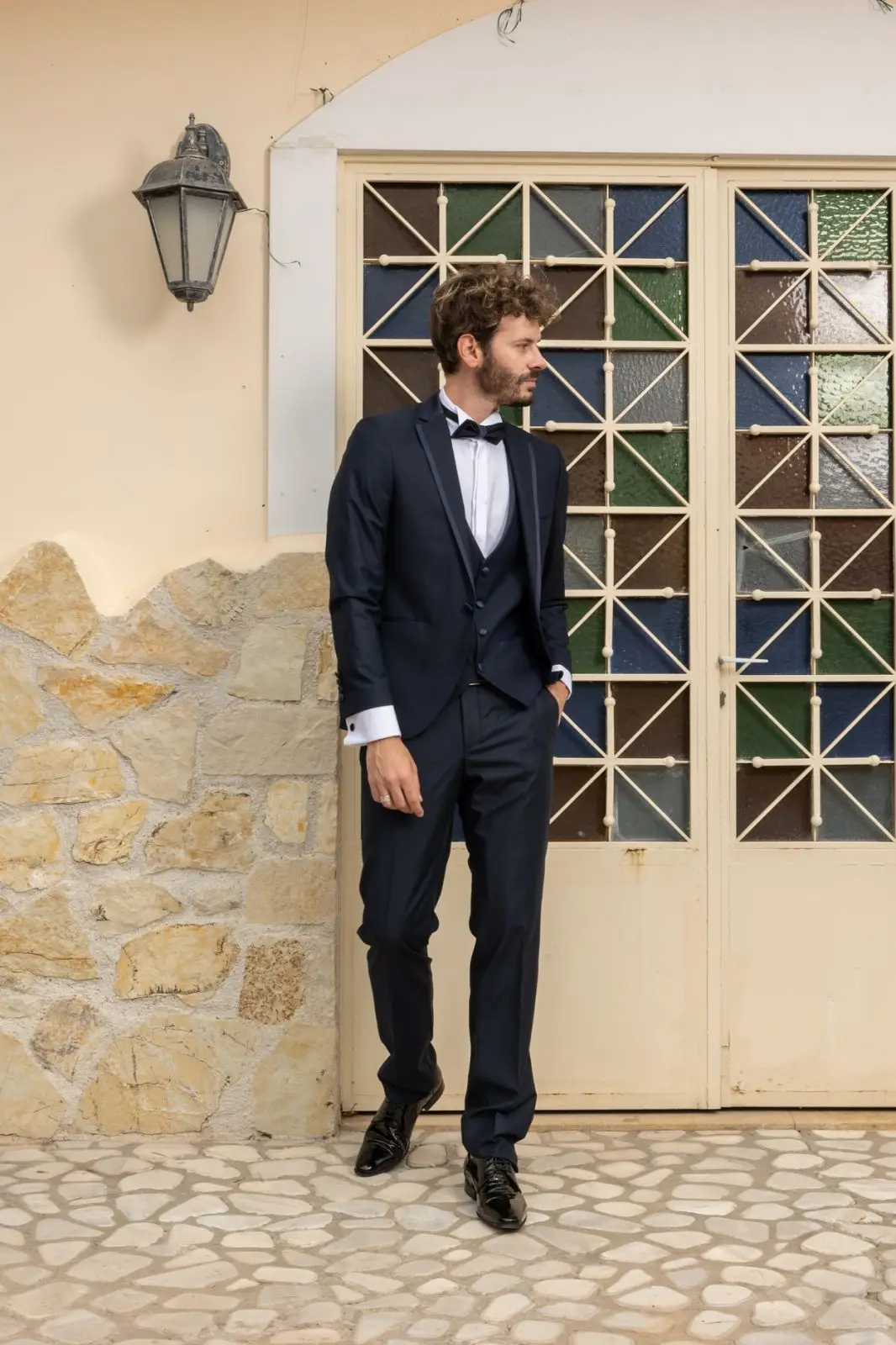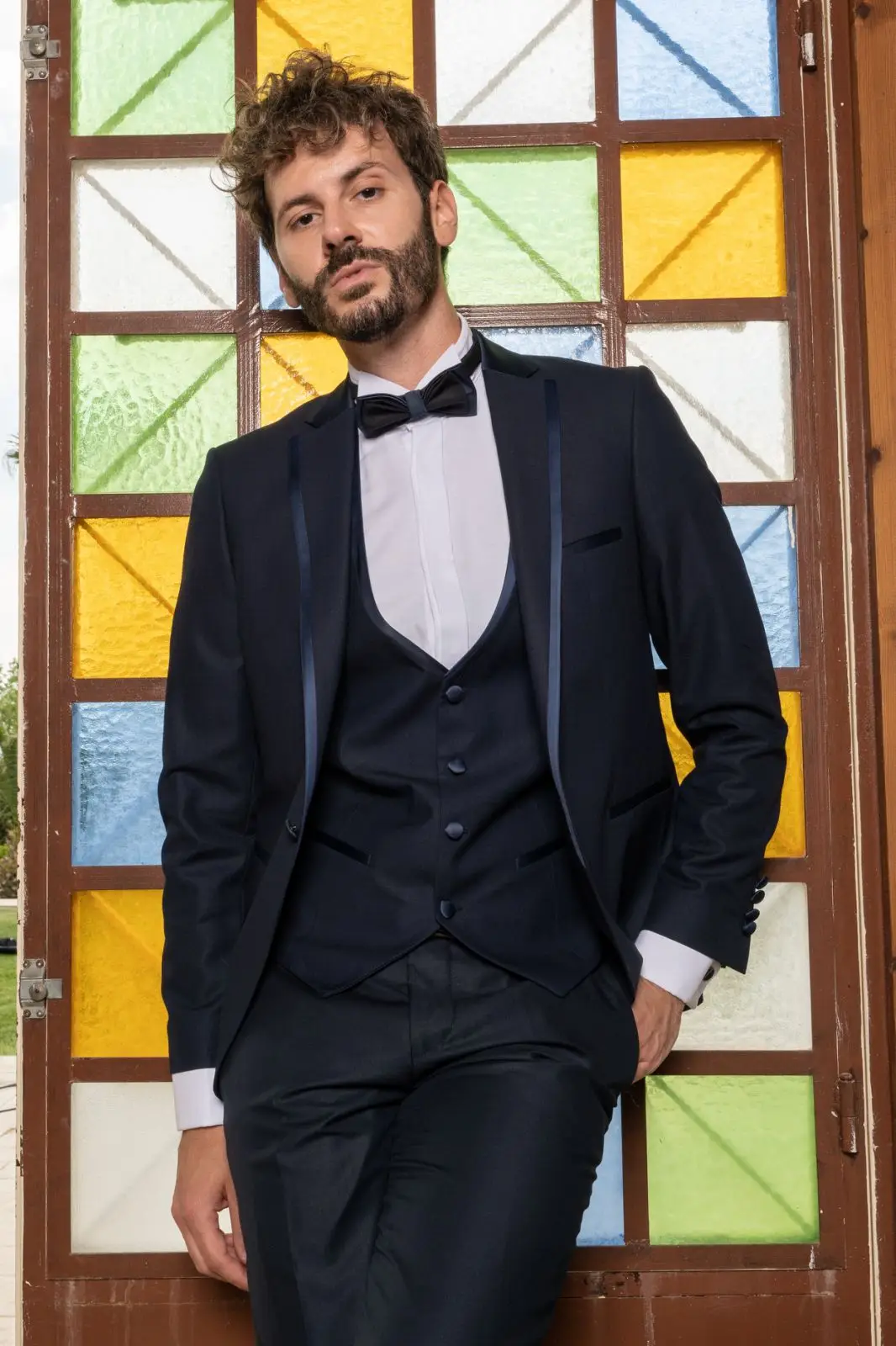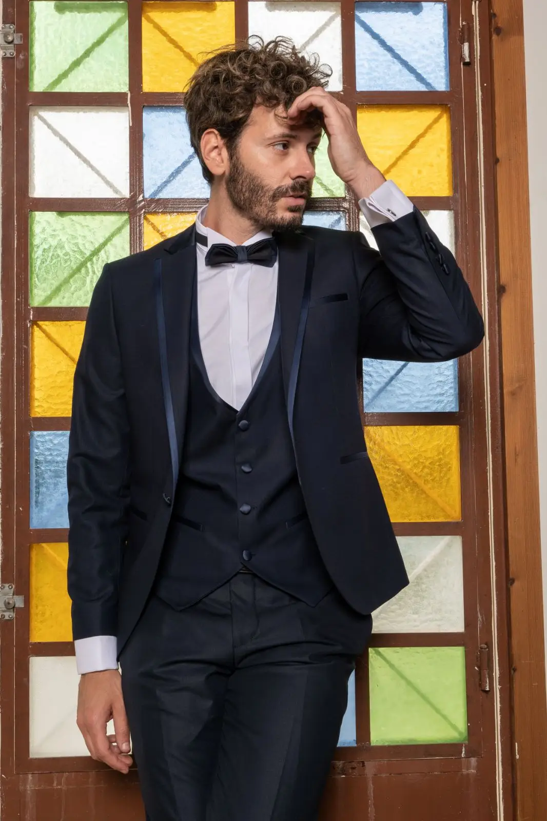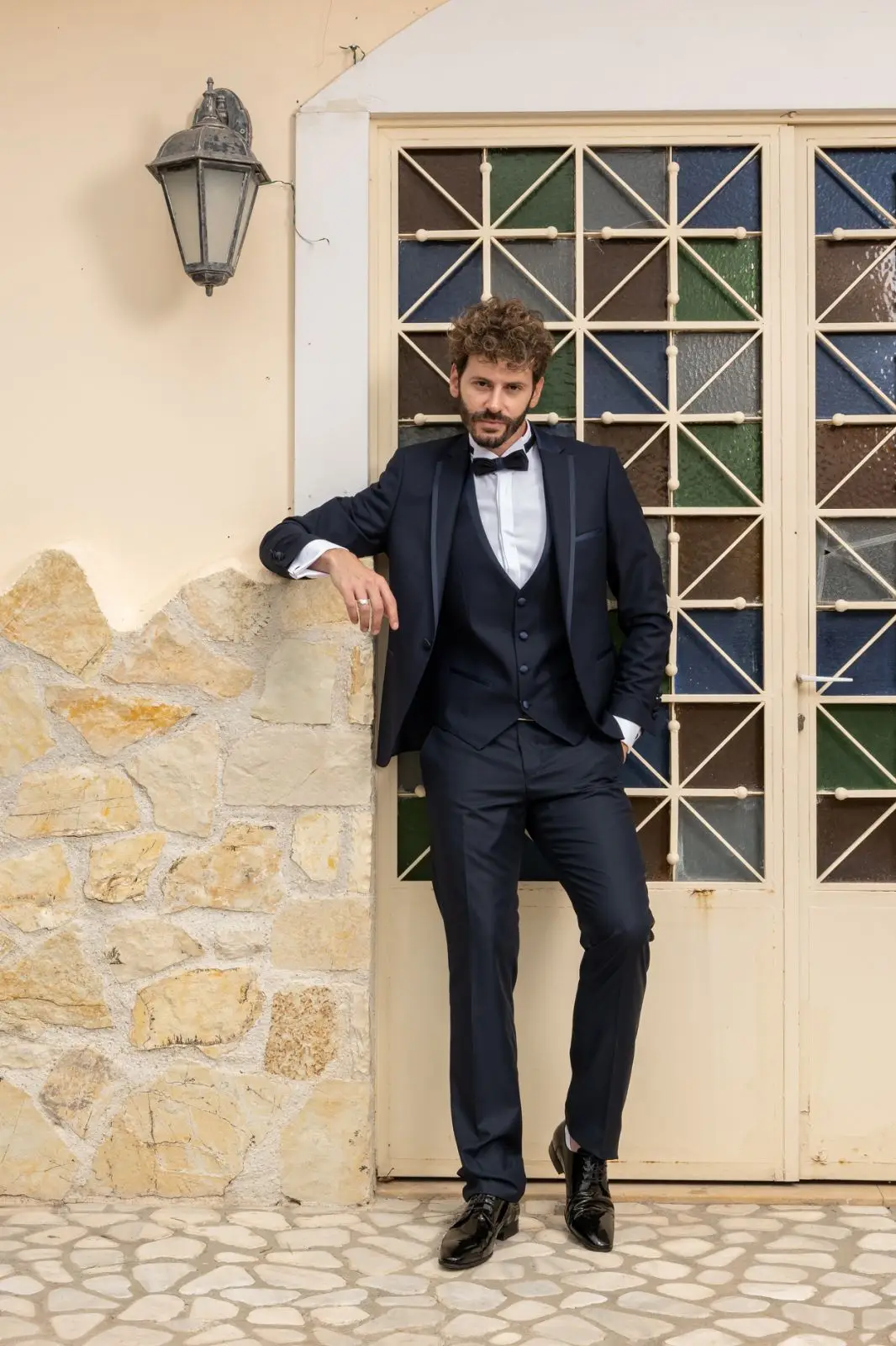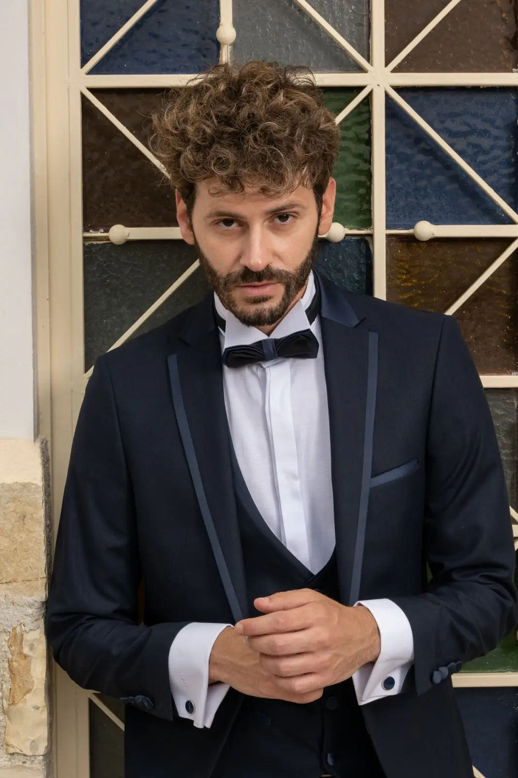 Mοναδικό γαμπριάτικο κοστούμι σε μοντέρνα slim fit γραμμή με υπέροχη εφαρμογή. Το διαχρονικό blue black με μπλε σατέν λεπτομέρειες αποτελεί την πιο κλασάτη επιλογή. Η τιμη αφορα σακακι,παντελονι,γιλεκο,παπιγιον