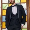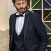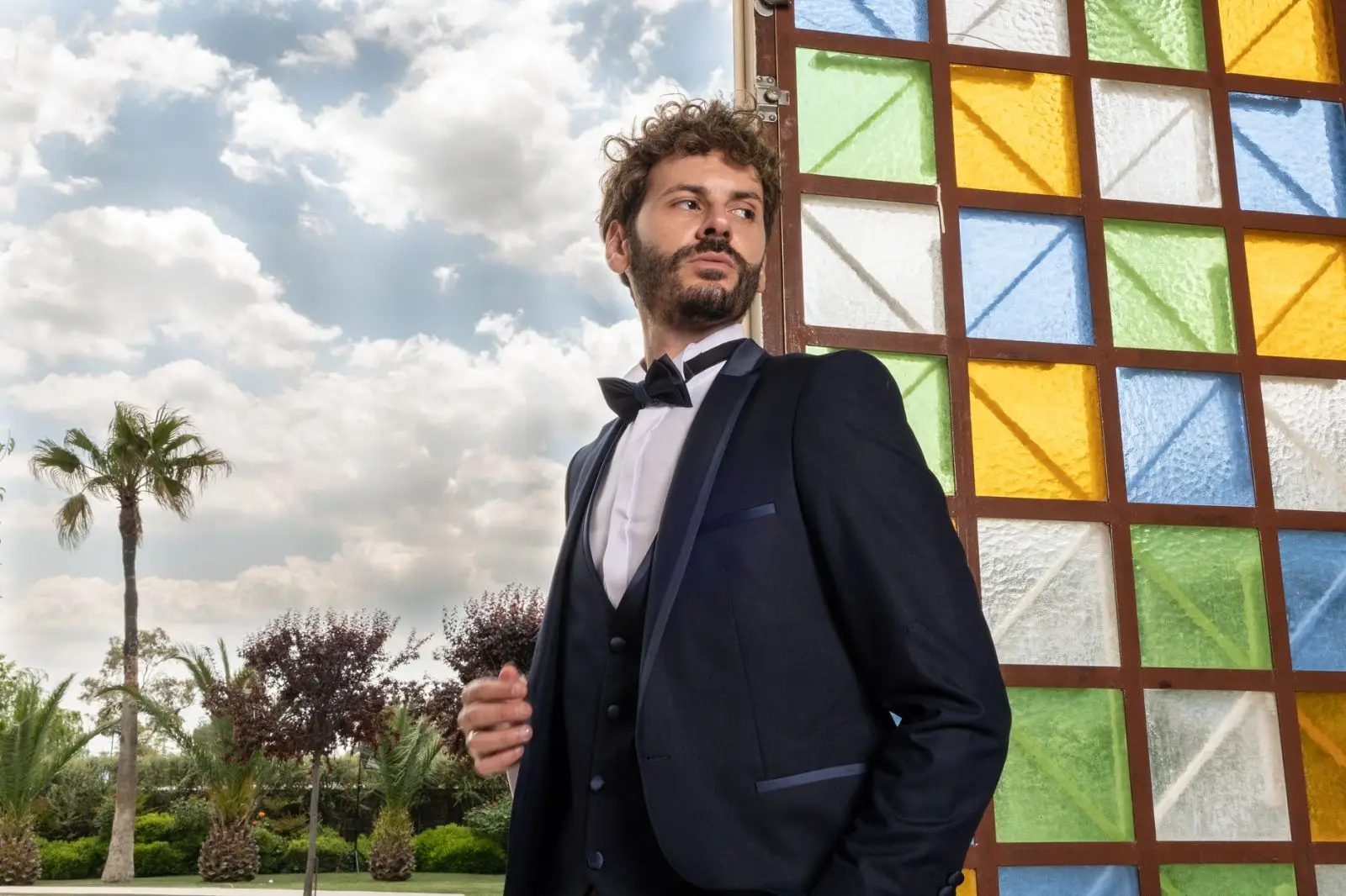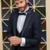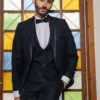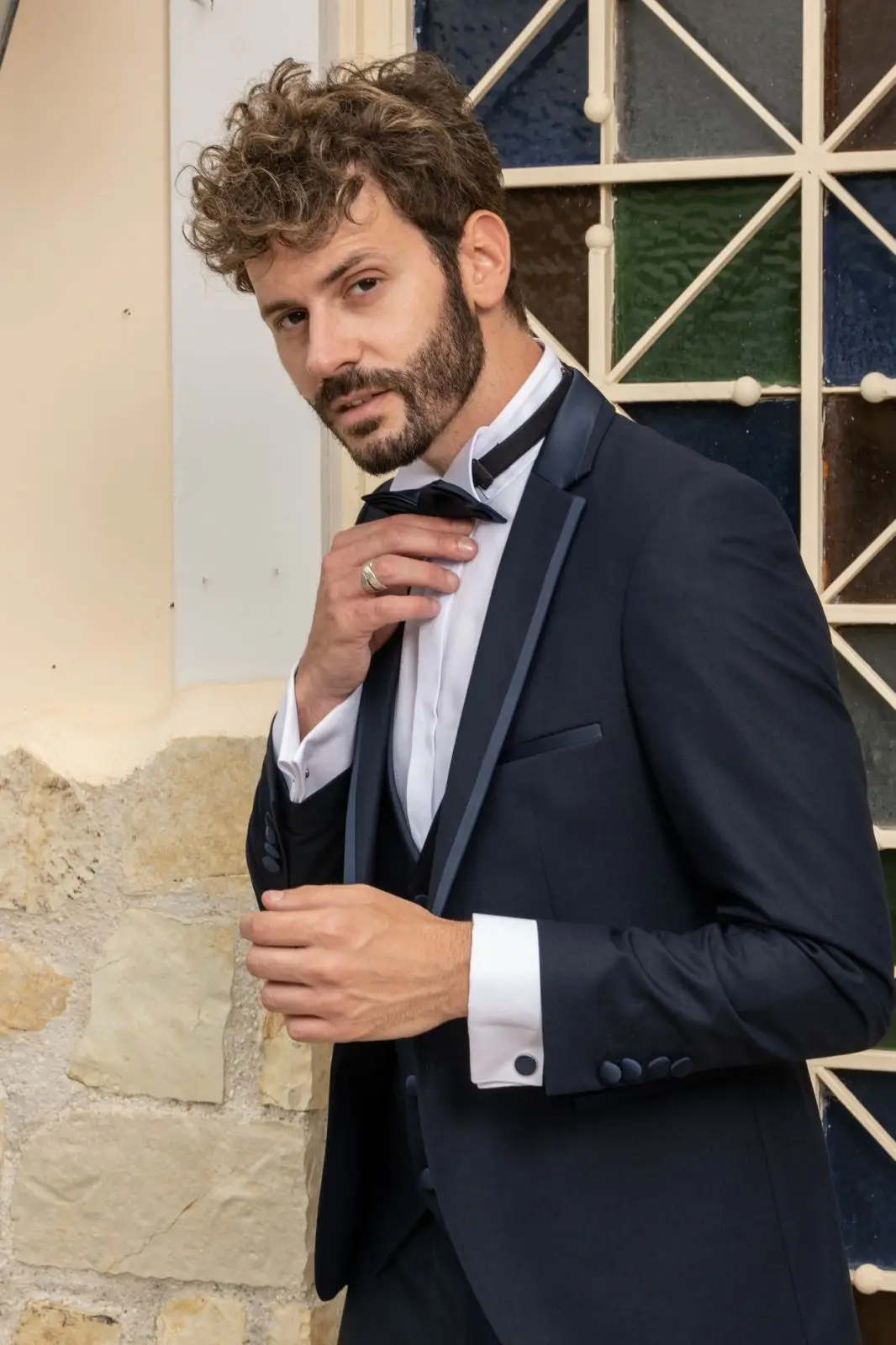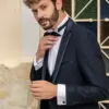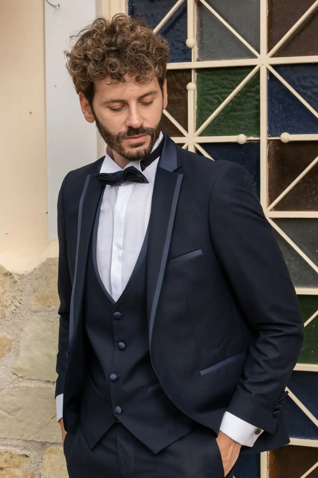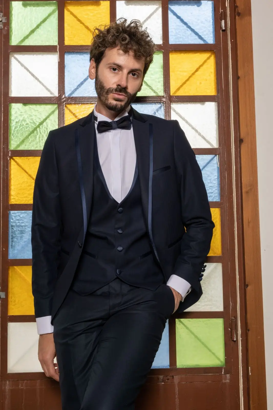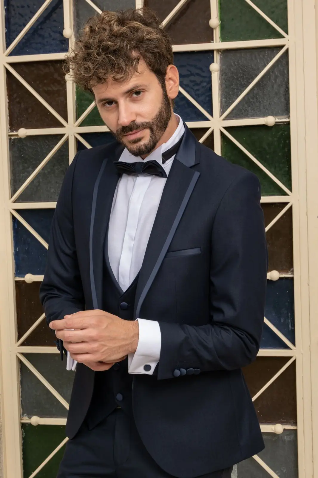 Mοναδικό γαμπριάτικο κοστούμι σε μοντέρνα slim fit γραμμή με υπέροχη εφαρμογή. Το διαχρονικό blue black με μπλε σατέν λεπτομέρειες αποτελεί την πιο κλασάτη επιλογή. Η τιμη αφορα σακακι,παντελονι,γιλεκο,παπιγιον