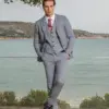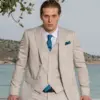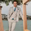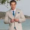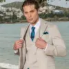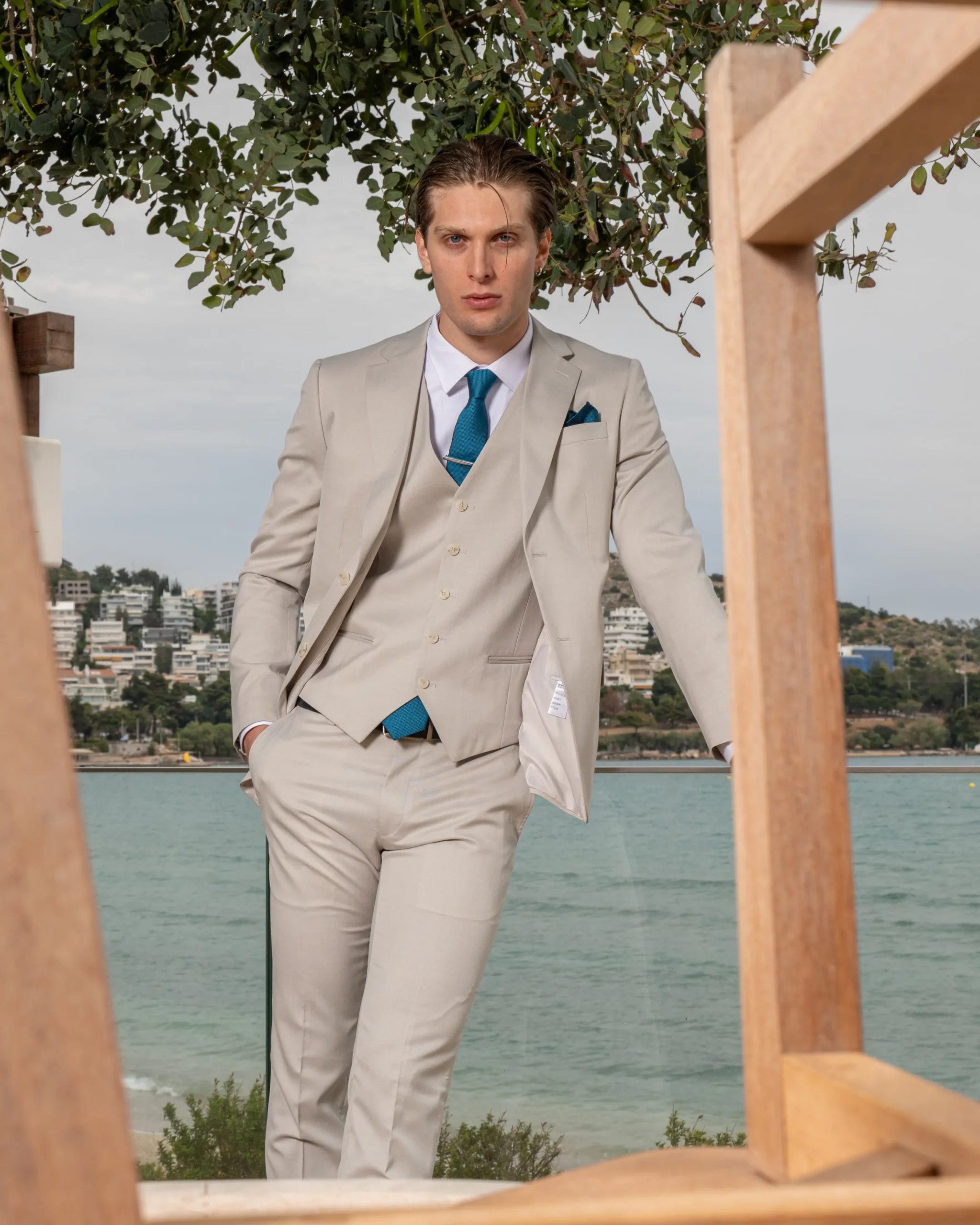 Με σακάκι και παντελόνι και γιλέκο σε όμορφο απαλό μπεζ, αποτελεί ένα κλασικό συνδυασμό ιδανικό για ανοιξιάτικες και καλοκαιρινές εκδηλώσεις.
