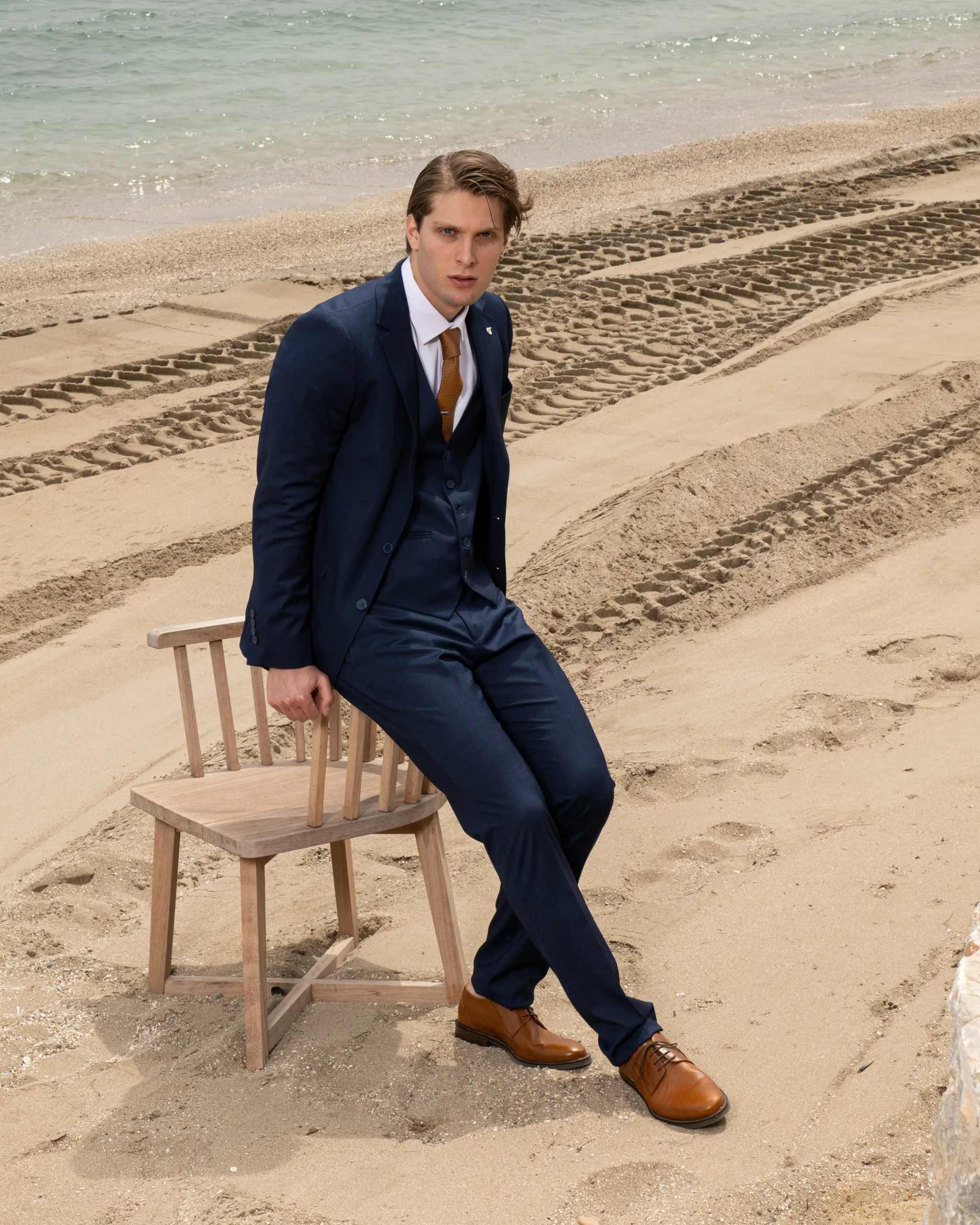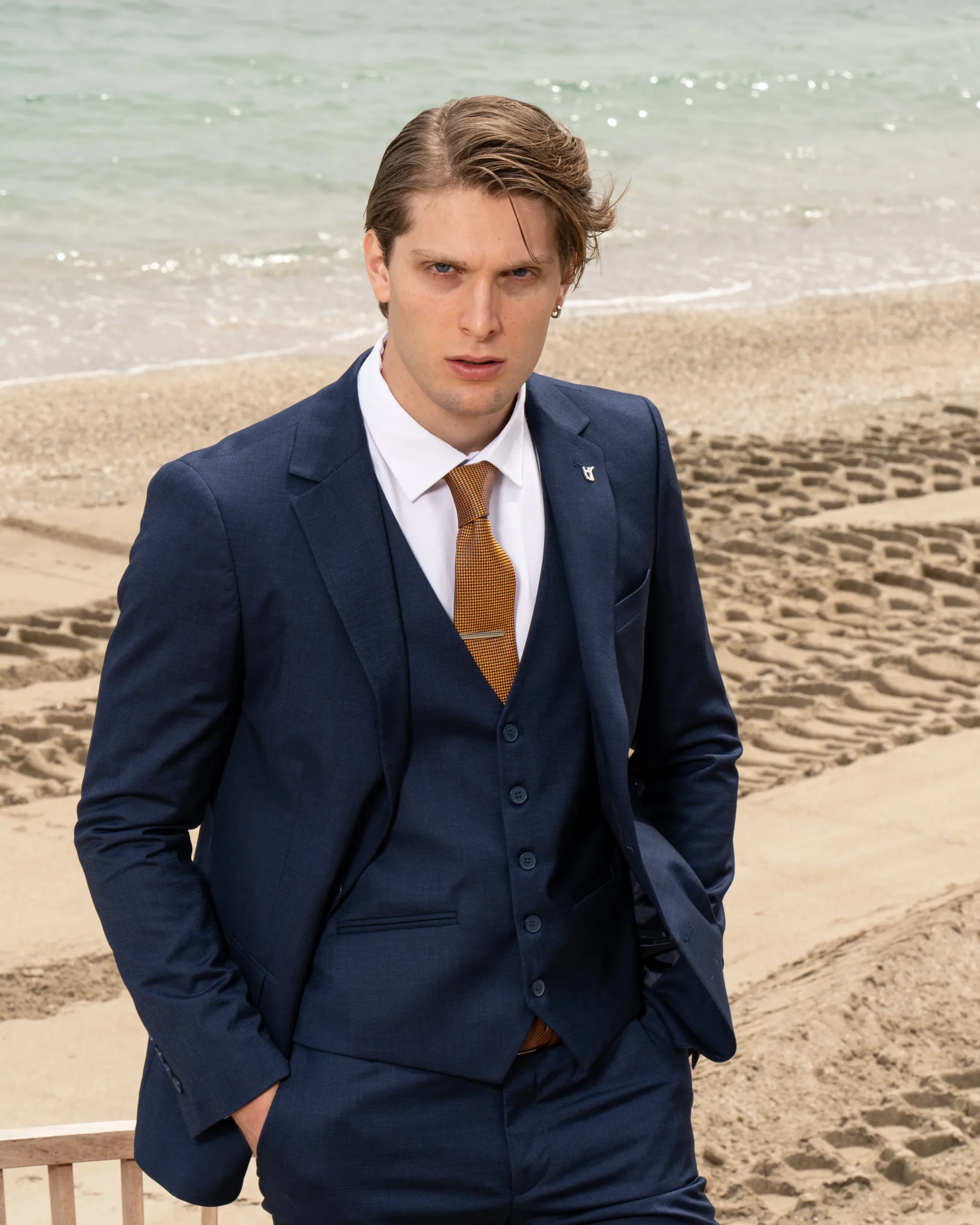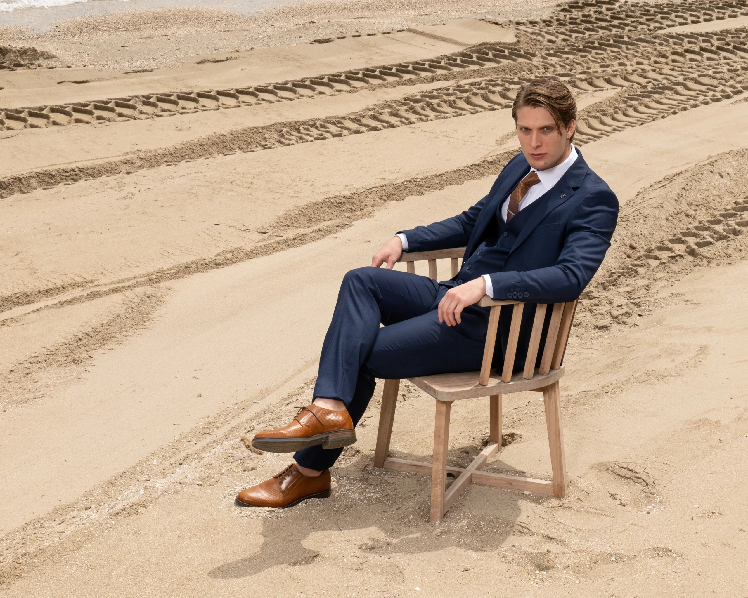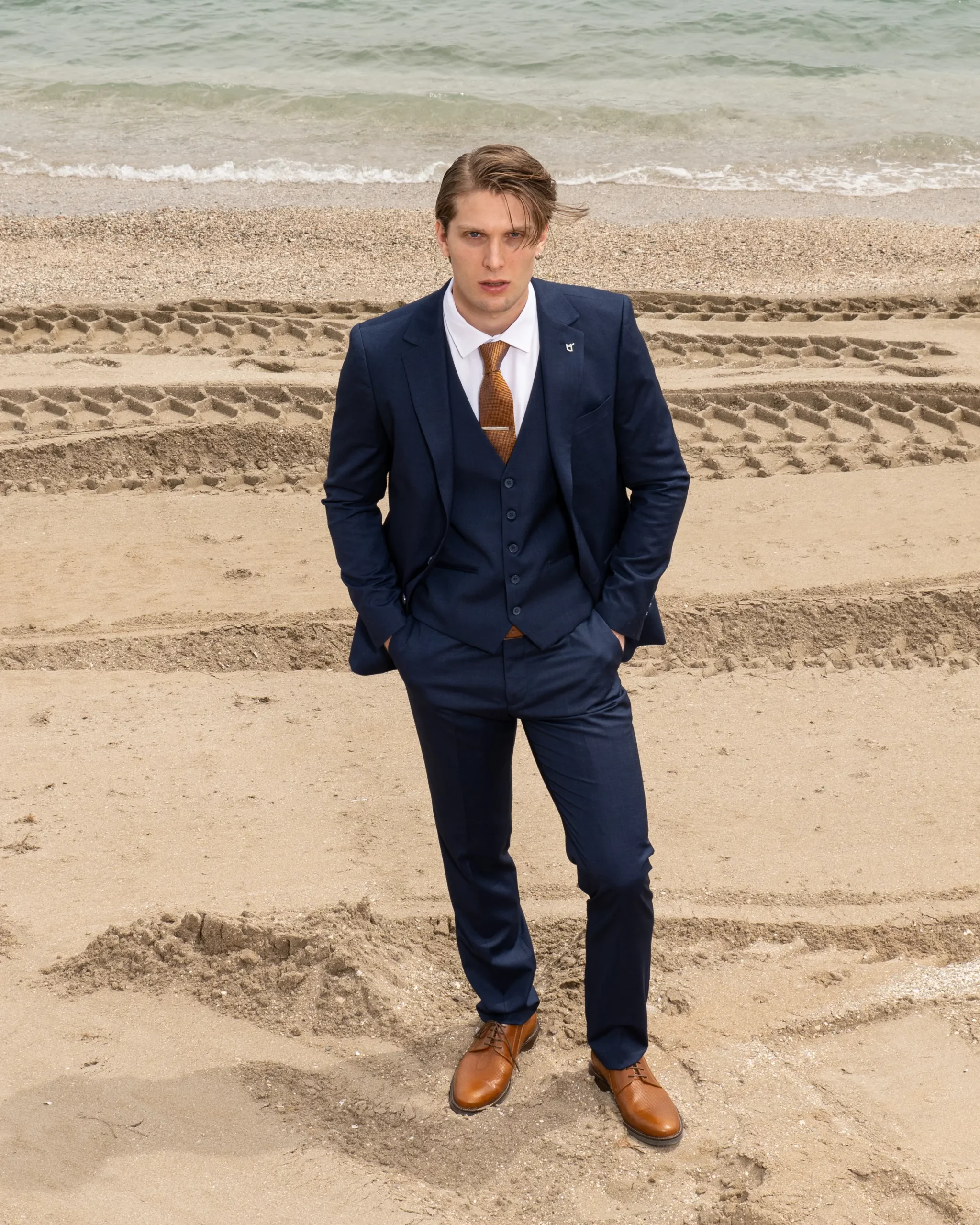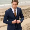 Το μπλε σακάκι και παντελόνι αποτελεί ένα κλασικό συνδυασμό που δεν έχει απογοητεύσει ποτέ, ενώ η ταμπά γραβάτα προσφέρει μία κομψότητα και διαχρονικό κύρος που ολοκληρώνει την εμφάνιση.