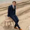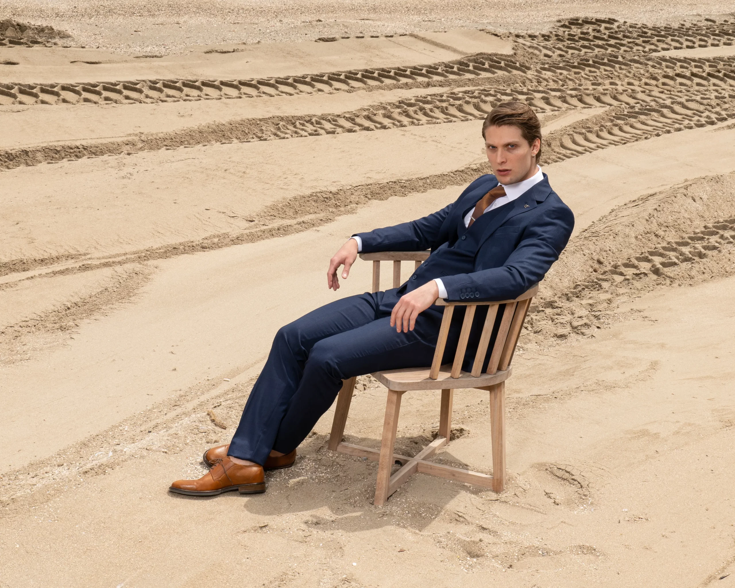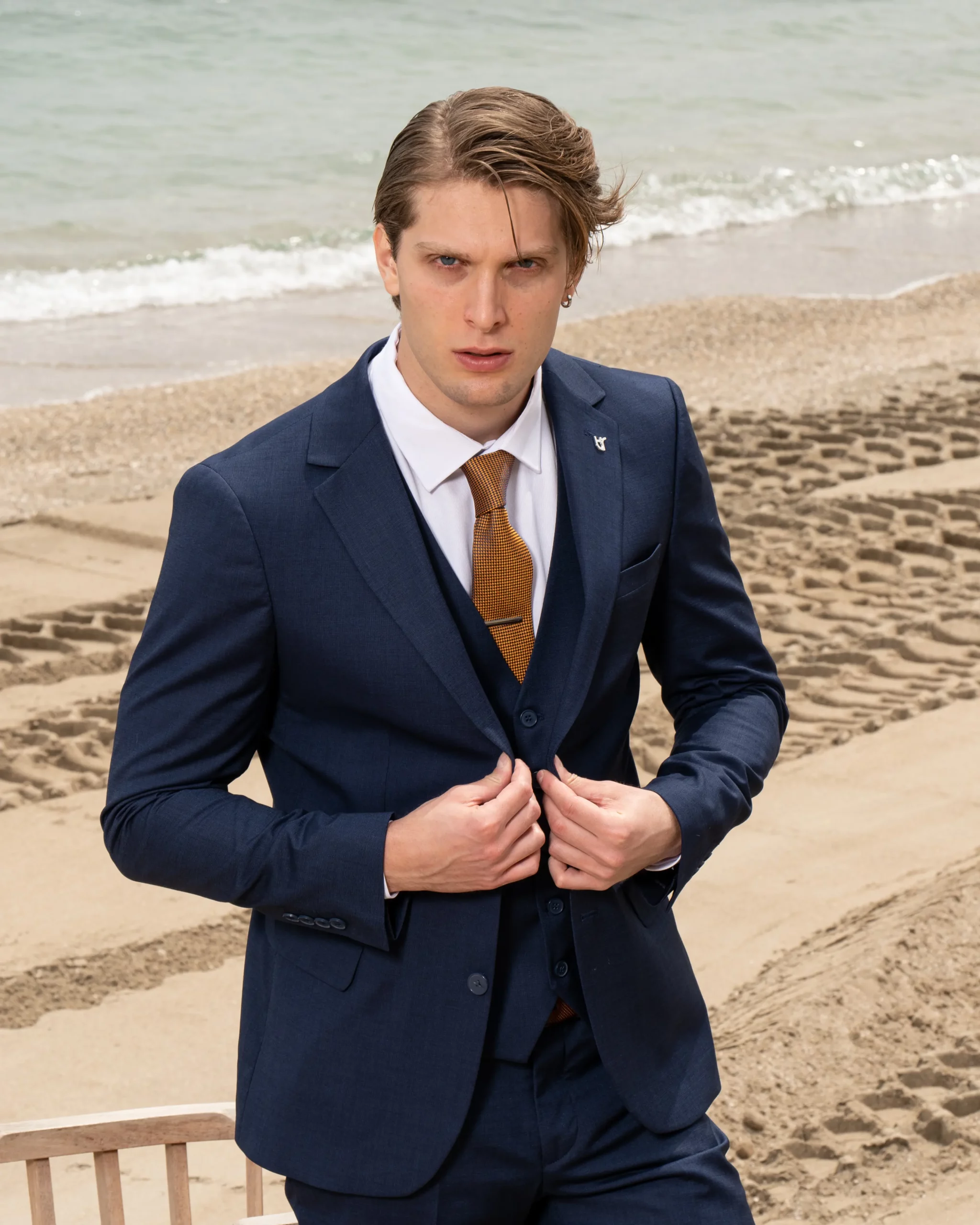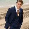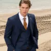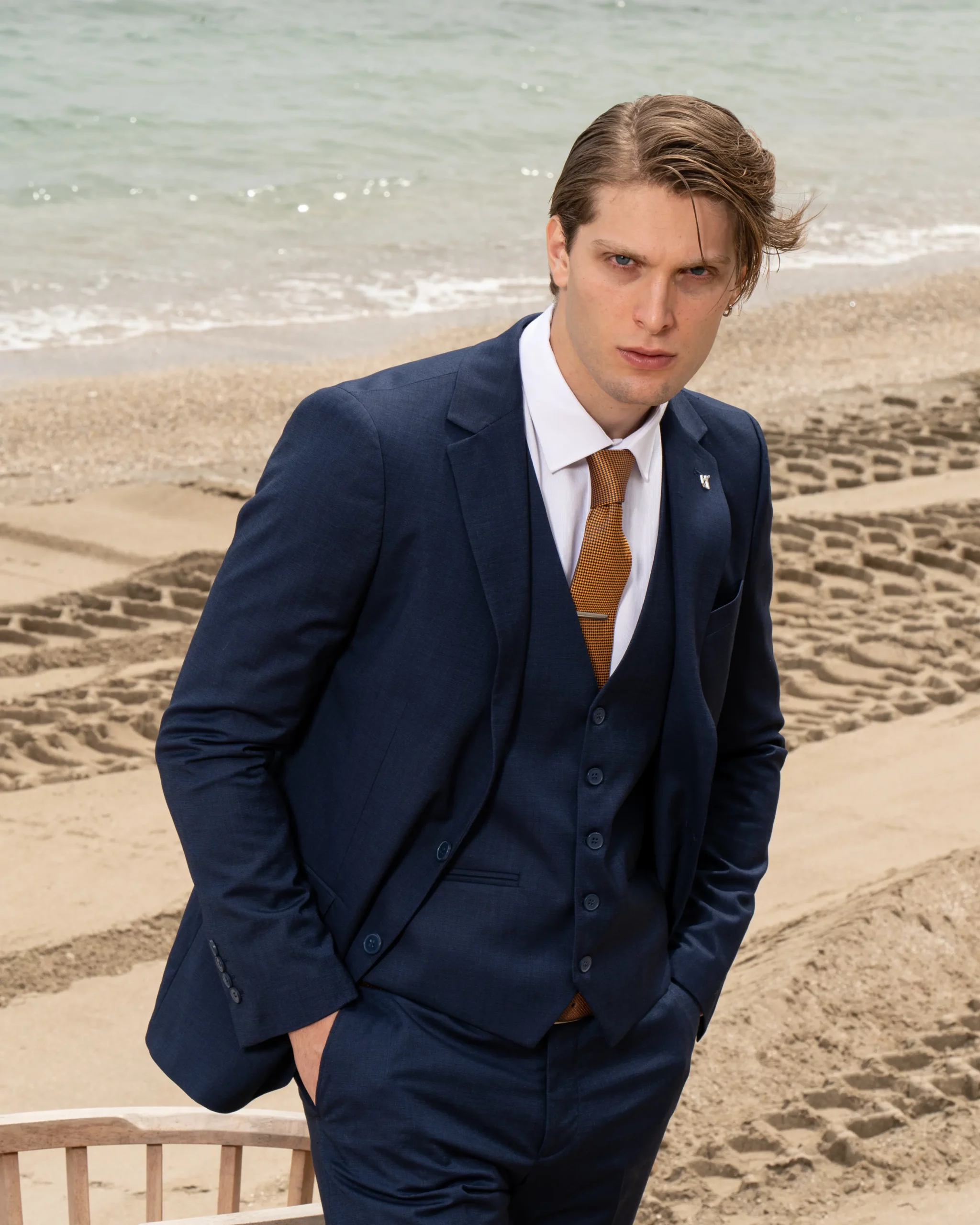 Το μπλε σακάκι και παντελόνι αποτελεί ένα κλασικό συνδυασμό που δεν έχει απογοητεύσει ποτέ, ενώ η ταμπά γραβάτα προσφέρει μία κομψότητα και διαχρονικό κύρος που ολοκληρώνει την εμφάνιση.