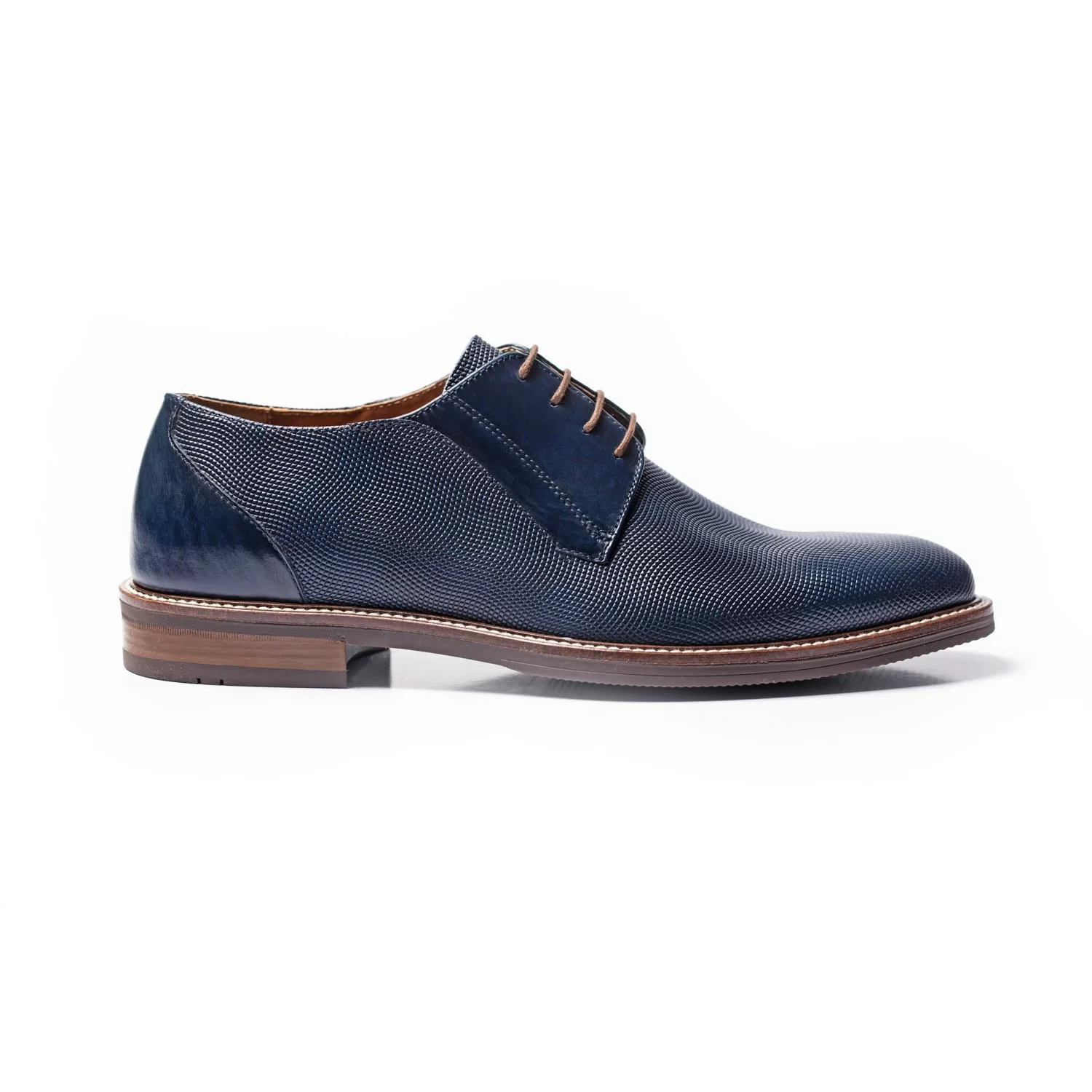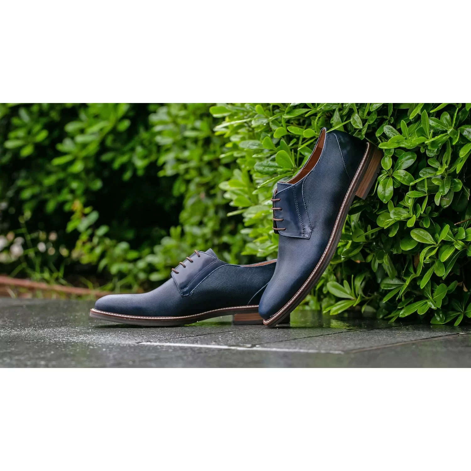 Στο ανάγλυφο άριστο δέρμα μοσχαριού Ιταλίας έχει δοθεί μια κάπως μακρόστενη σιλουέτα, η οποία καταλήγει σε μύτη σε σχήμα αμυγδάλου, ενώ αναδεικνύονται οι προσεγμένες ραφές. Αυτές επιτυγχάνουν την τέλεια αρμονία μεταξύ στιλιστικής καλαισθησίας και των προδιαγραφών υψηλής ποιότητας στην ανδρική μόδα. Αριστοτεχνικές πινελιές, όπως οι σχεδιαστικές εναλλαγές μεταξύ λείου και σταμπωτού δέρματος, προσθέτουν επιπλέον πολυτέλεια και στυλ.