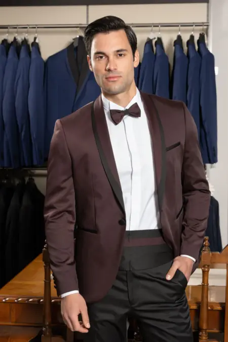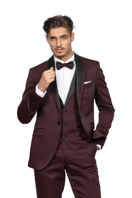Κοστούμι Ανδρικό Μπορντό Με Στρογγυλό Πέτο Μαύρο Παπιγιόν και Μπορντό Γιλέκο 170