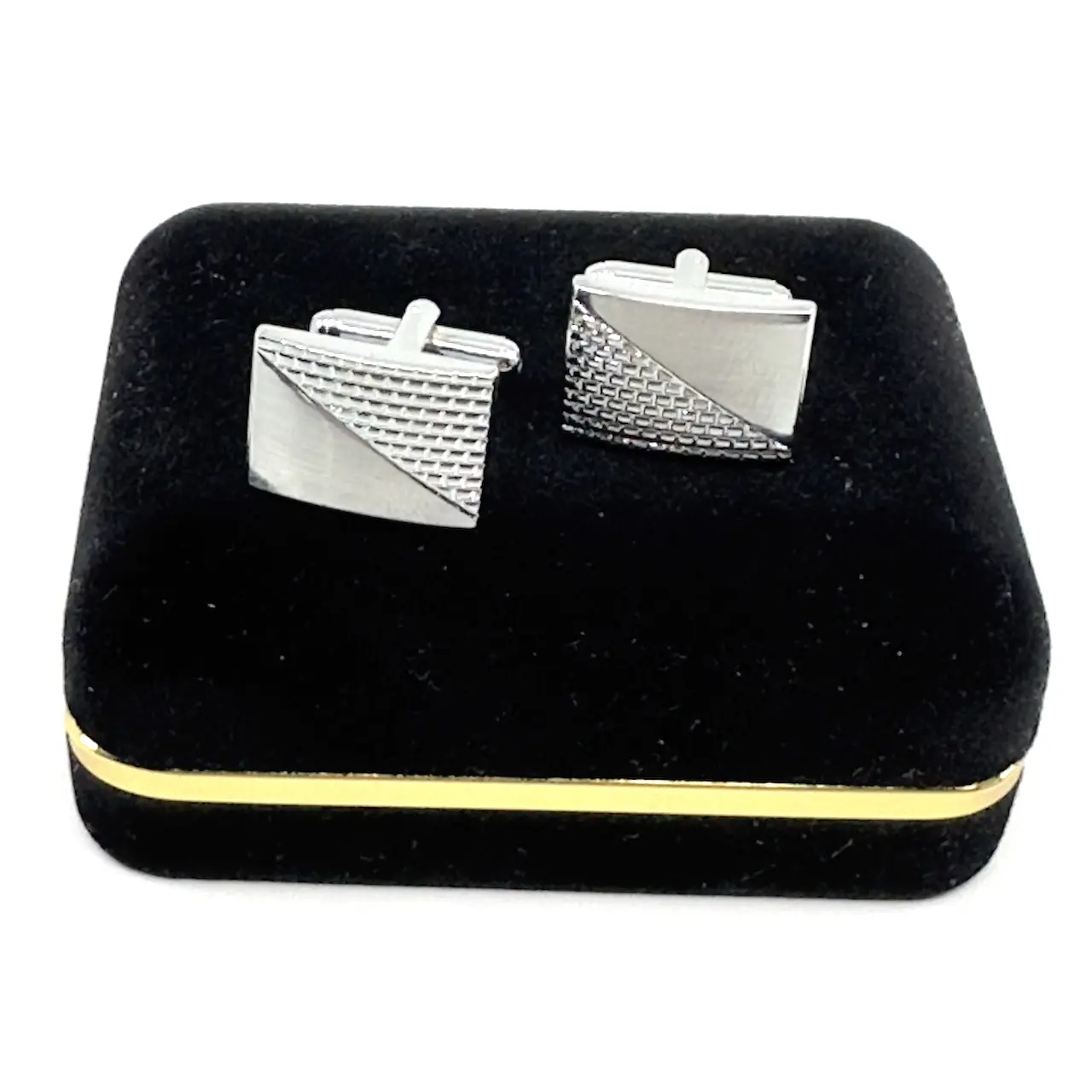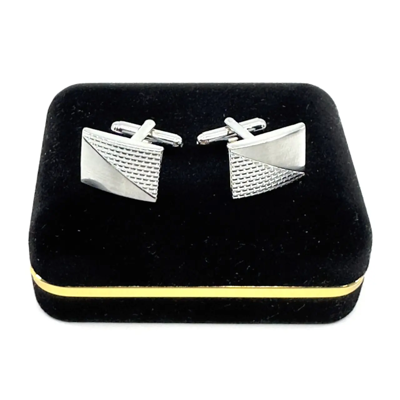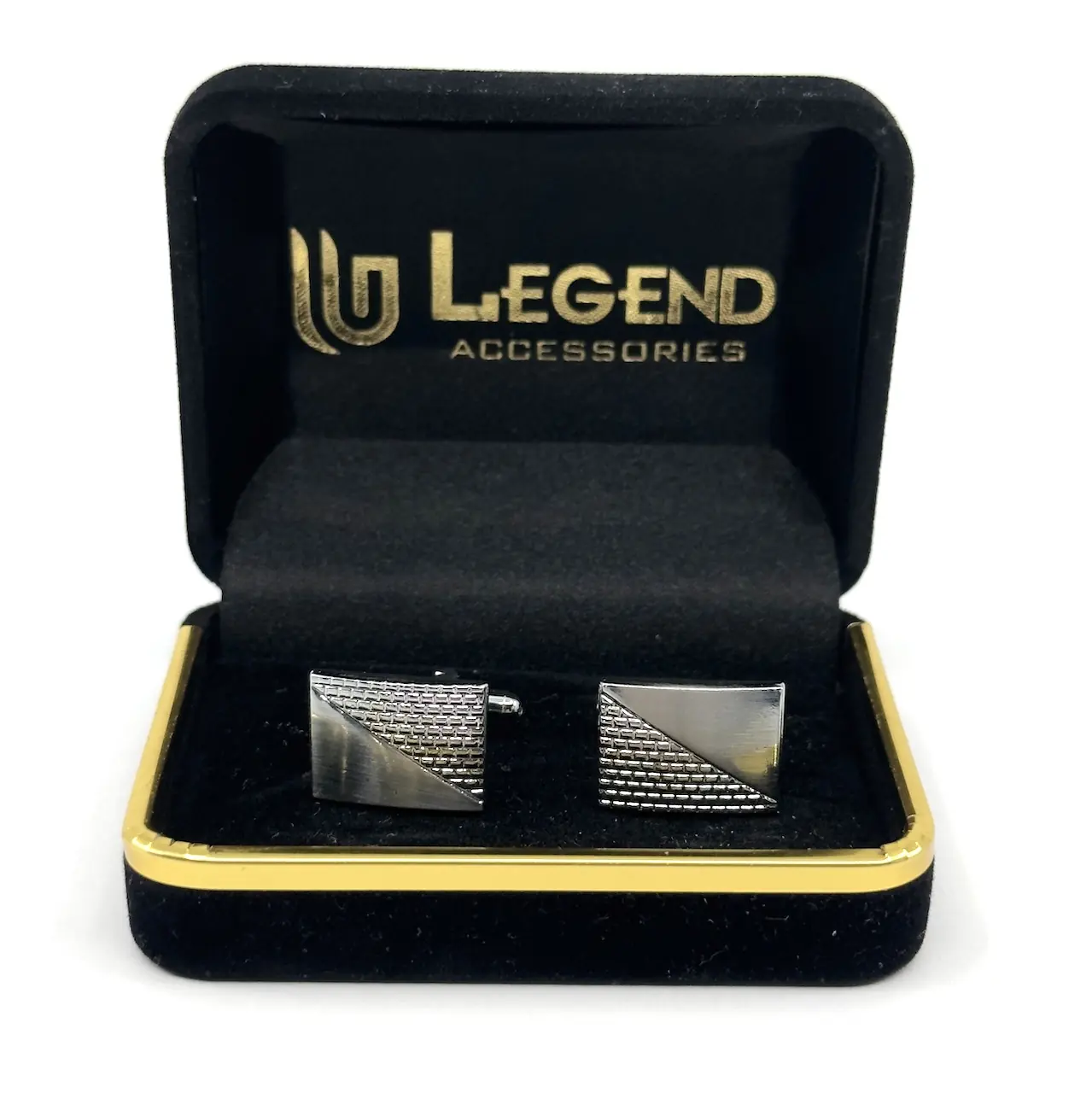 Κλασσικά μεταλλικά μανικετόκουμπα Legend Accessories, συσκευασμένα σε βελούδινο κουτάκι πολυτελείας.