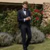 Μοντέρνο γαμπριάτικο κοστούμι σε μοντέρνα slim fit γραμμή, με αφαιρούμενα μαύρα πέτα.