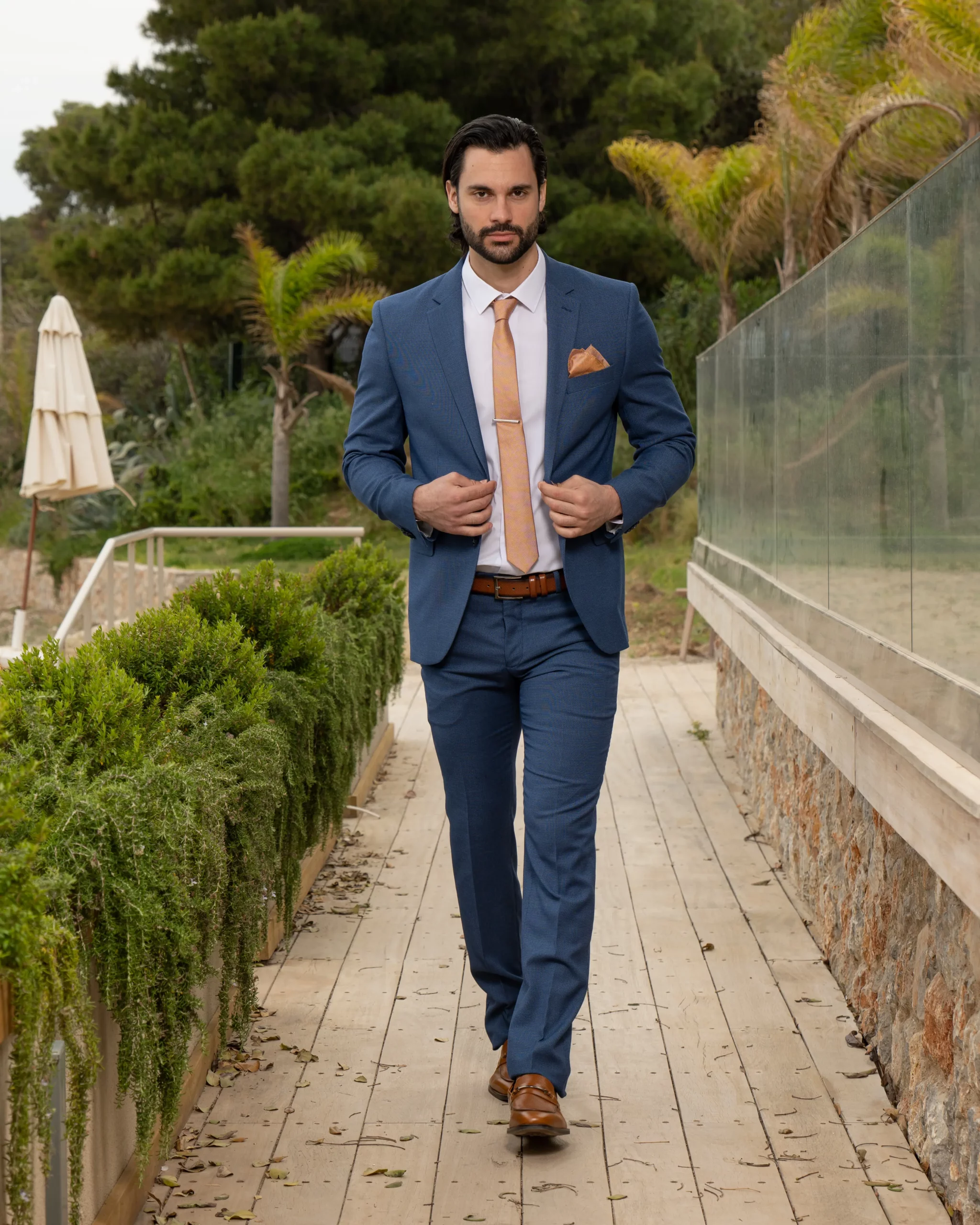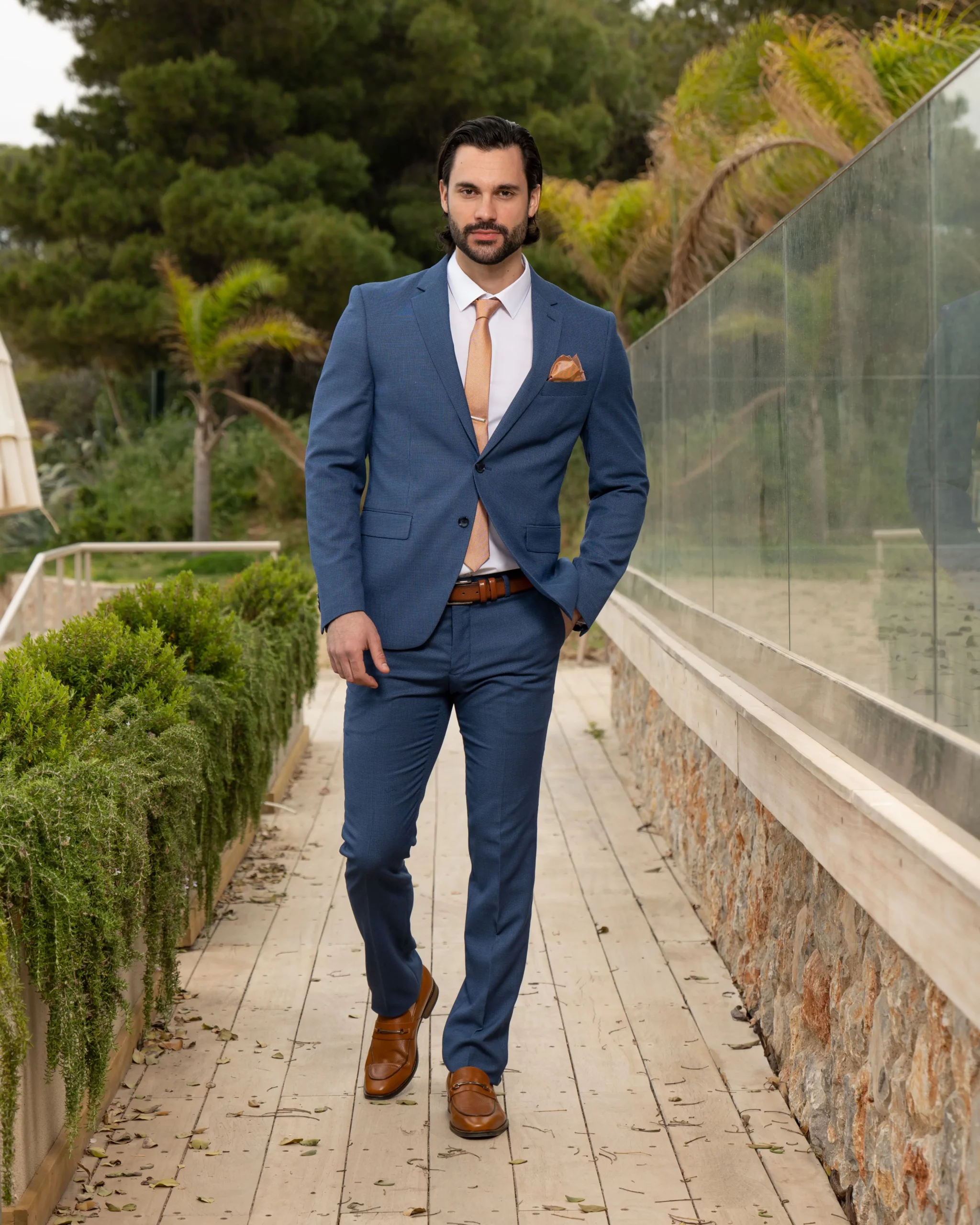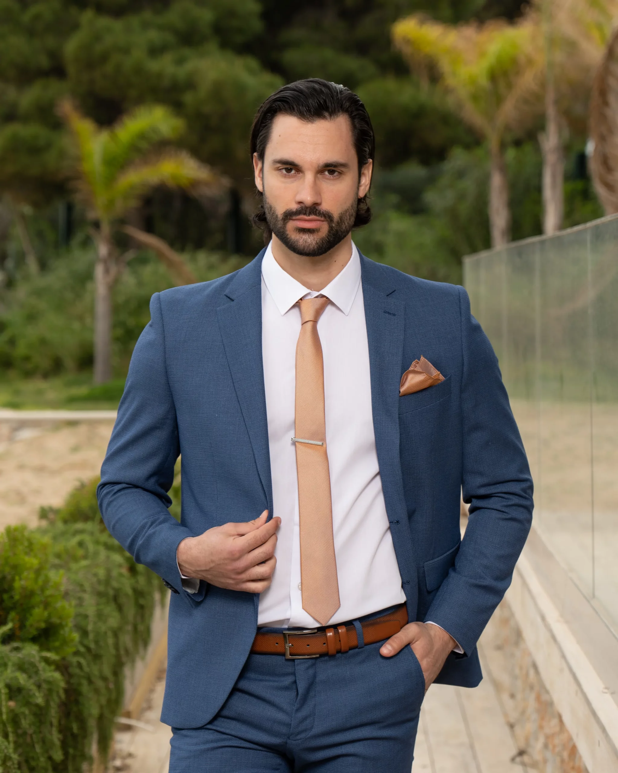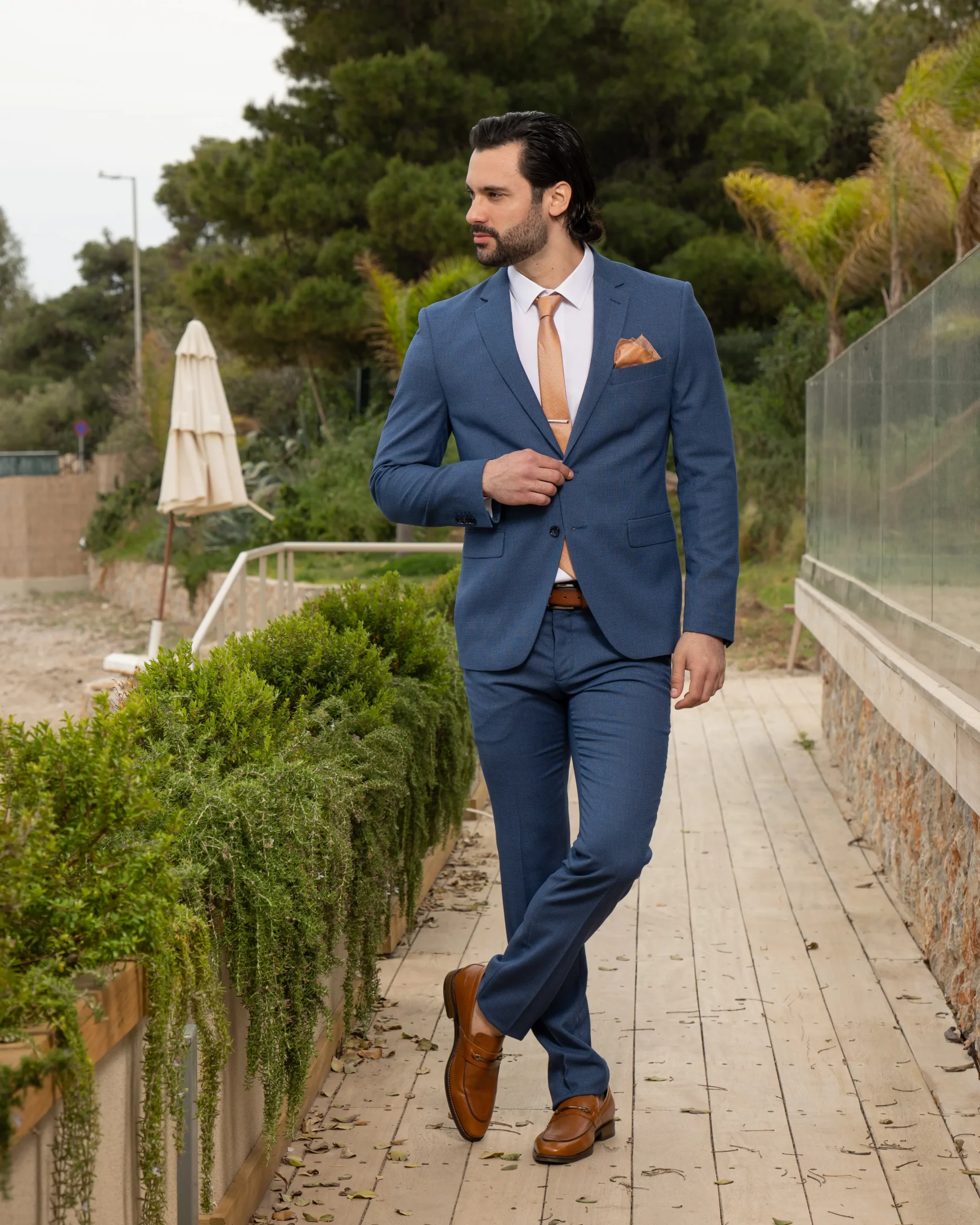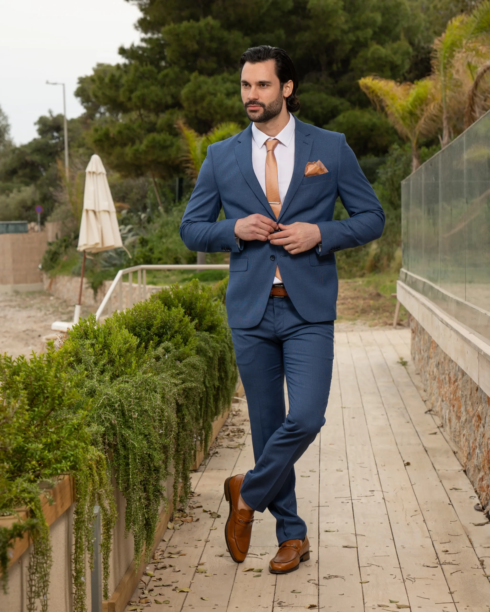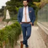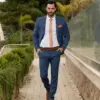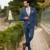 Το μπλε σακάκι και παντελόνι είναι διαχρονική επιλογή και αγαπημένος συνδυασμός. Η slim fit γραμμή του έρχεται και αγκαλιάζει το σώμα κολακεύοντας τη φιγούρα σας. Επιπρόσθετα η απόχρωση του κοστουμιού του δίνει την ευελιξία να μπορεί να συνδυαστεί και με άλλα κομμάτια της γκαρνταρόμπας σας για ένα μοναδικό λουκ.