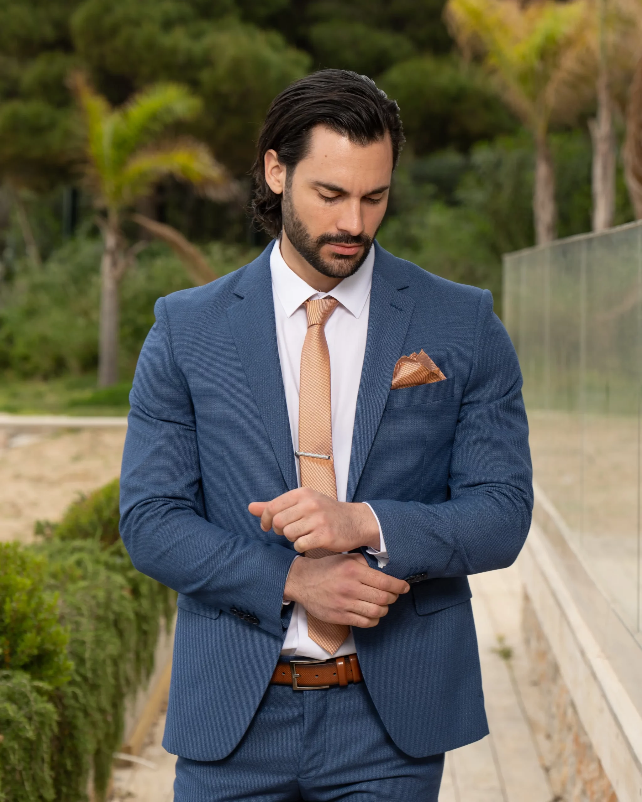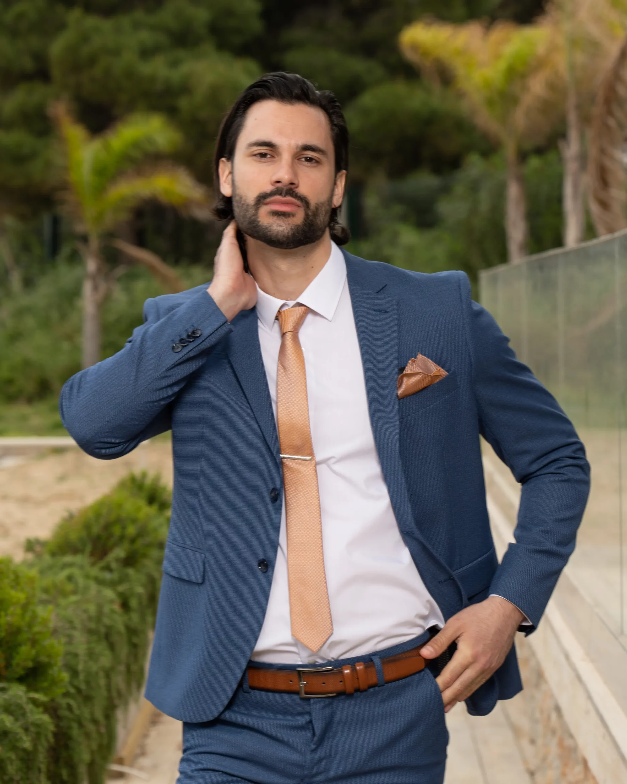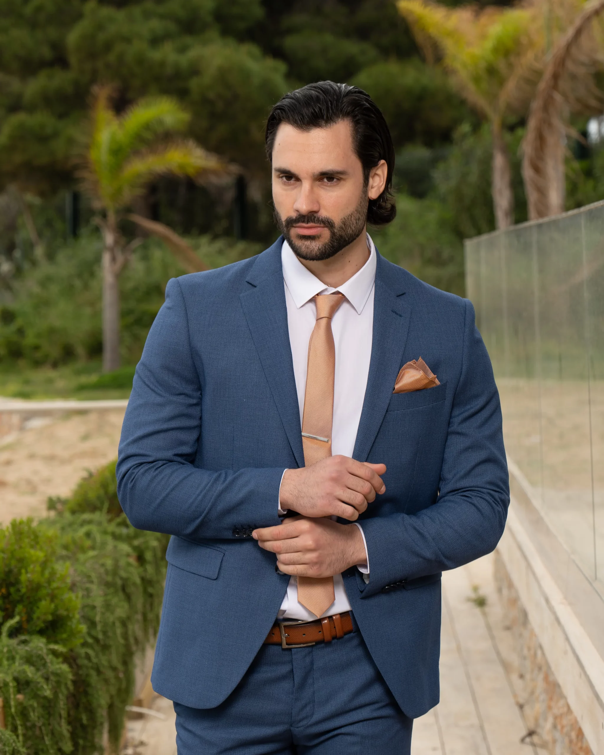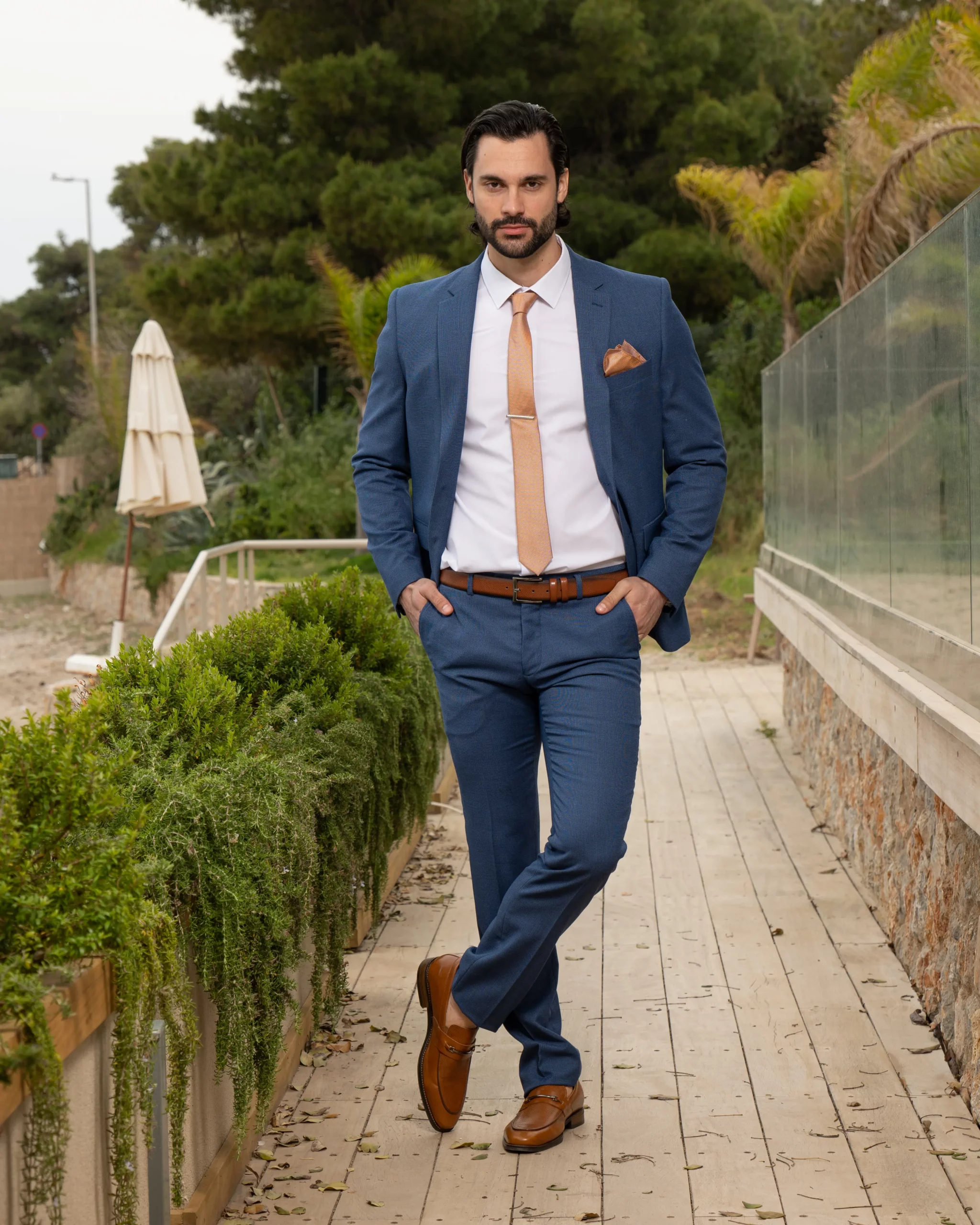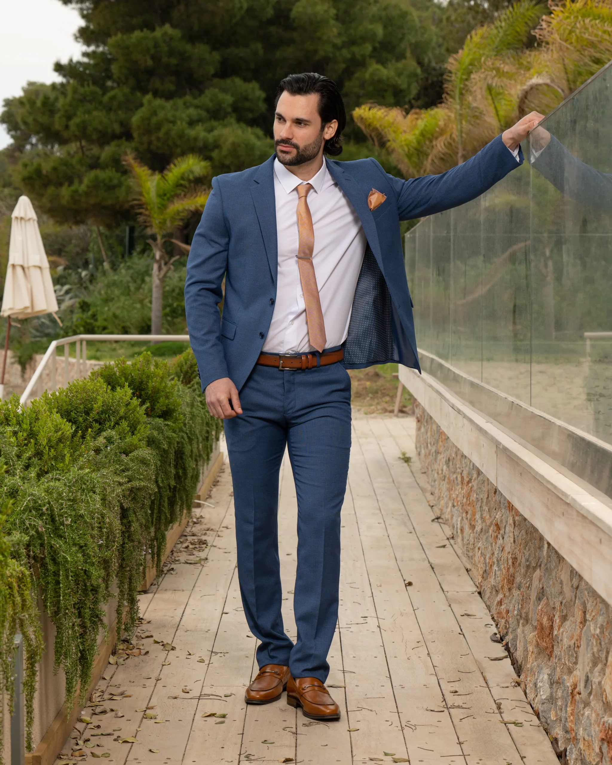 Το μπλε σακάκι και παντελόνι είναι διαχρονική επιλογή και αγαπημένος συνδυασμός. Η slim fit γραμμή του έρχεται και αγκαλιάζει το σώμα κολακεύοντας τη φιγούρα σας. Επιπρόσθετα η απόχρωση του κοστουμιού του δίνει την ευελιξία να μπορεί να συνδυαστεί και με άλλα κομμάτια της γκαρνταρόμπας σας για ένα μοναδικό λουκ.