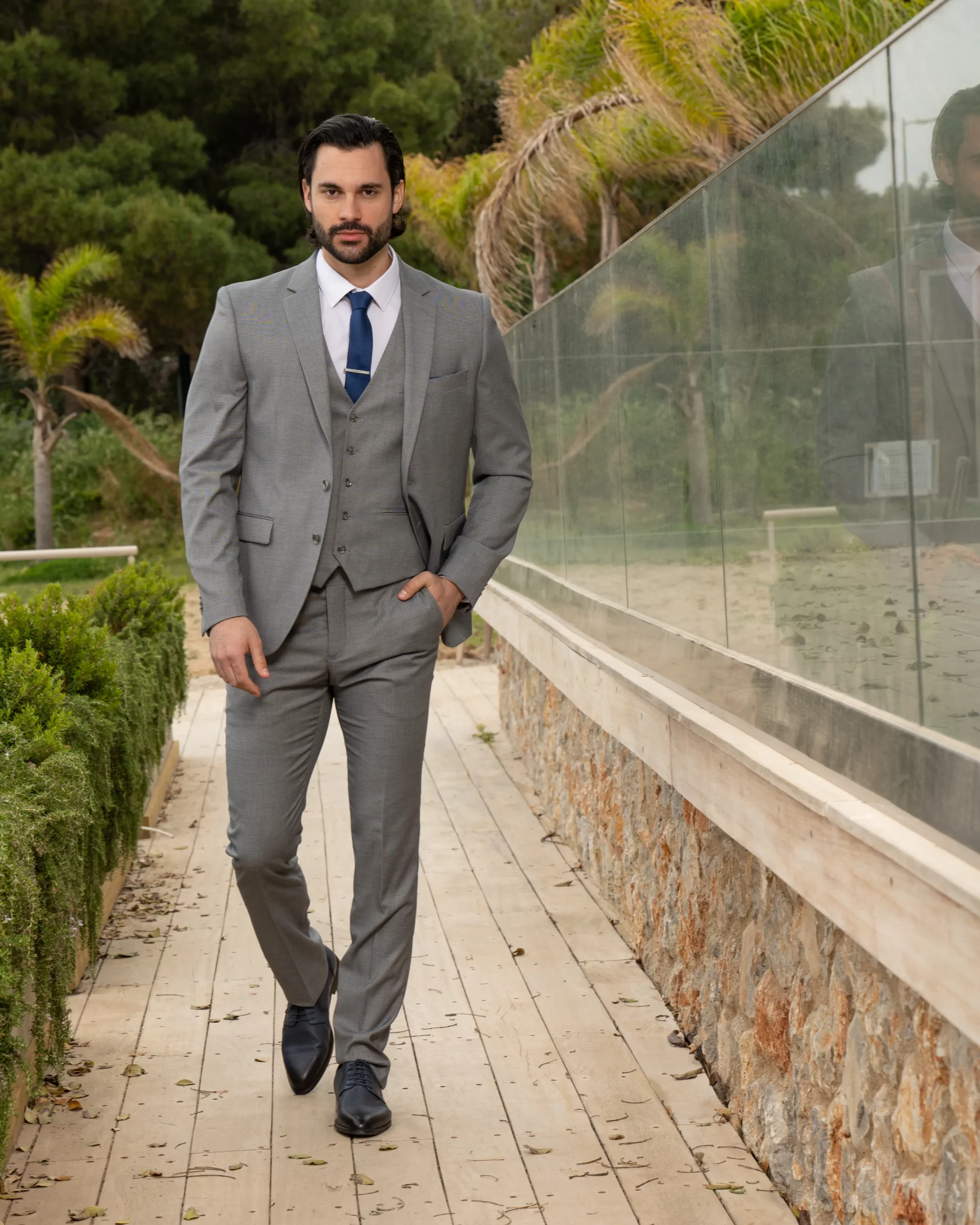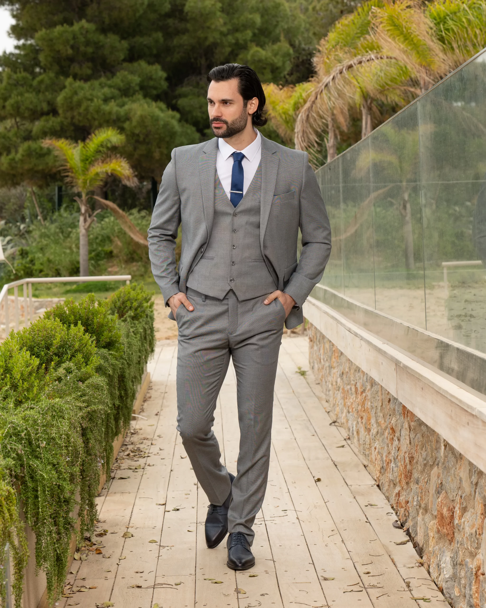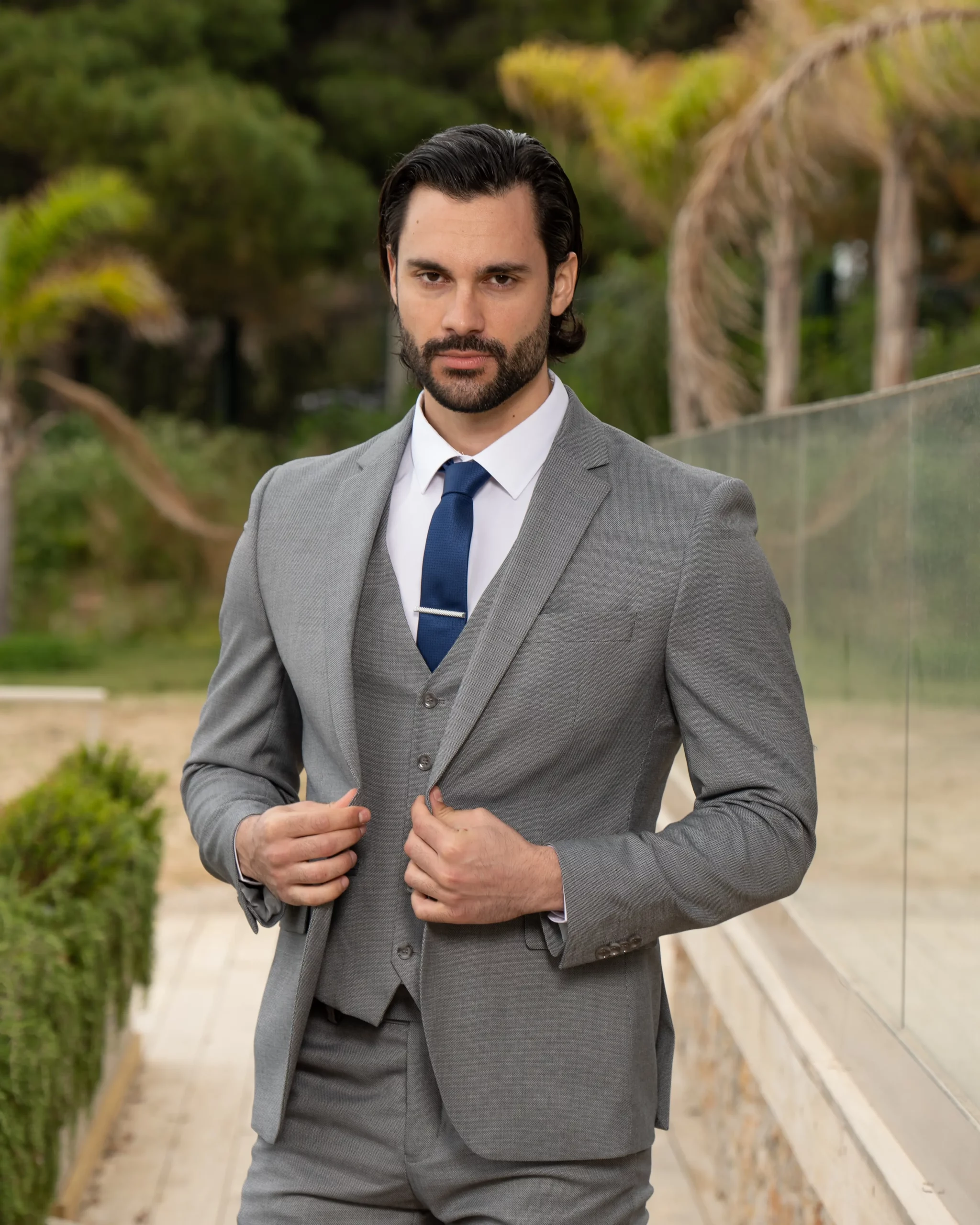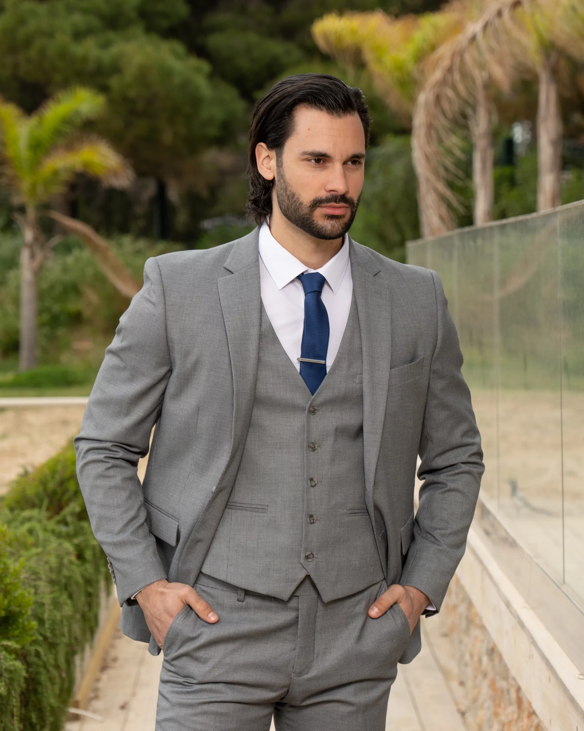 Το γκρι σακάκι και παντελόνι αποτελεί ένα κλασικό συνδυασμό που δεν έχει απογοητεύσει ποτέ, ενώ ο συνδυασμός με την μπλε γραβάτα δίνει κύρος και κομψότητα αντάξια ενός καλού κοστουμιού.
