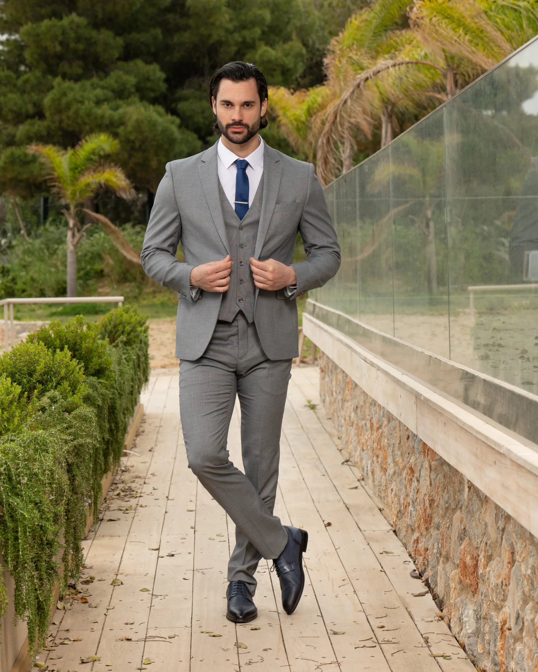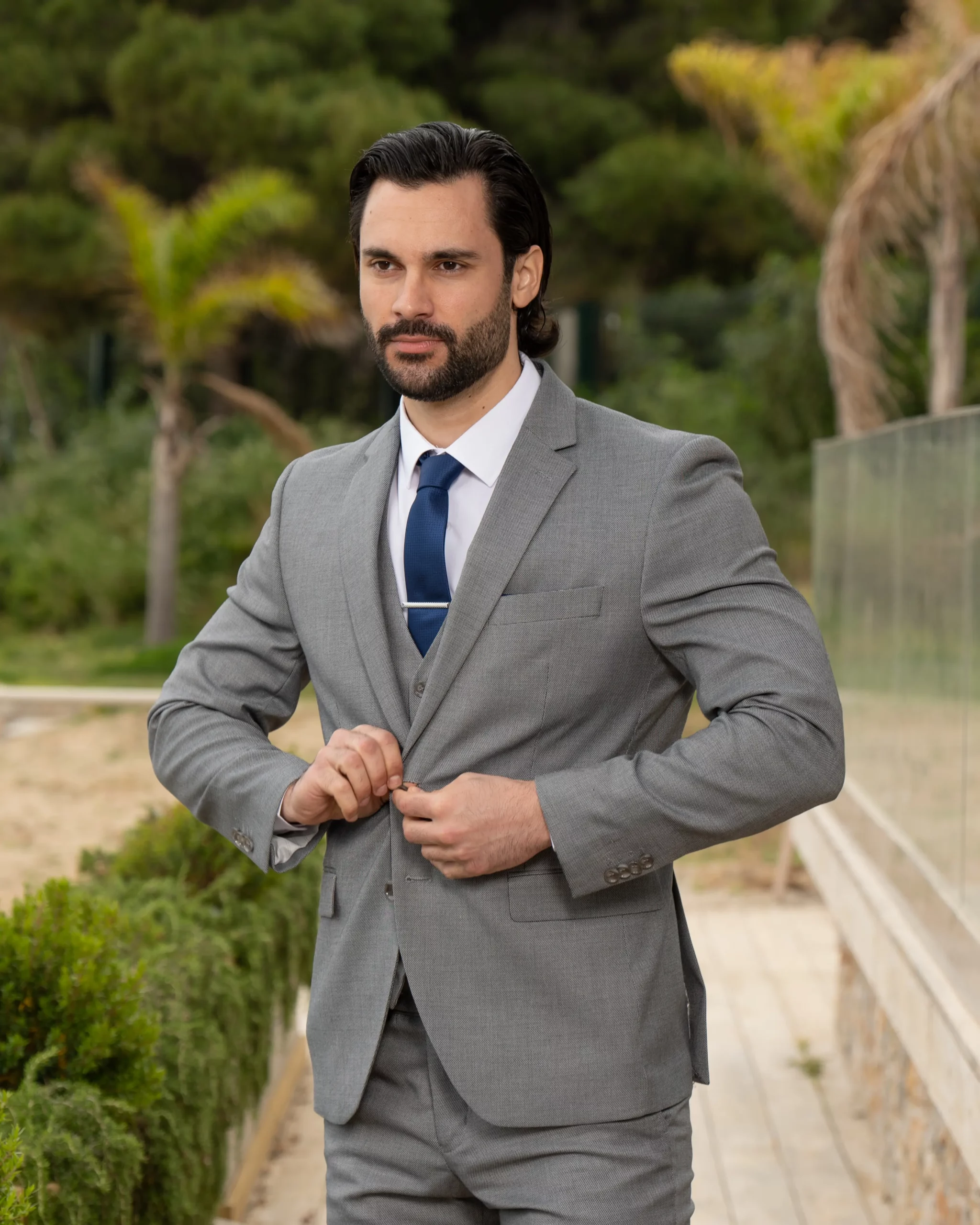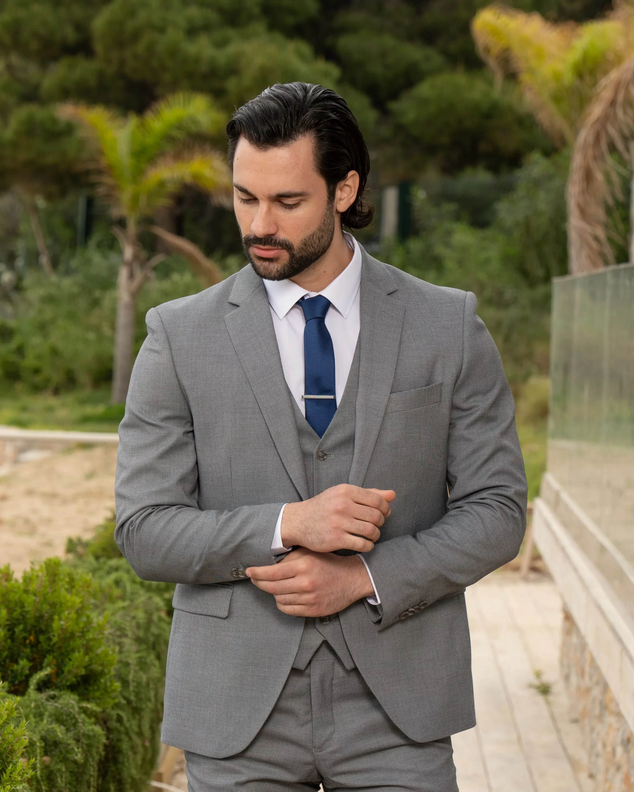 Το γκρι σακάκι και παντελόνι αποτελεί ένα κλασικό συνδυασμό που δεν έχει απογοητεύσει ποτέ, ενώ ο συνδυασμός με την μπλε γραβάτα δίνει κύρος και κομψότητα αντάξια ενός καλού κοστουμιού.