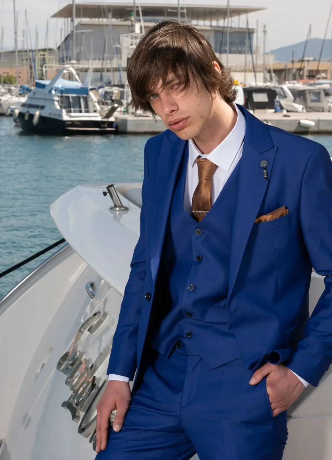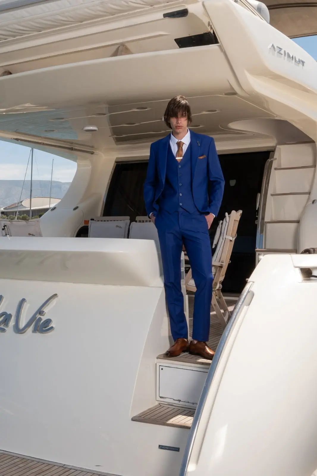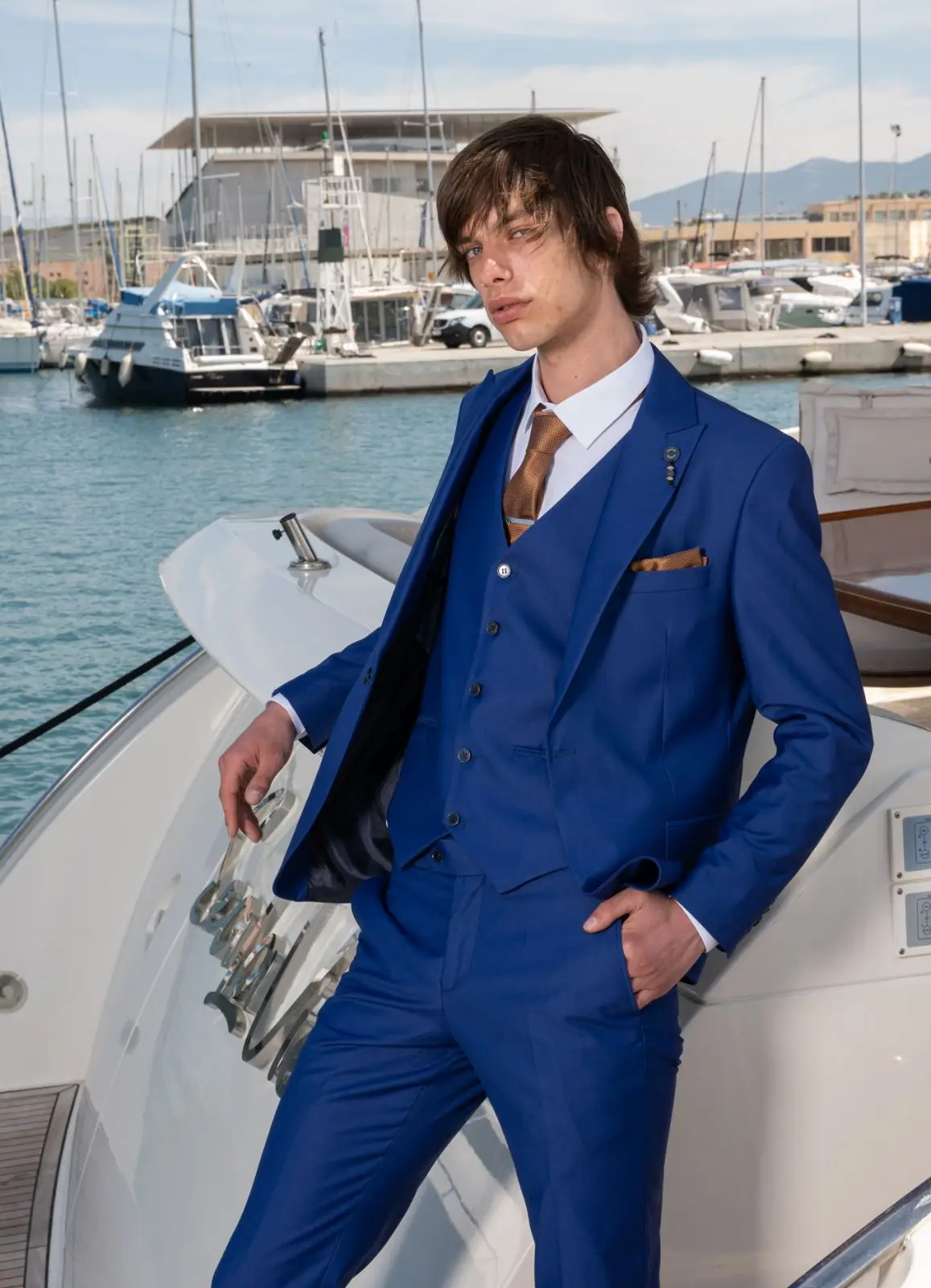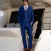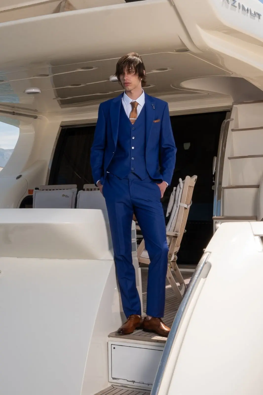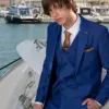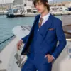 Η πιο μοντέρνα απόχρωση του Μπλε, η γραμμή είναι μοντέρνα slim fit και η τιμή αφορά σακάκι, παντελόνι και γιλέκο.