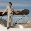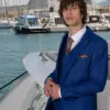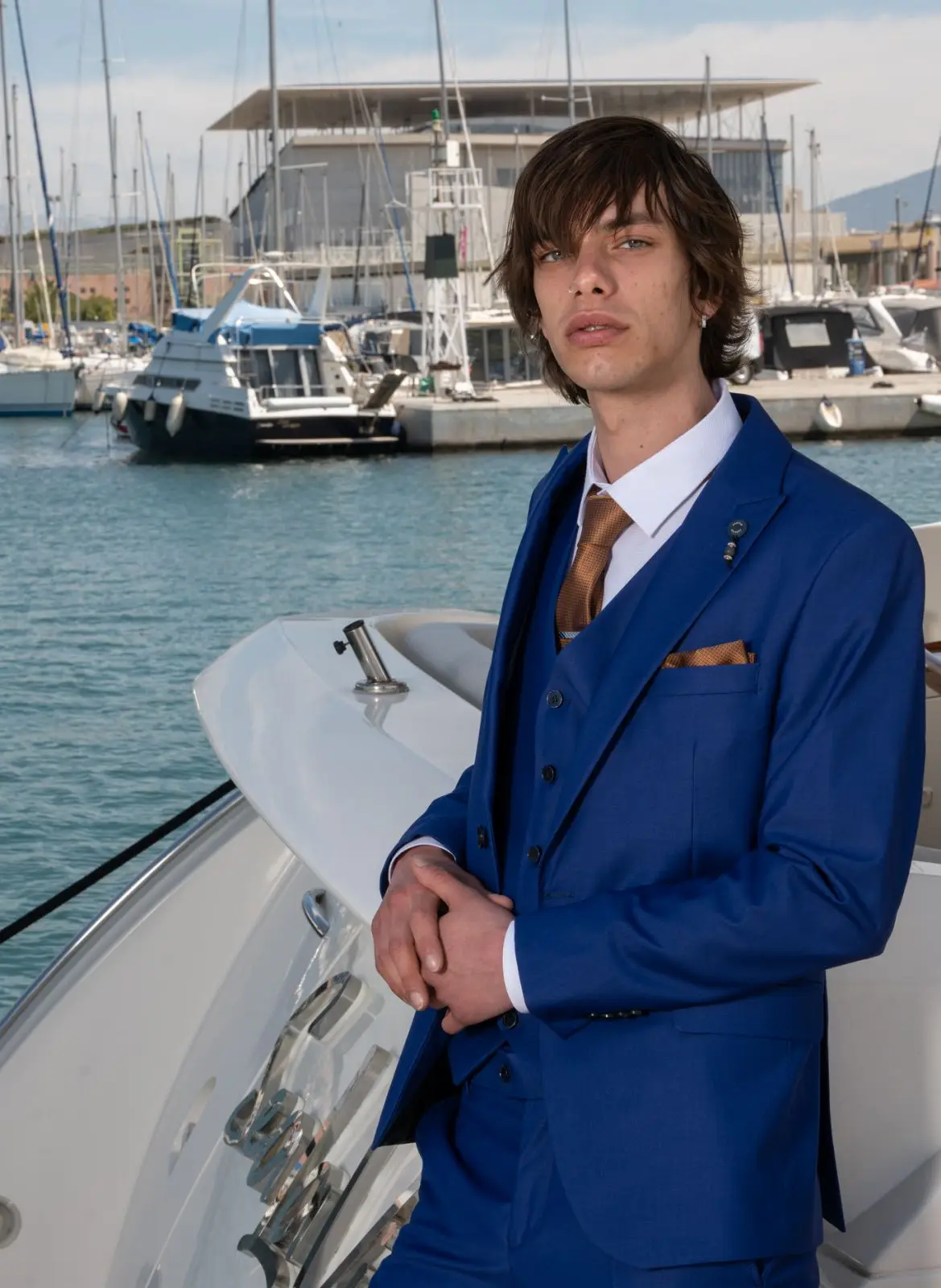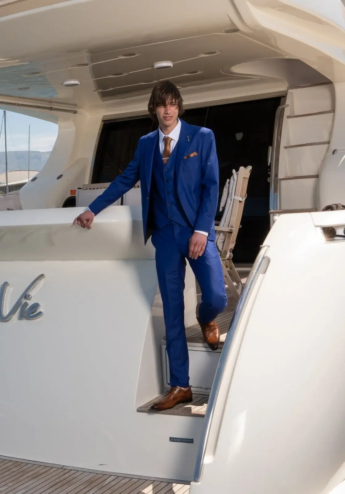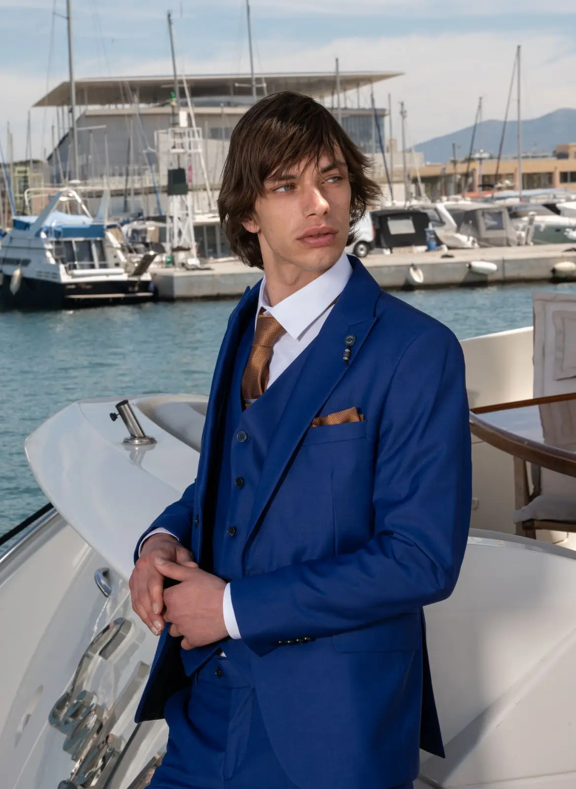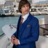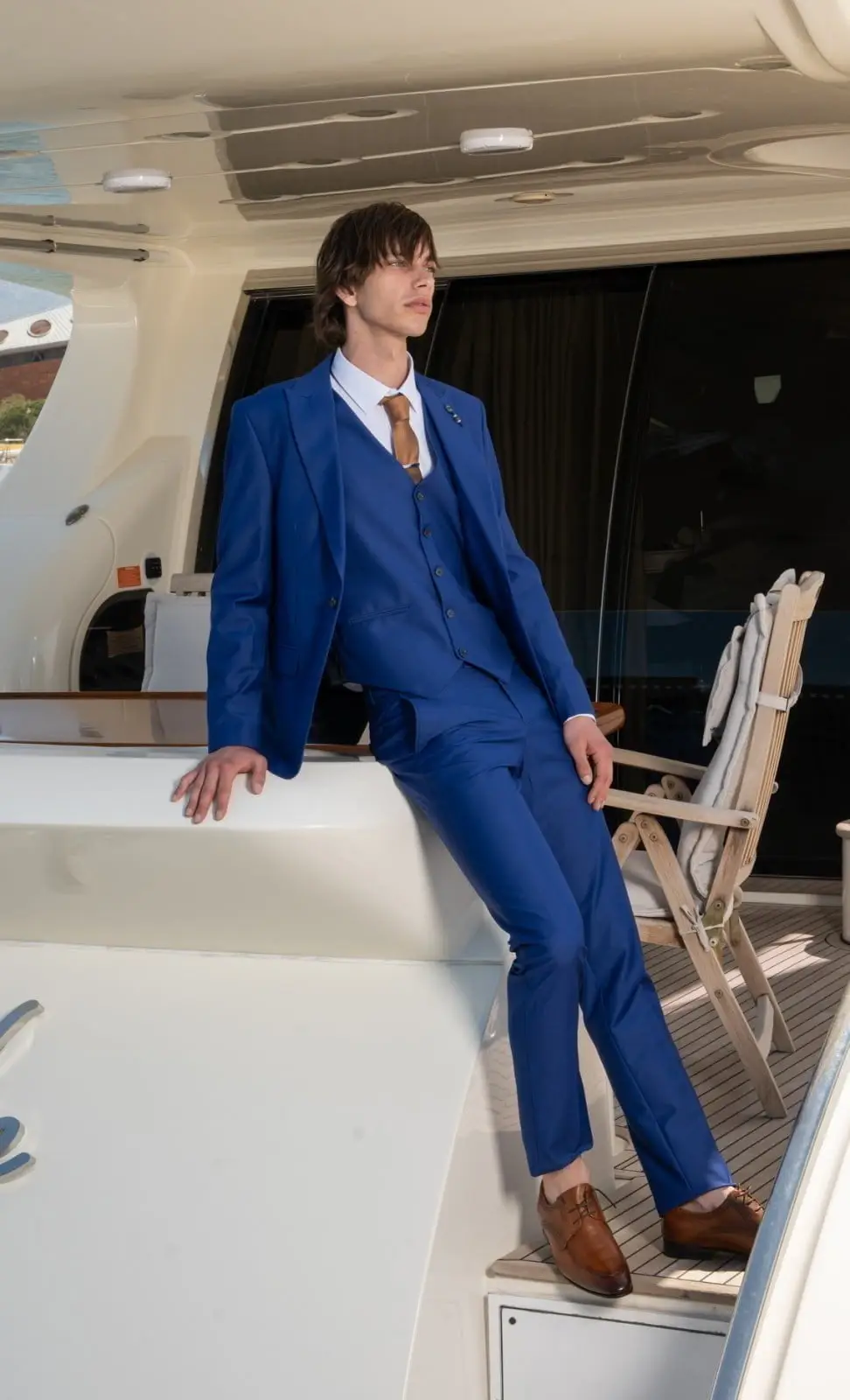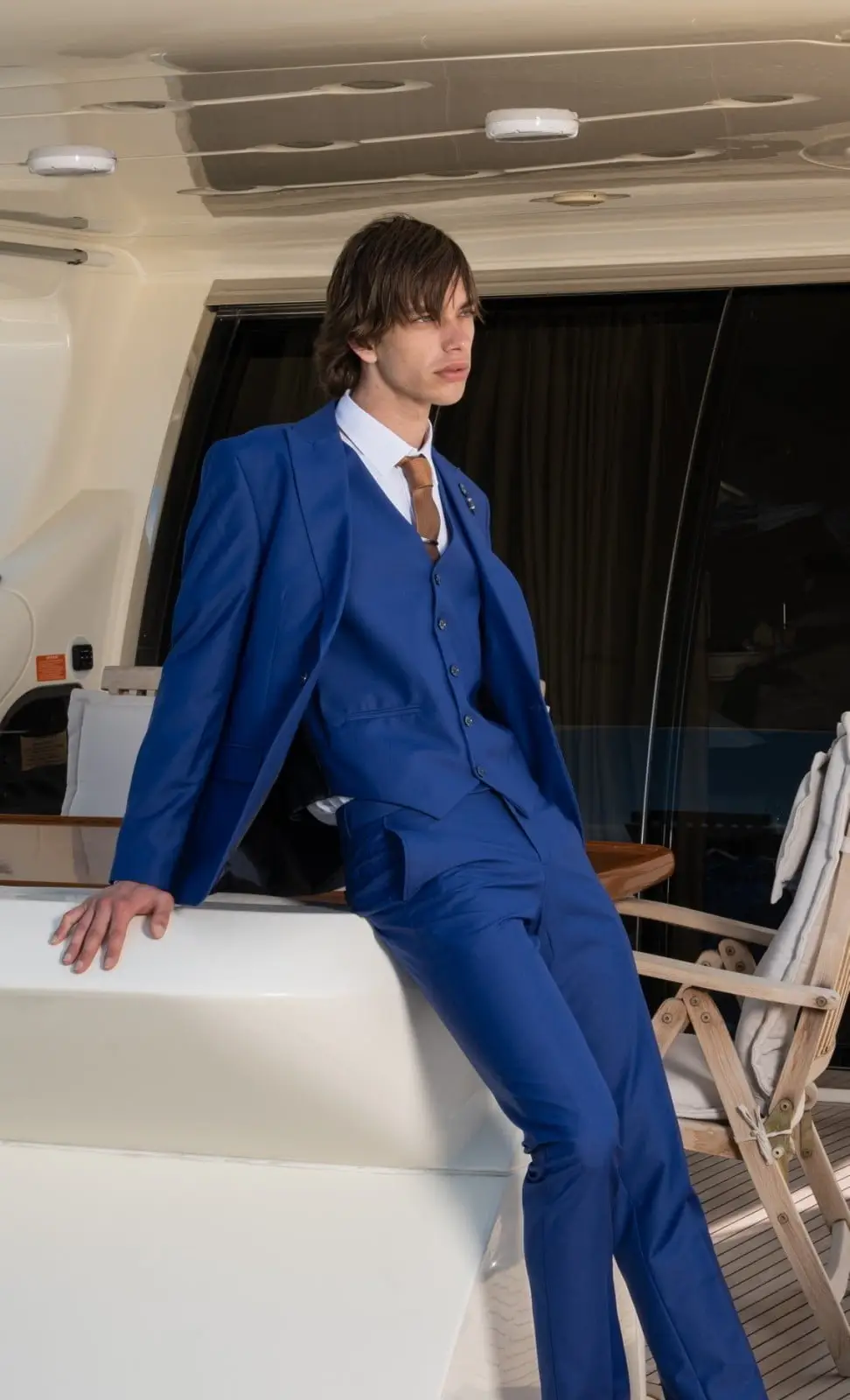 Η πιο μοντέρνα απόχρωση του Μπλε, η γραμμή είναι μοντέρνα slim fit και η τιμή αφορά σακάκι, παντελόνι και γιλέκο.