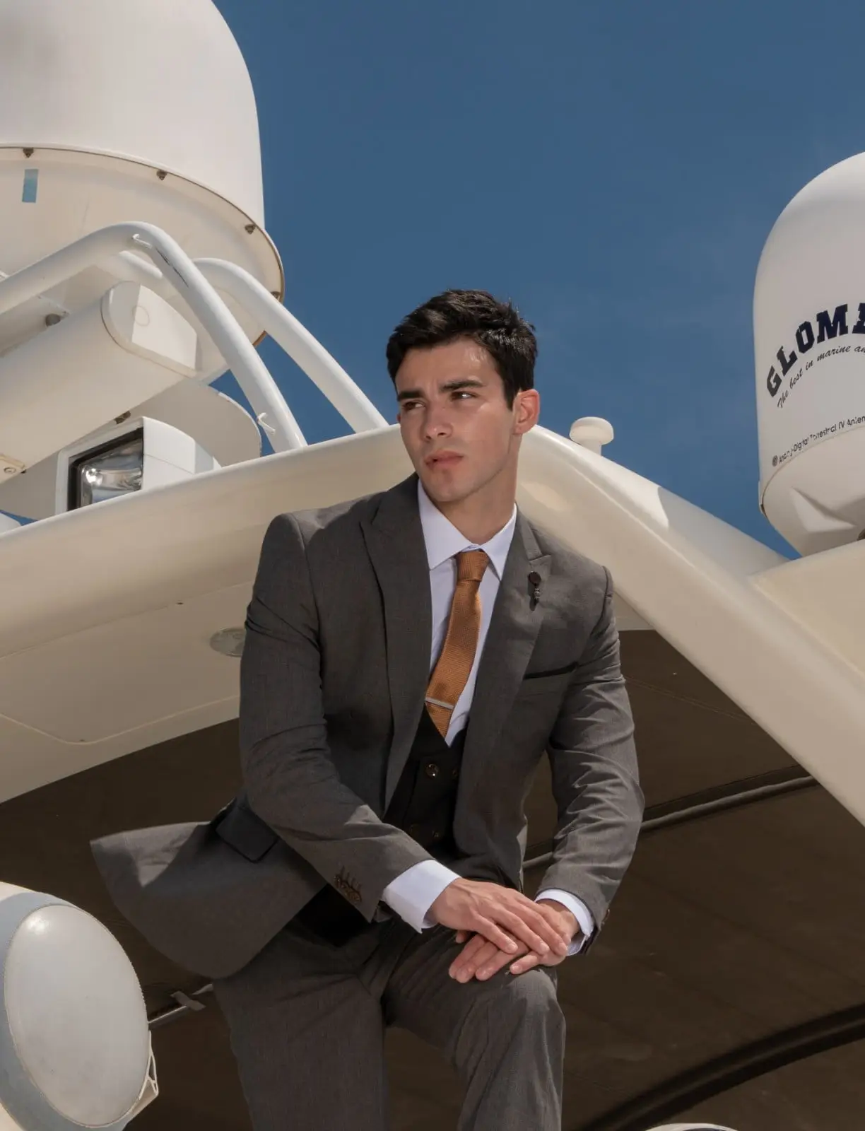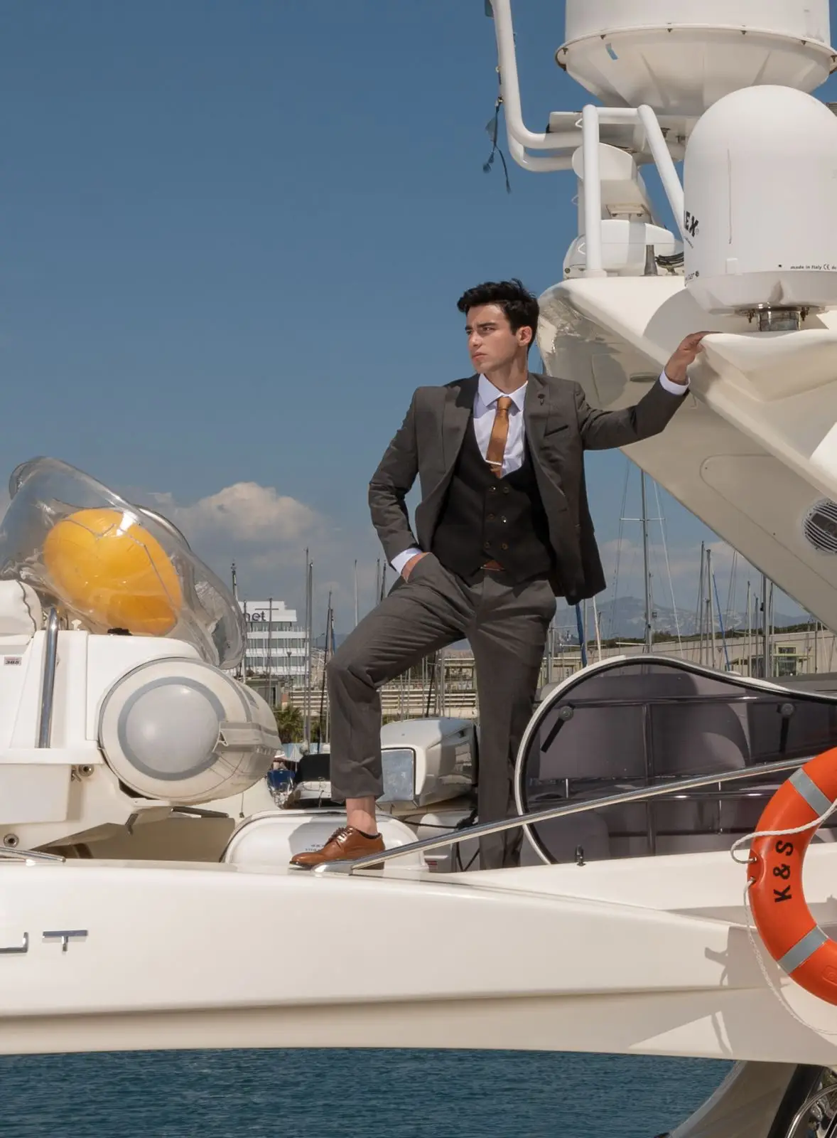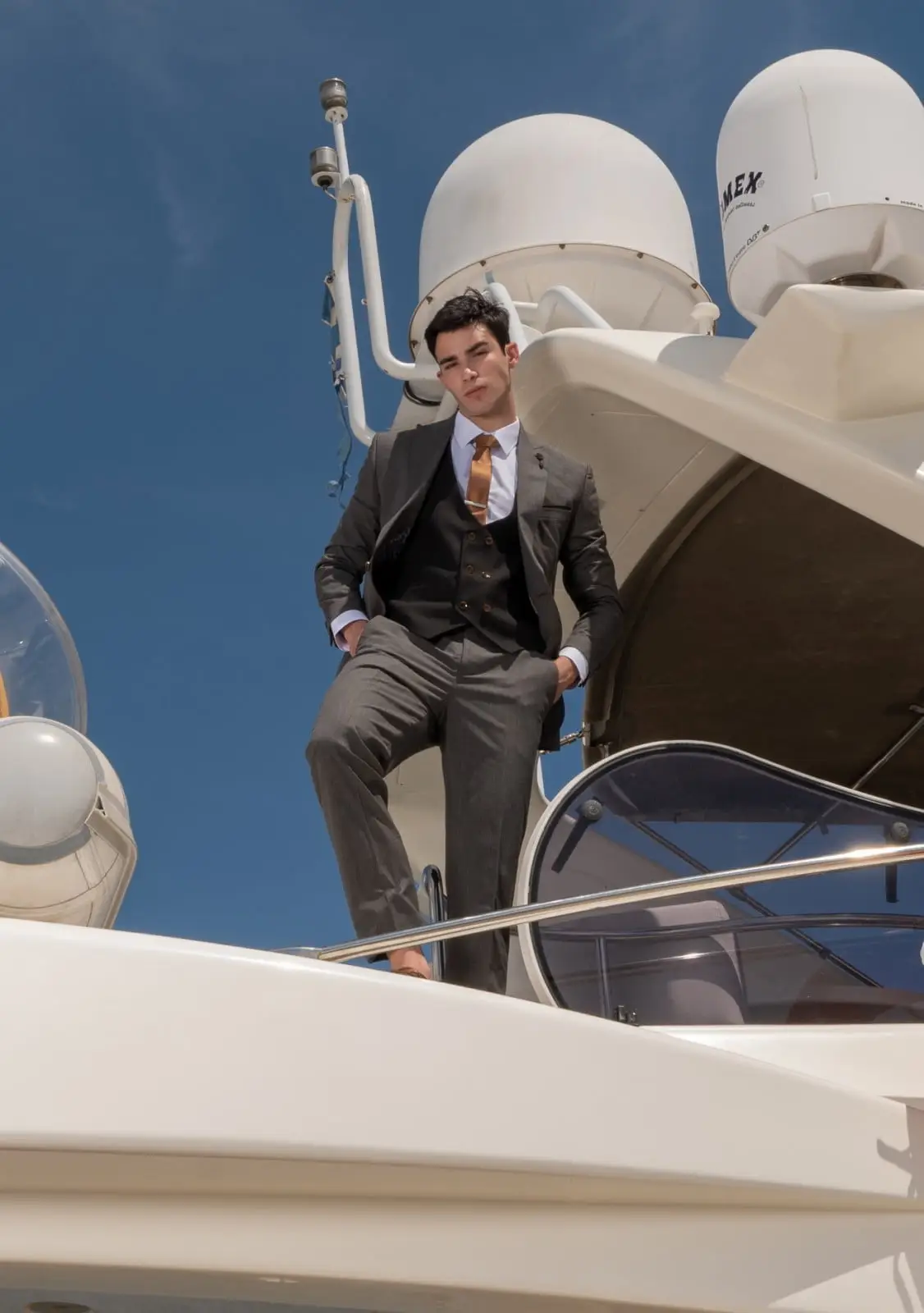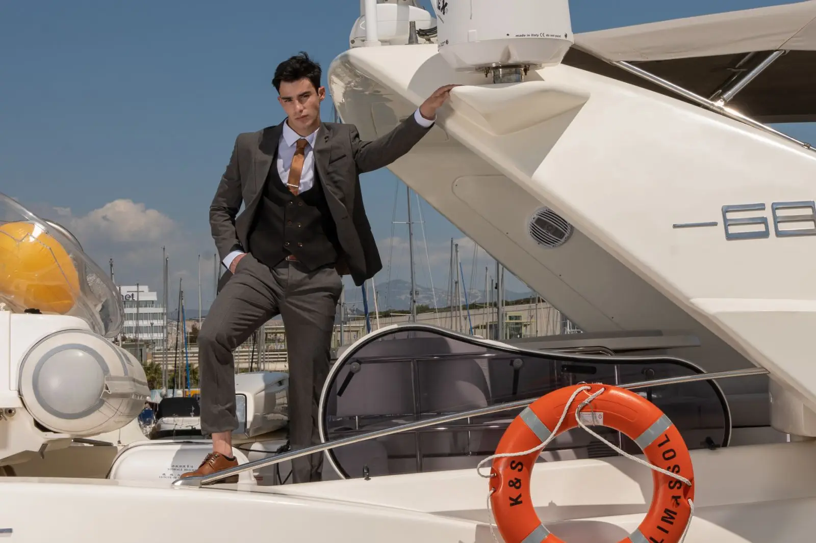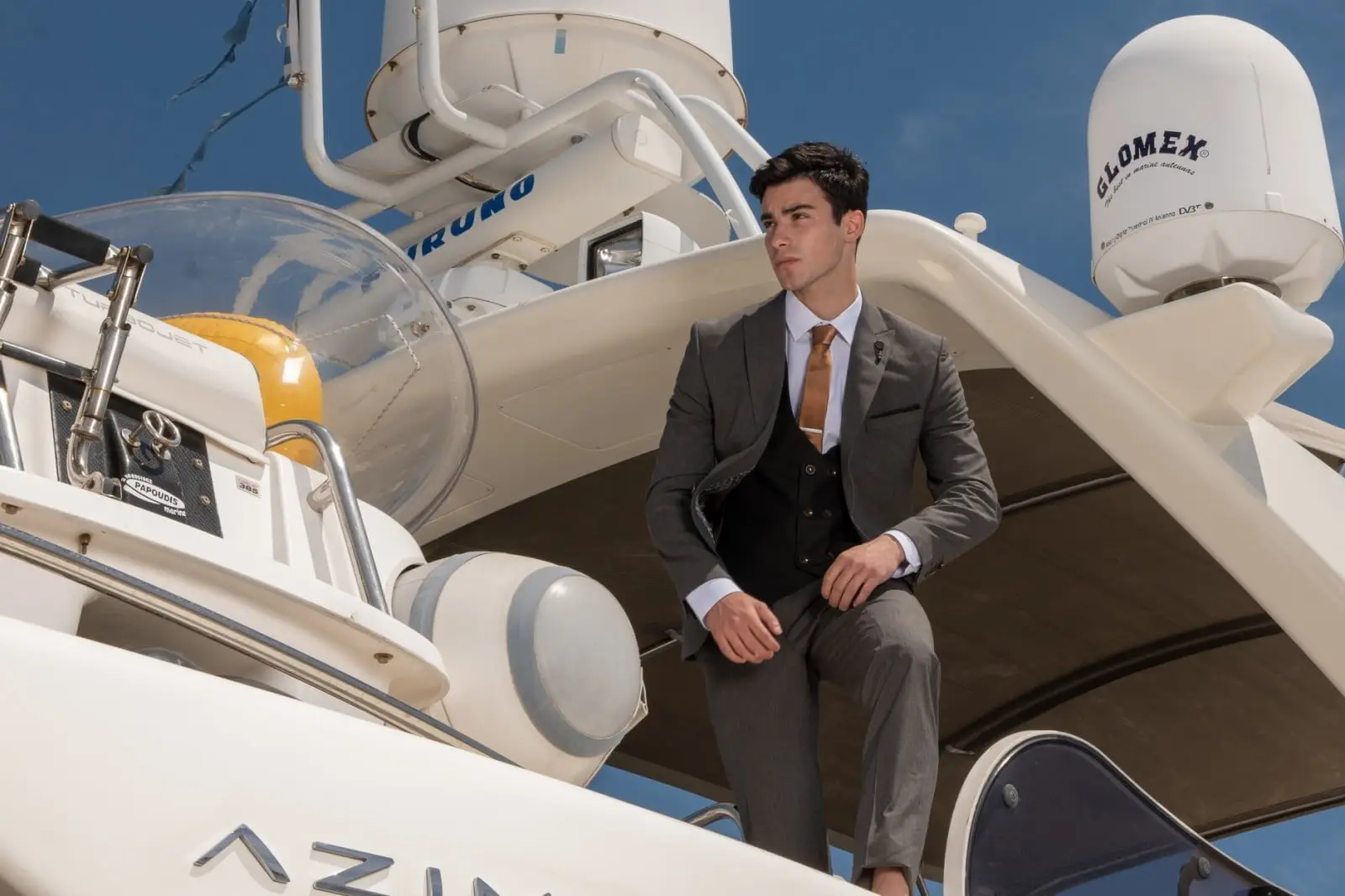 Το Κοστούμι συμπληρώνεται από μαύρο γιλέκο. Η γραμμή είναι μοντέρνα slim fit και η τιμή αφορά σακάκι, παντελόνι και γιλέκο.