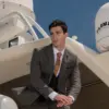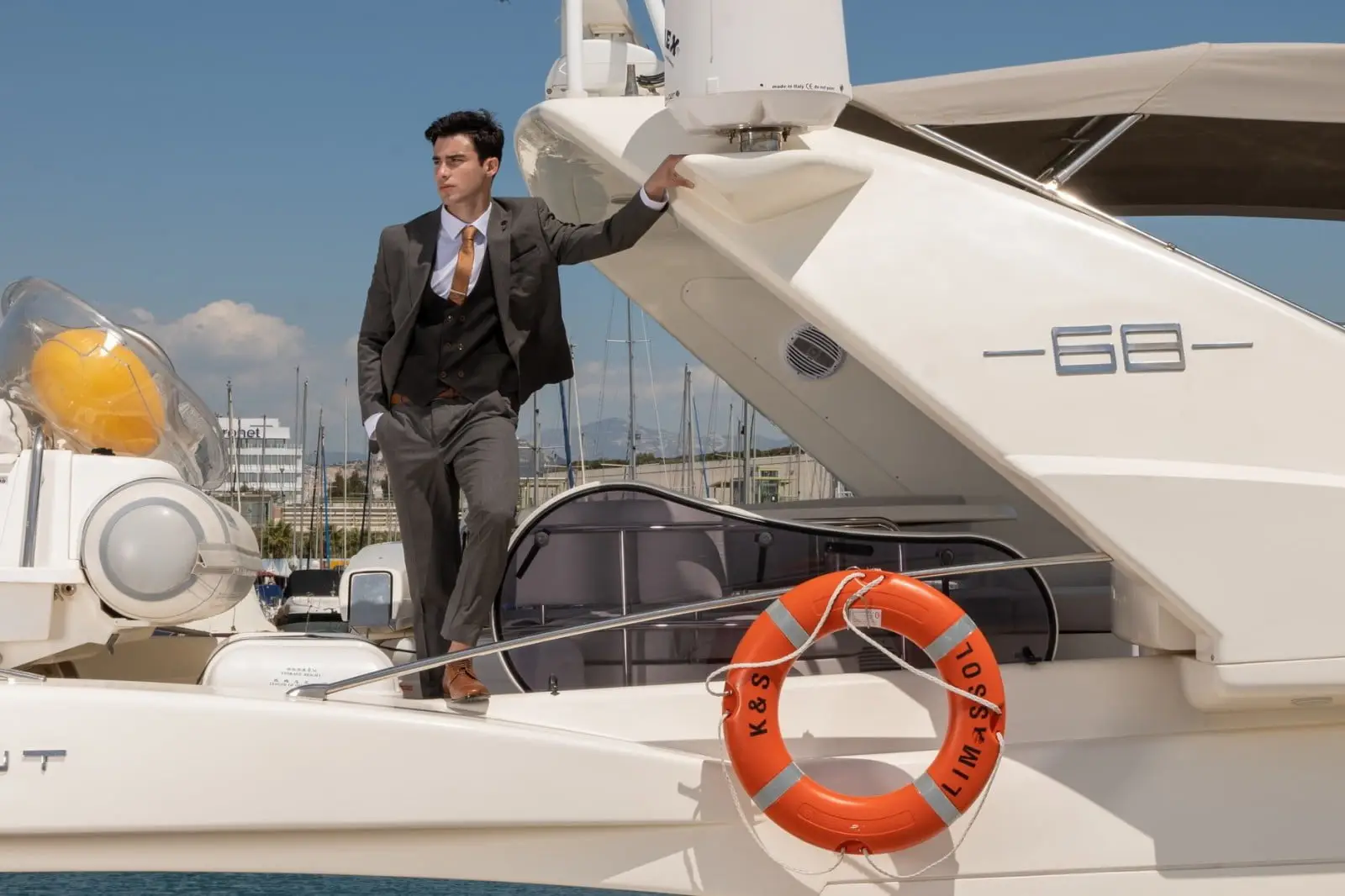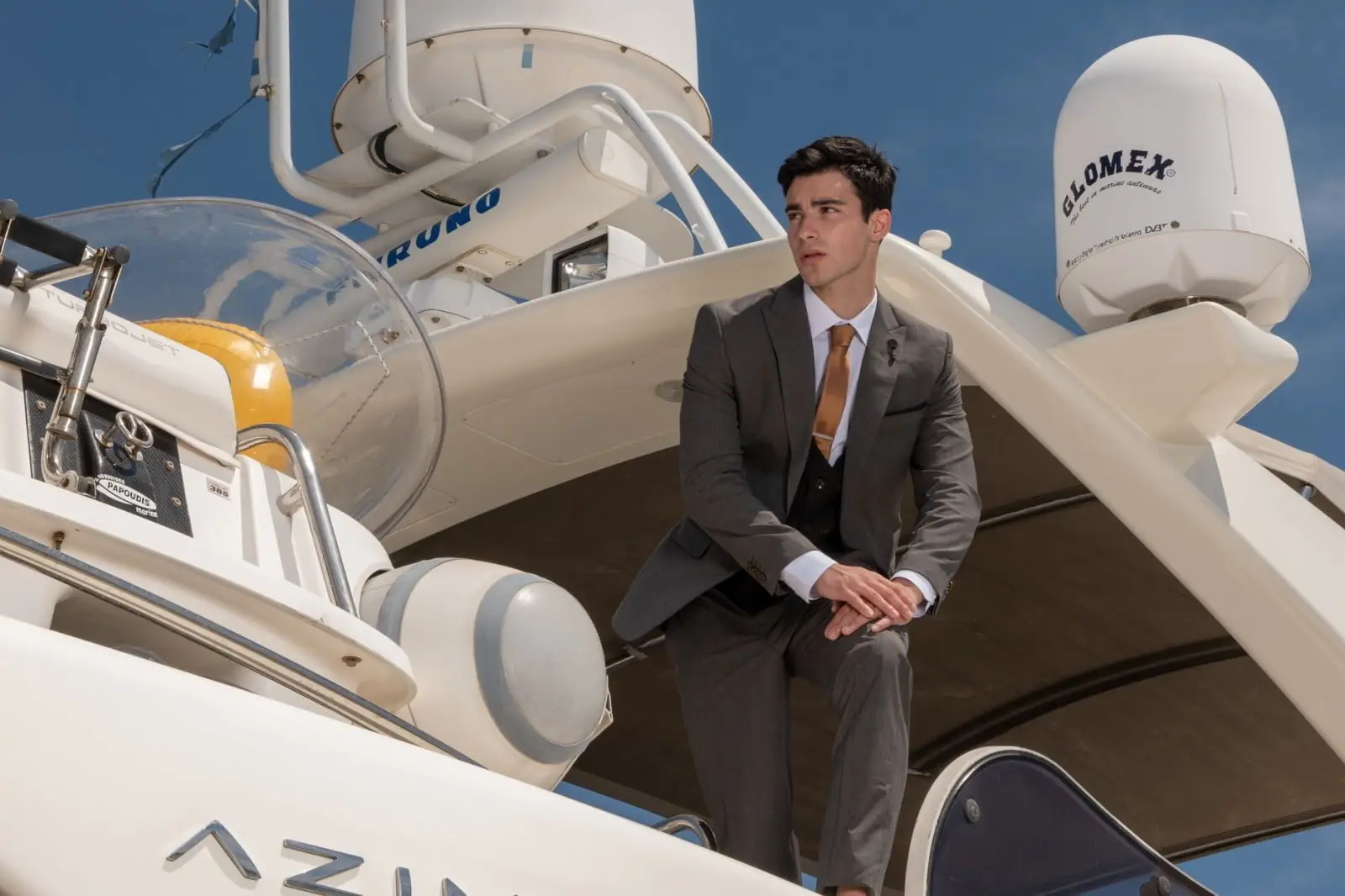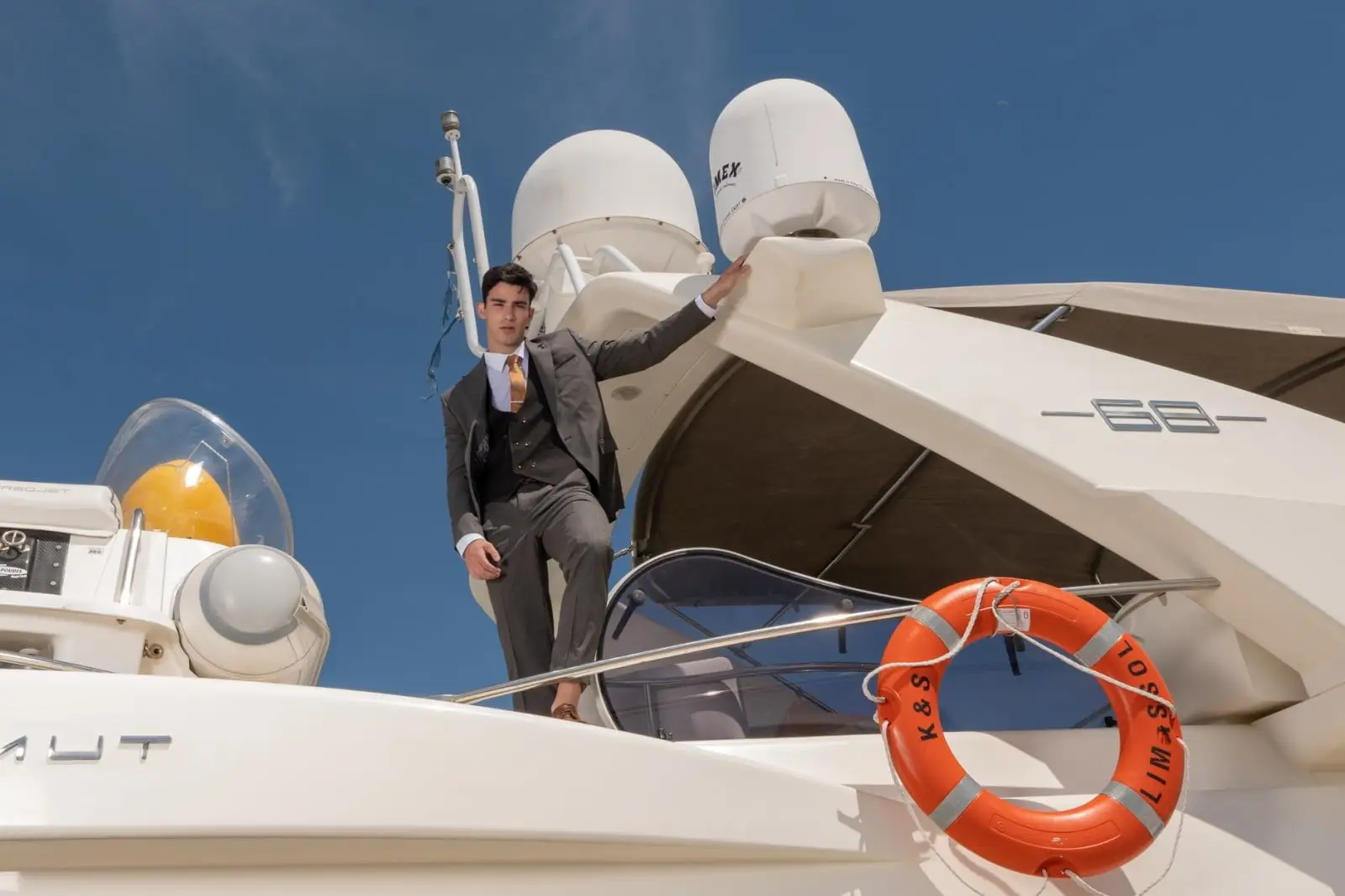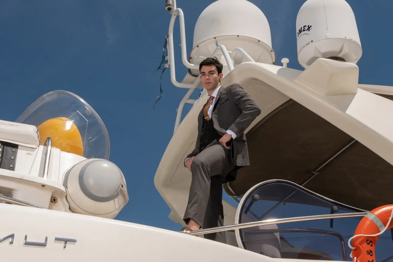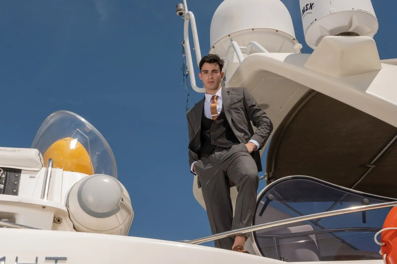 Το Κοστούμι συμπληρώνεται από μαύρο γιλέκο. Η γραμμή είναι μοντέρνα slim fit και η τιμή αφορά σακάκι, παντελόνι και γιλέκο.
